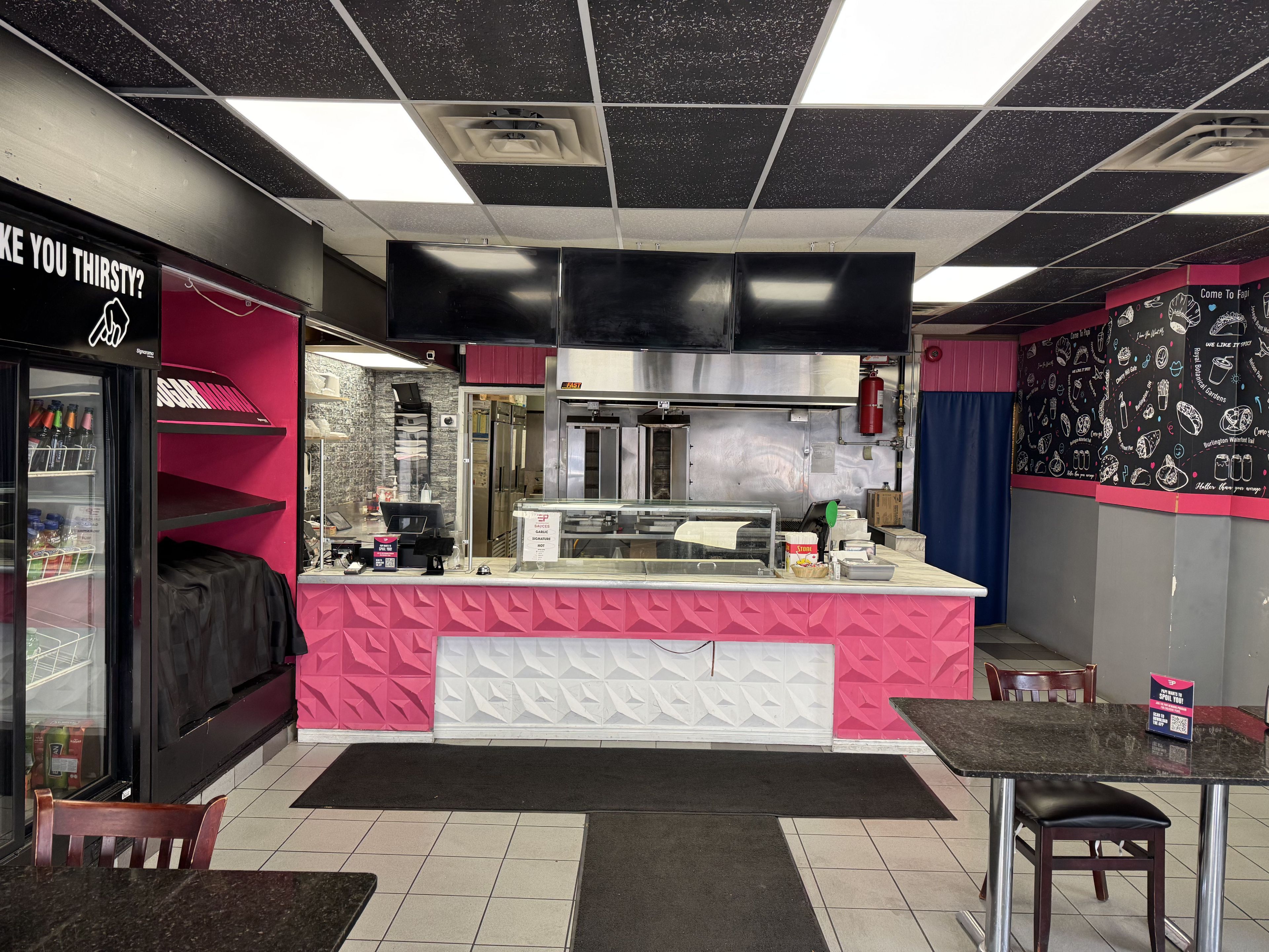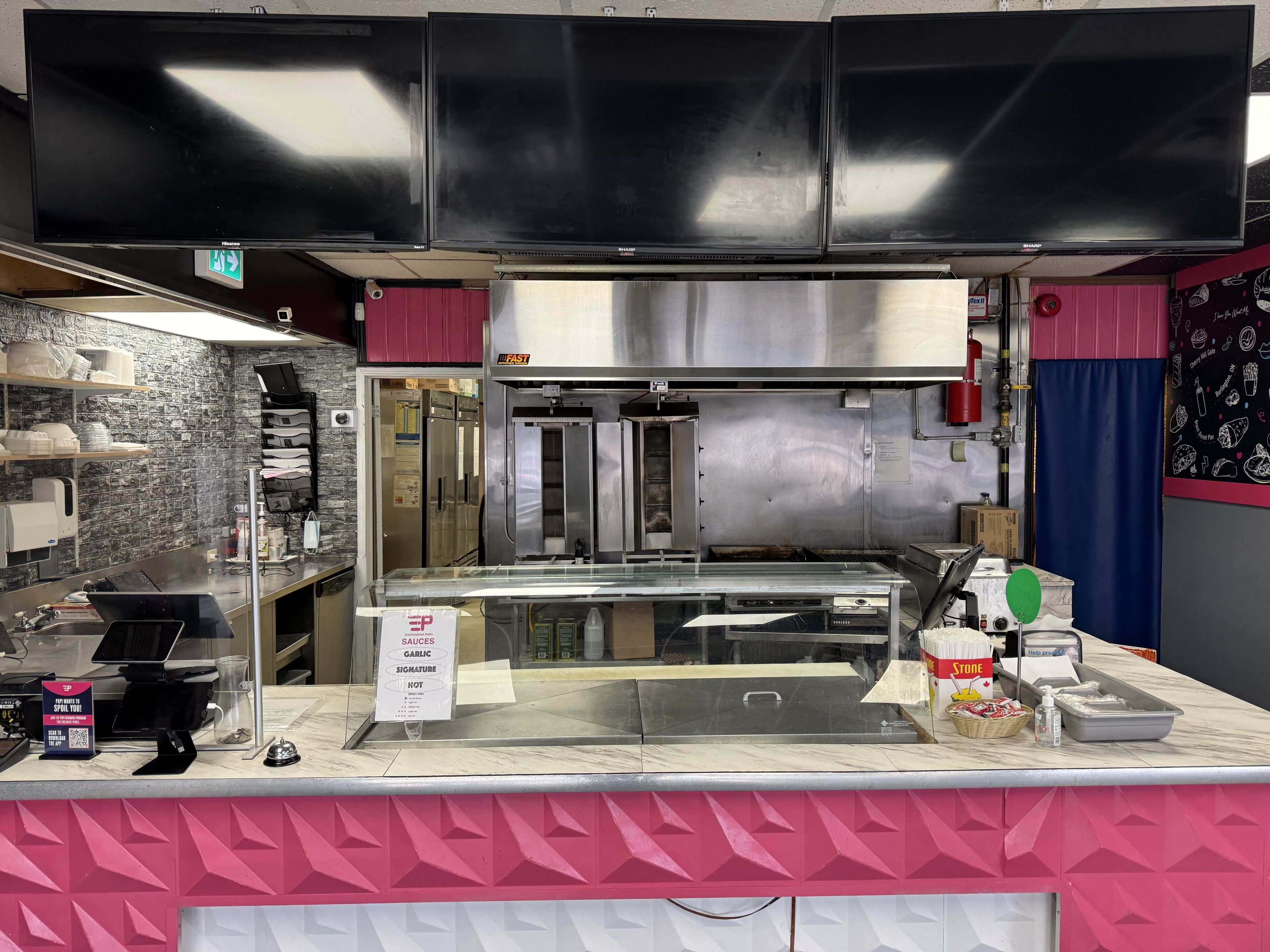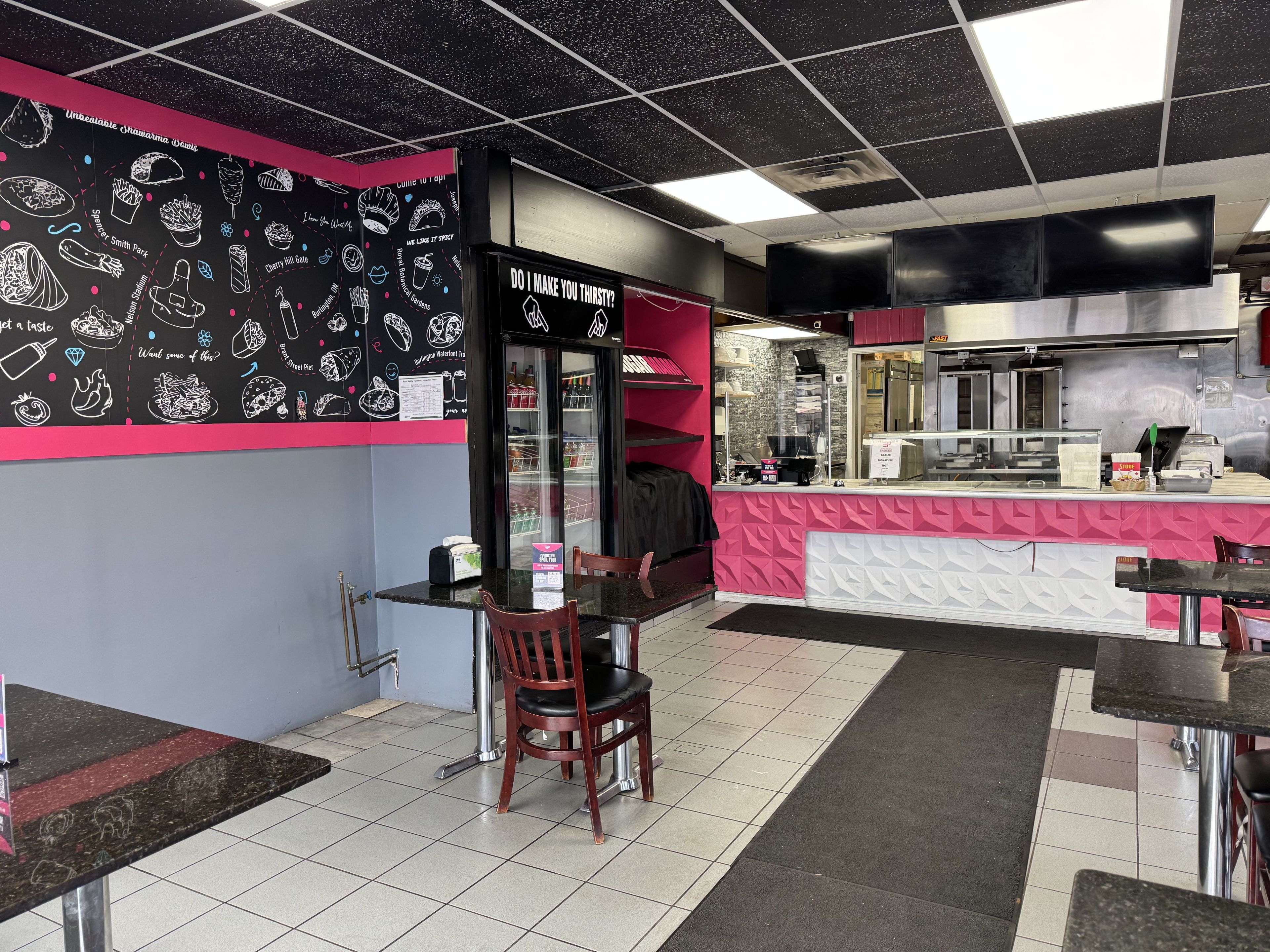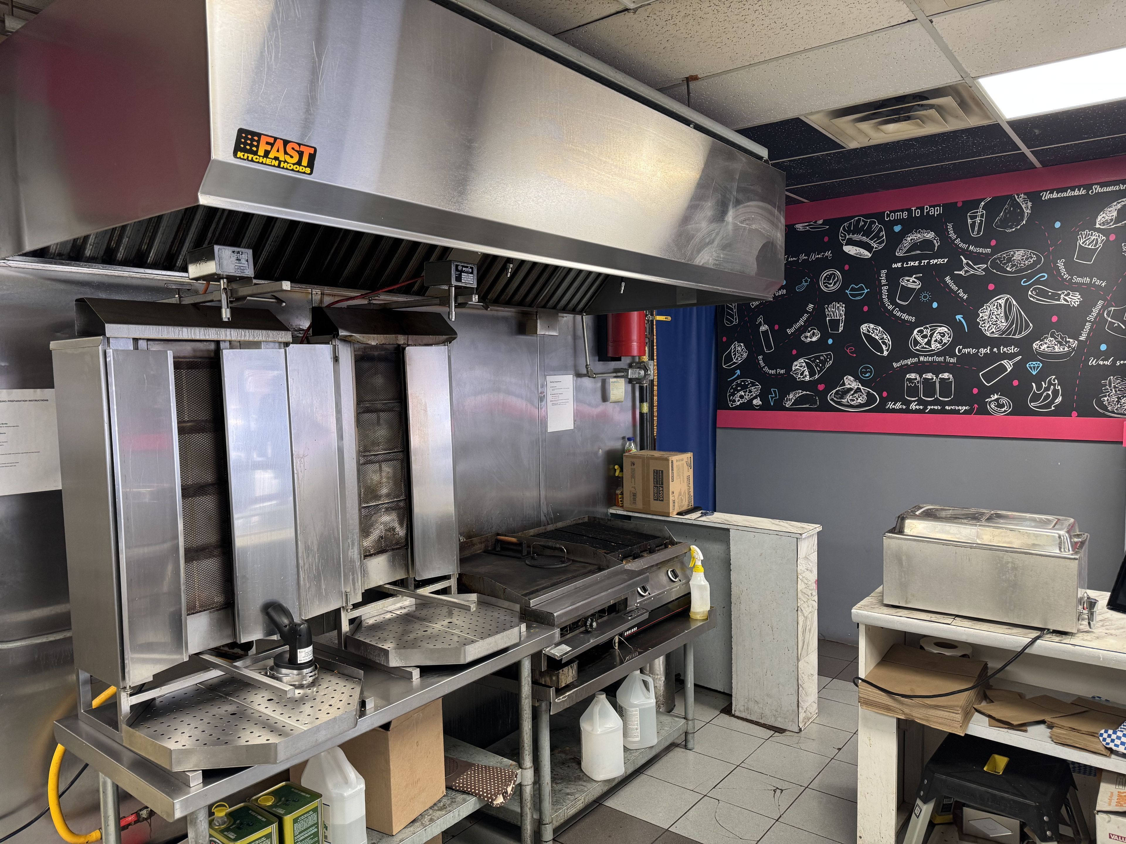 Turn-key shawarma takeout restaurant available in burlington. This 1161 square foot qsr is located in a high-traffic plaza at 495 walkers line in a busy south burlington plaza. Fully equipped with two exhaust hoods, two shawarma spits, gas grill, fryer, fridges, freezers, ready for seamless operation to an easy conversion to your concept. The space is clean, functional, and efficiently laid out-ideal for owner-operators or those looking to launch a new brand. Enjoy a strong 5 year lease term at just $4,500/month including tmi, offering excellent value in a sought after area. Surrounded by established retailers and steady neighbourhood demand, this location provides consistent exposure and customer flow. The seller is motivated and seeking a quick sale with a qualified buyer. An exceptional opportunity to step into burlington's thriving food scene with minimal downtime.