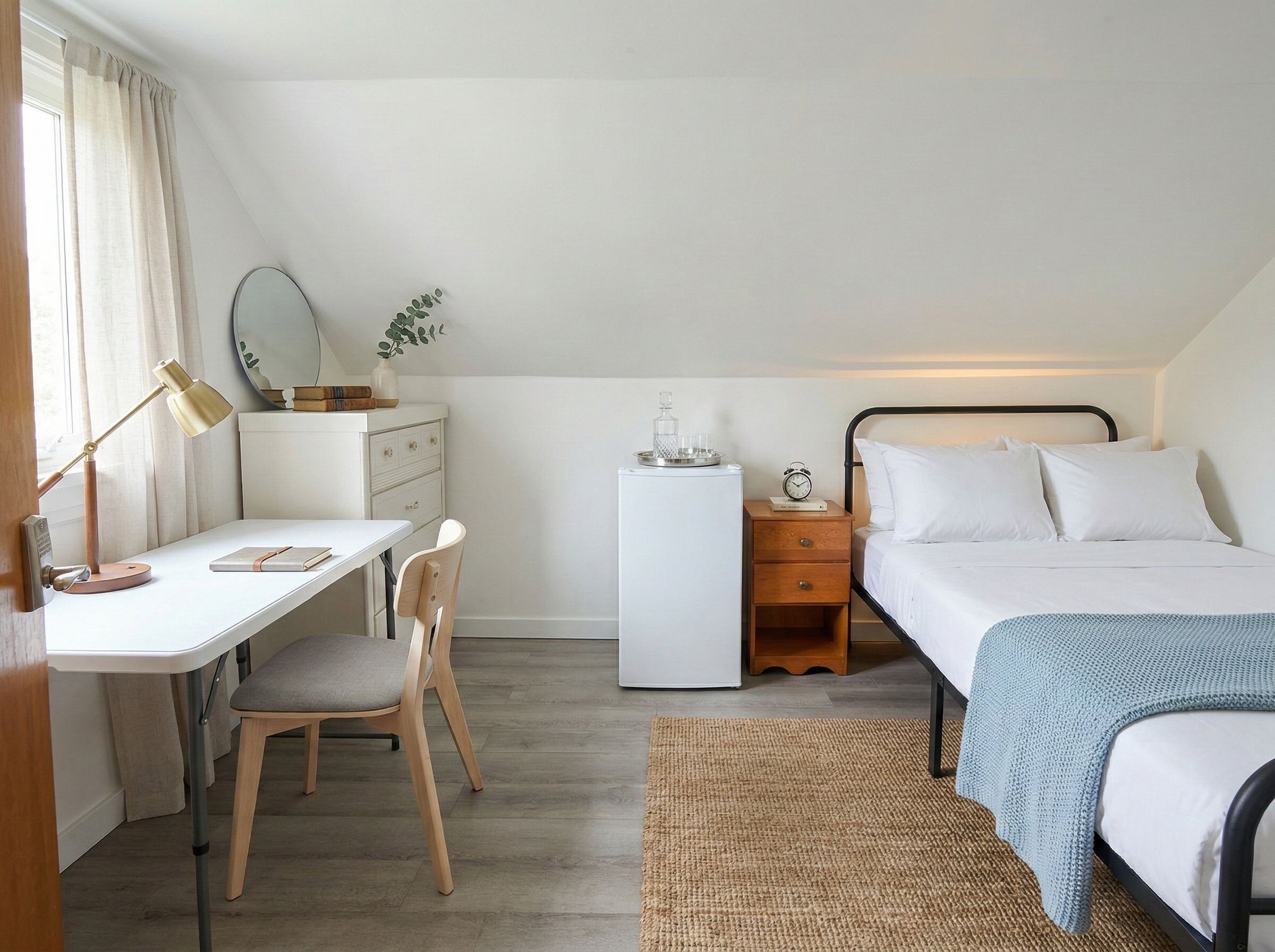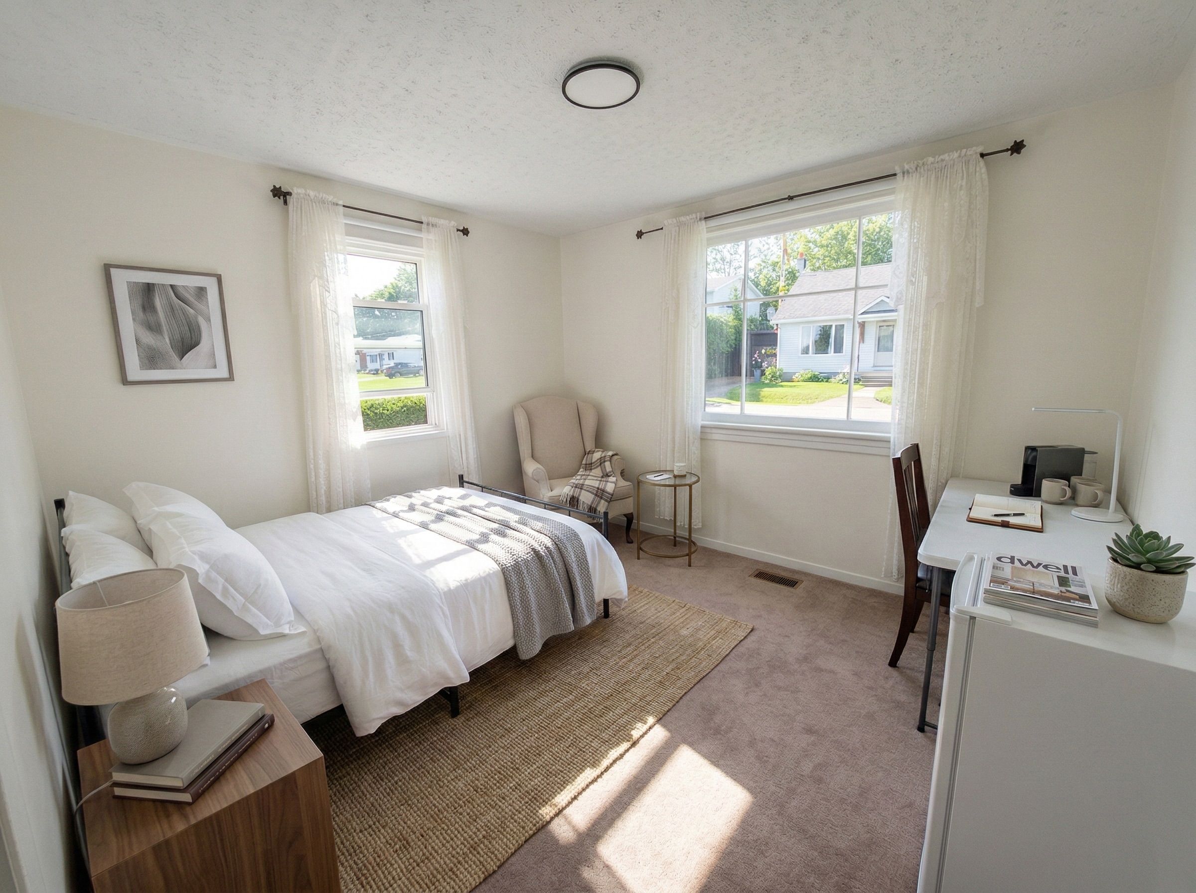 • Spacious yard with a fruit-bearing apple tree and garden area.