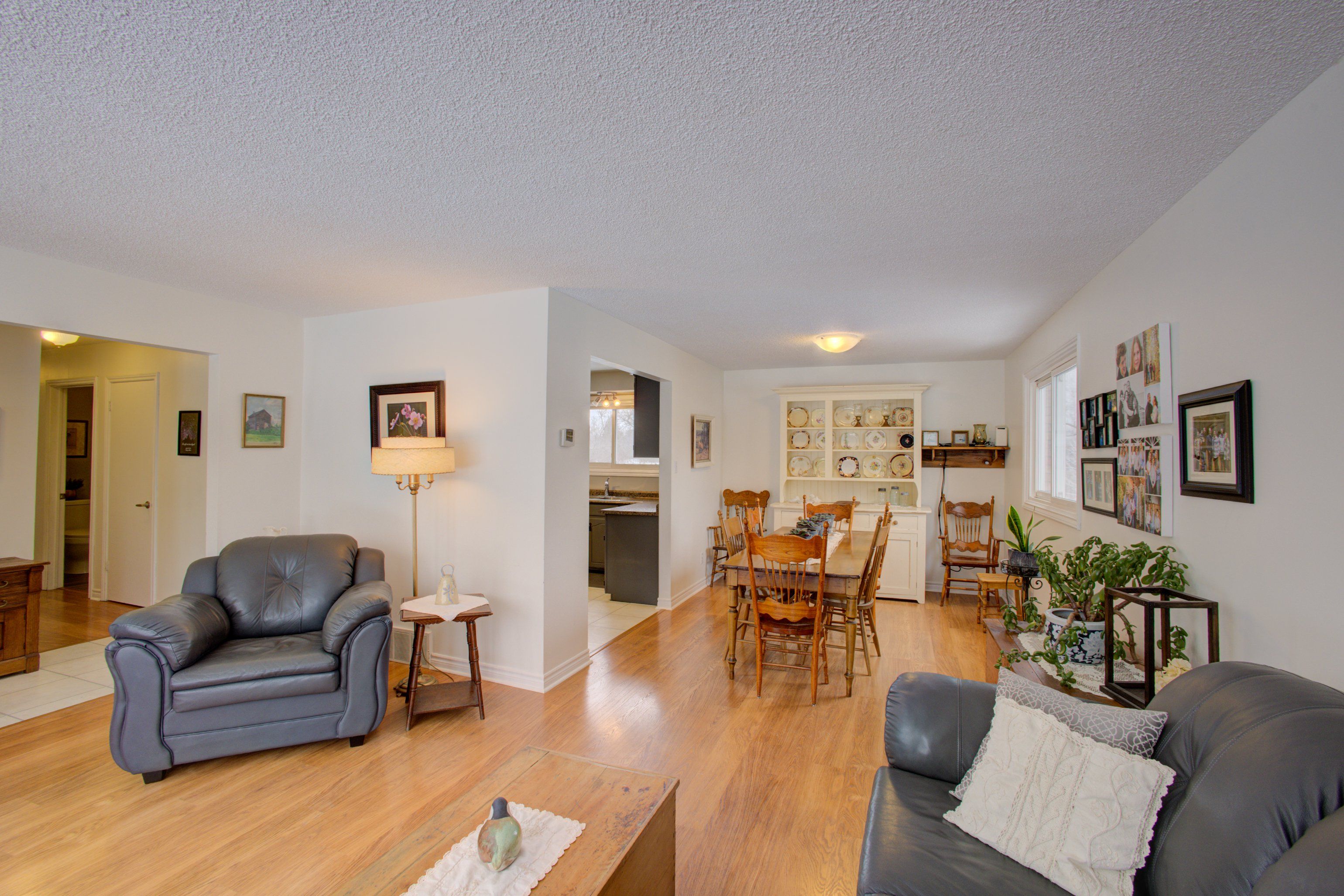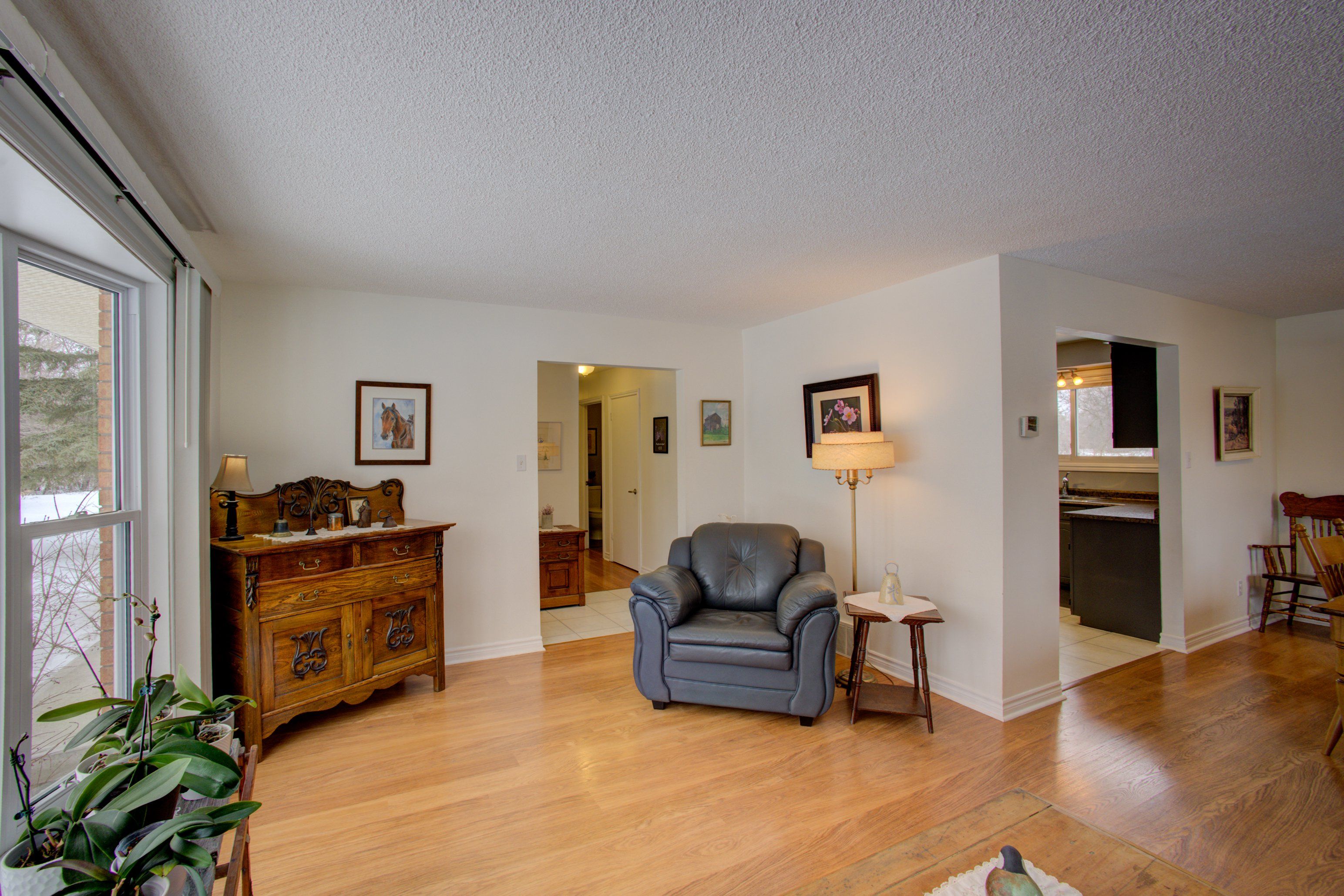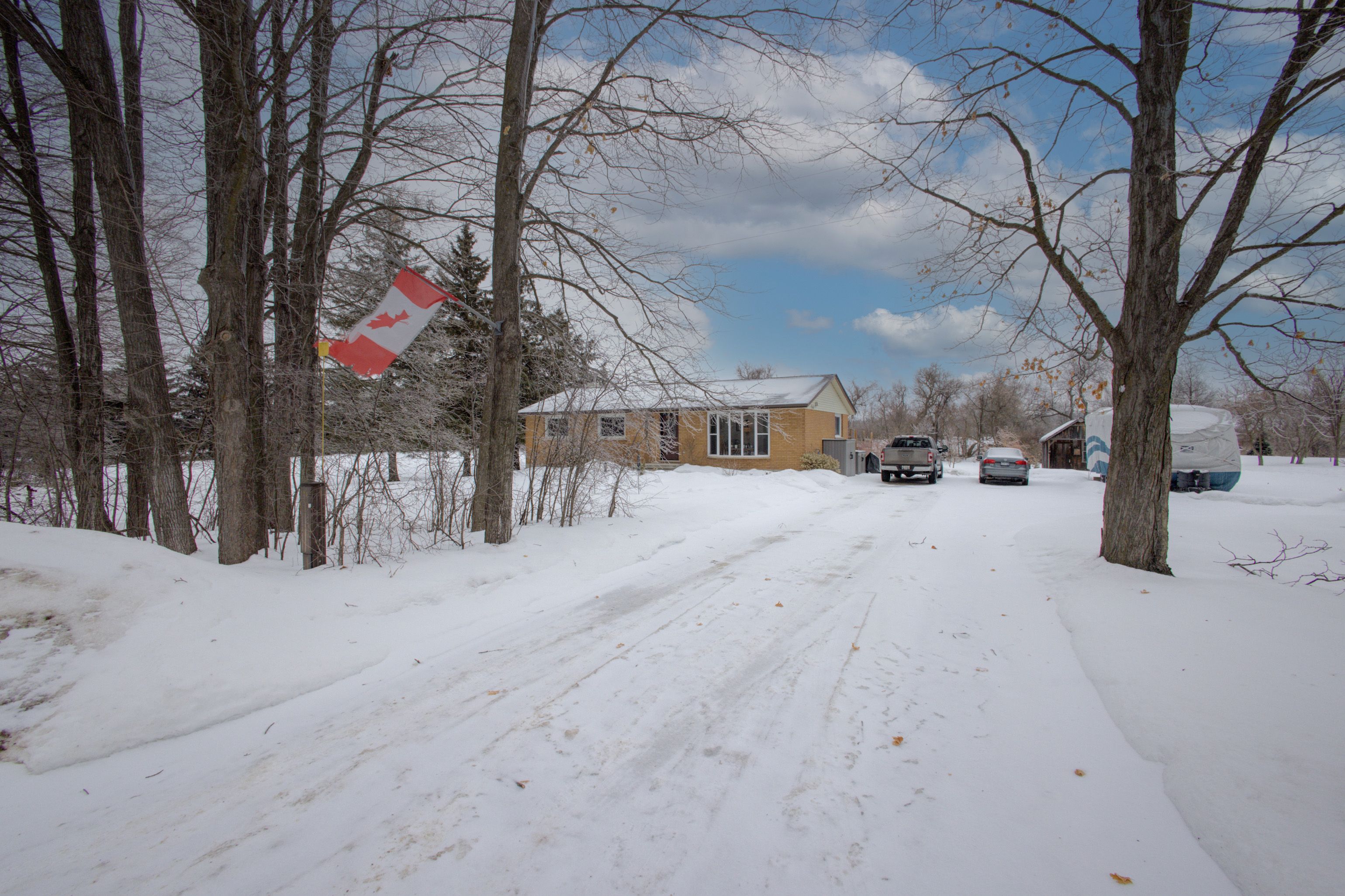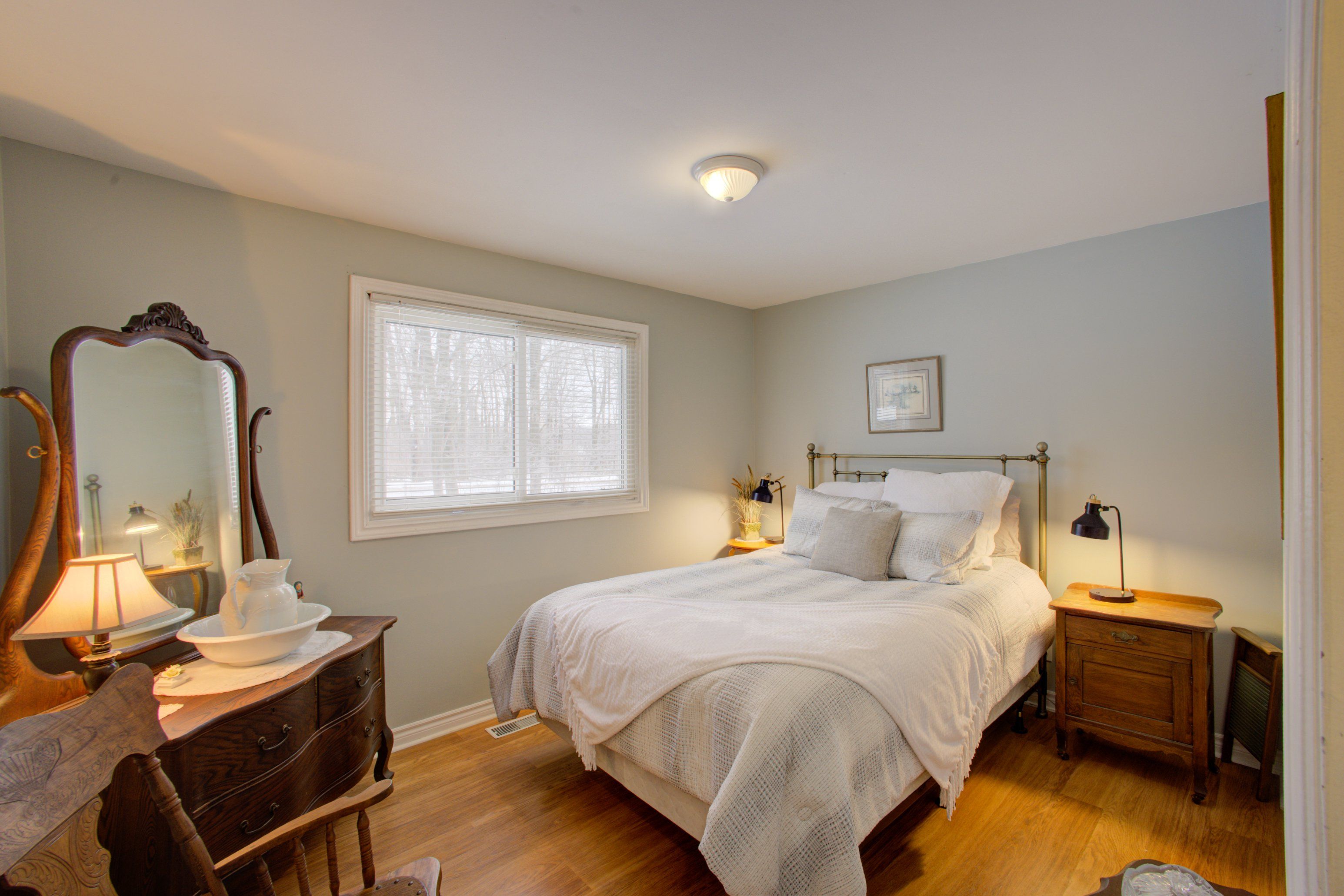 Nestled on a quiet dead-end road, this sturdy brick bungalow sits on a beautifully maintained half-acre lot-an ideal setting for a family or working professional seeking space and tranquility. Surrounded by landscaped grounds at both the front and back, the property offers a serene atmosphere with a walkout from the kitchen to a private patio, ample room for pets to roam, a large shed for storage or recreational equipment, and generous parking for guests and additional vehicles. From the moment you step through the front door, the home exudes warmth and comfort. The bright main living area features a large bay window, an open-concept dining space, and a spacious kitchen complete with built-in appliances, a pantry, and plenty of room to host family gatherings with ease. The primary bedroom is a peaceful retreat, highlighted by a beautifully renovated three-piece ensuite combined with convenient main-floor laundry, a large closet, and abundant natural light. Two additional well-sized bedrooms offer ample closet space and plenty of sunlight. The finished basement extends the living space with a large recreation or games room, a versatile storage area that could serve as a home office, as well as a utility room combined with another laundry area and workshop-providing flexibility to suit your lifestyle needs.