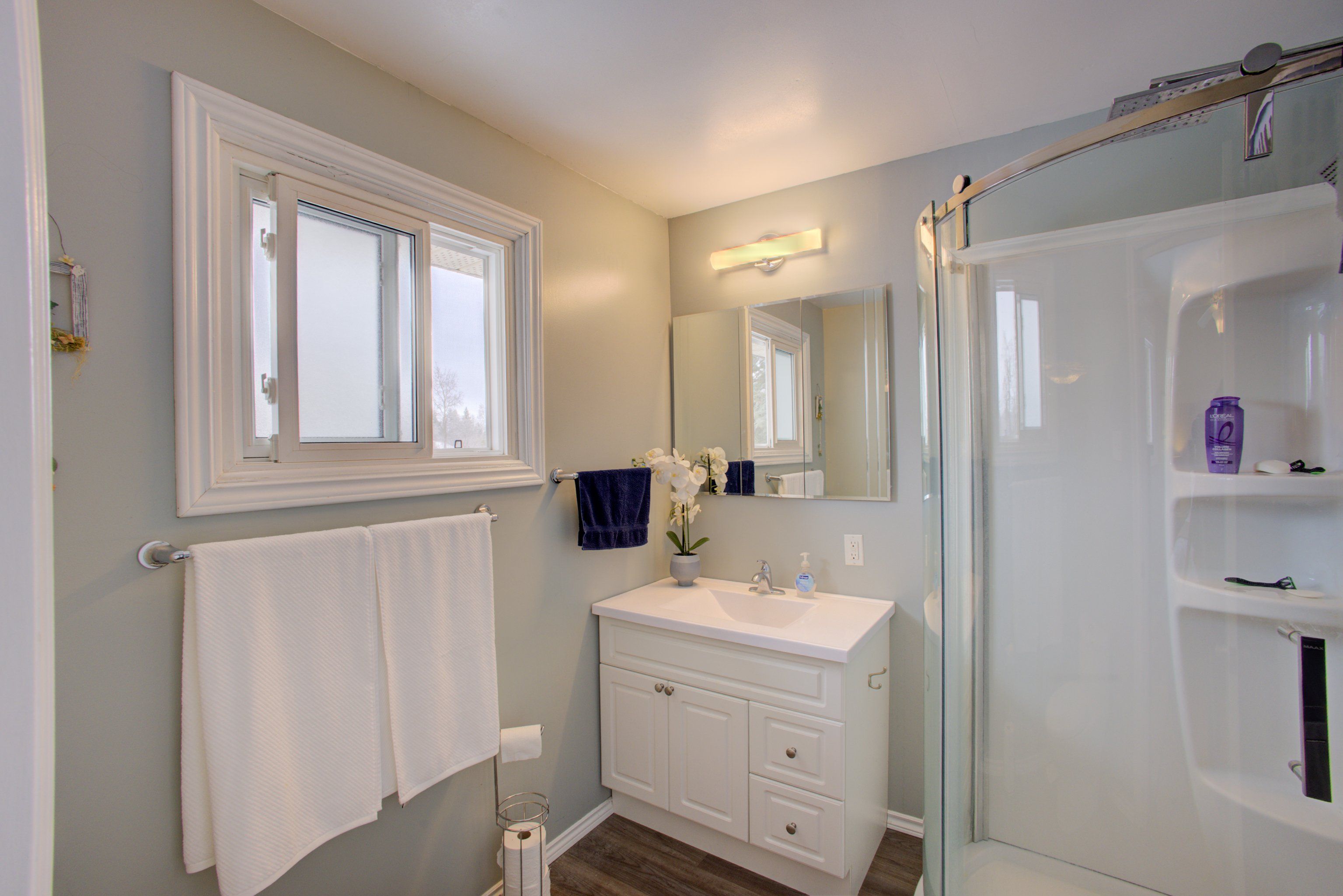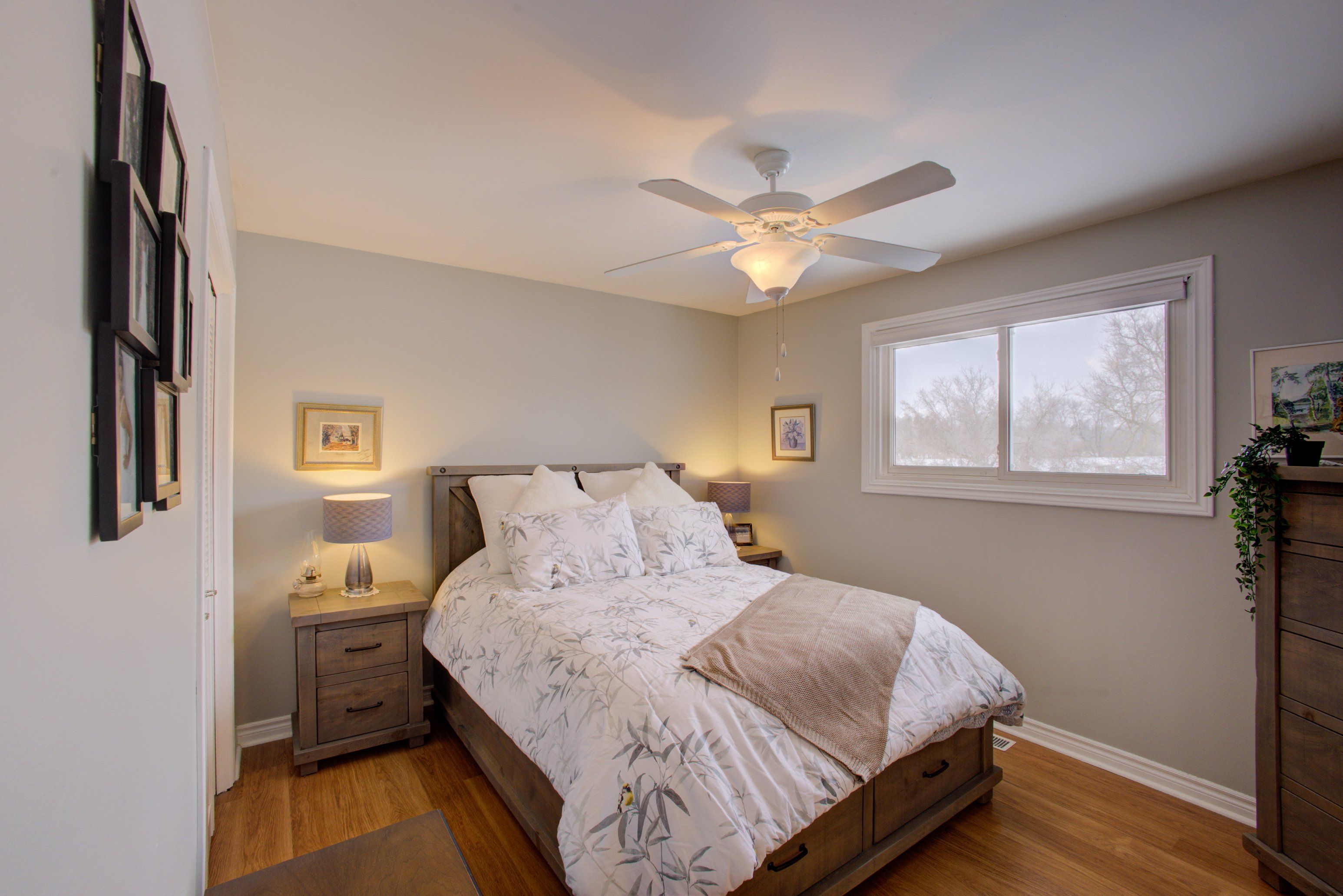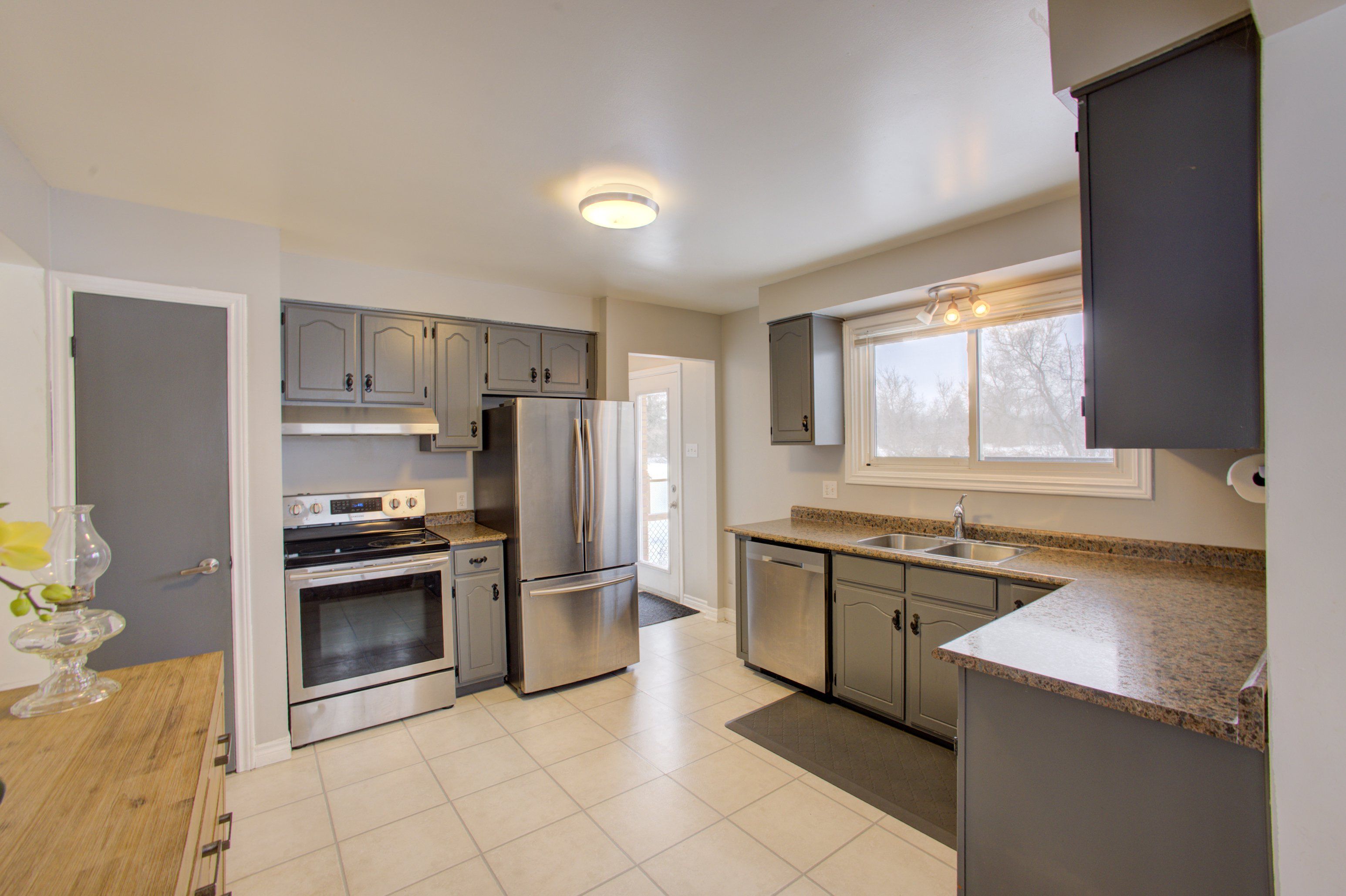 Nestled on a quiet dead-end road, this sturdy brick bungalow sits on a beautifully maintained half-acre lot-an ideal setting for a family or working professional seeking space and tranquility. Surrounded by landscaped grounds at both the front and back, the property offers a serene atmosphere with a walkout from the kitchen to a private patio, ample room for pets to roam, a large shed for storage or recreational equipment, and generous parking for guests and additional vehicles. From the moment you step through the front door, the home exudes warmth and comfort. The bright main living area features a large bay window, an open-concept dining space, and a spacious kitchen complete with built-in appliances, a pantry, and plenty of room to host family gatherings with ease. The primary bedroom is a peaceful retreat, highlighted by a beautifully renovated three-piece ensuite combined with convenient main-floor laundry, a large closet, and abundant natural light. Two additional well-sized bedrooms offer ample closet space and plenty of sunlight. The finished basement extends the living space with a large recreation or games room, a versatile storage area that could serve as a home office, as well as a utility room combined with another laundry area and workshop-providing flexibility to suit your lifestyle needs.