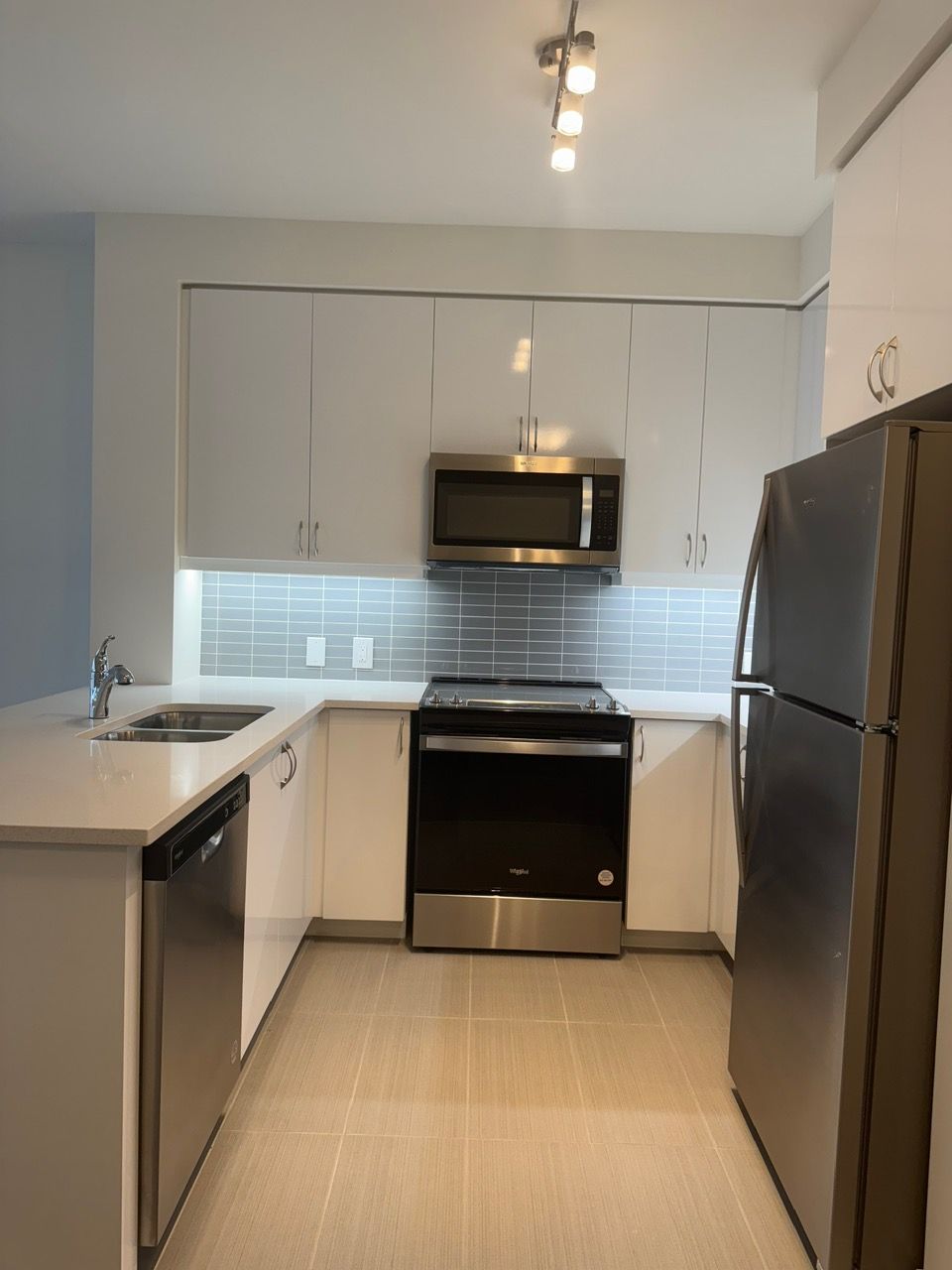 • Modern kitchen featuring quartz countertops and stainless steel appliances.