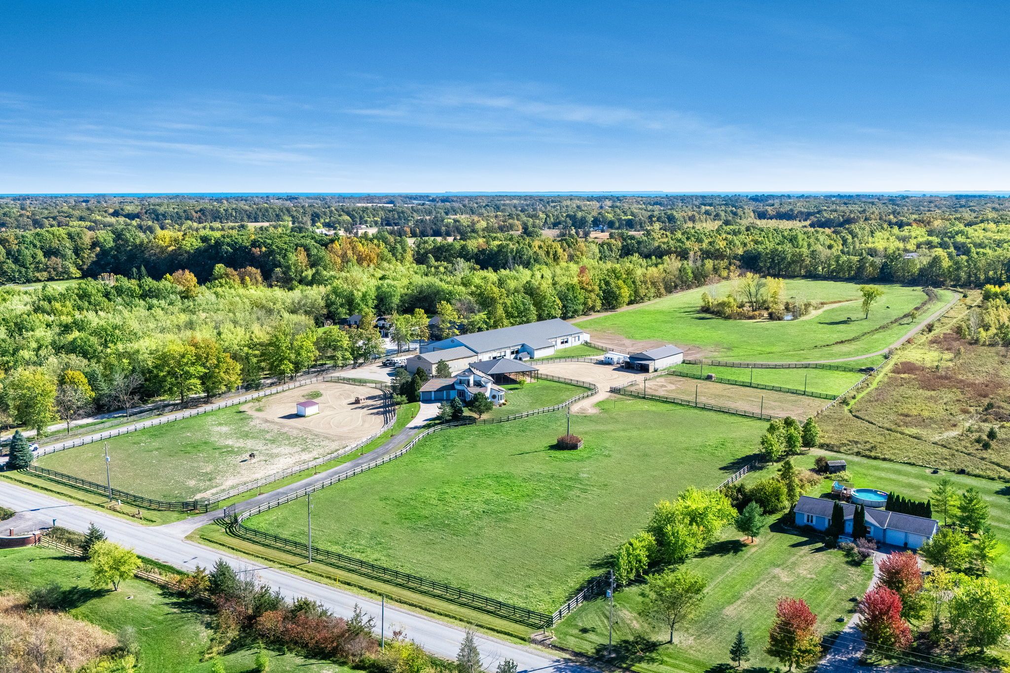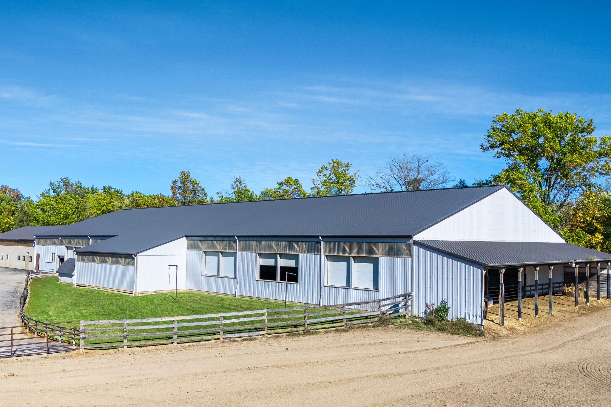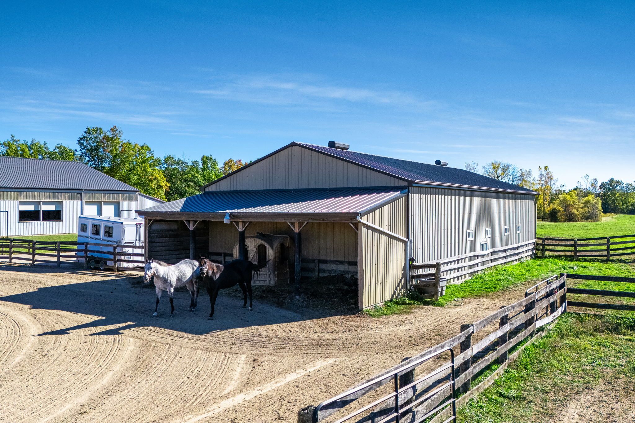A unique modern ranch on nearly 20 acres with premier equestrian facilities. Royal run ranch features an 80 x 200 indoor arena with roll up doors for natural light and air flow, heated 12-stall barn with tack room and automatic waterers, hay barn, 6 fenced paddocks, 2 covered horse shelters, and insulated covered horse walker. Arena offers east-side parking for trailers and equipment. The home blends modern style with farmhouse charm, offering formal living/dining, open family room with fireplace, elevated kitchen overlooking back paddocks, and 4 fireplaces total. Primary suite on its own floor with walk-in closet, jacuzzi tub, and separate shower. Lower level includes gym, party room with wet bar, bonus rooms, and tanning room. Pond with finished track, mature trees, privacy, and scenic views complete this rare estate.