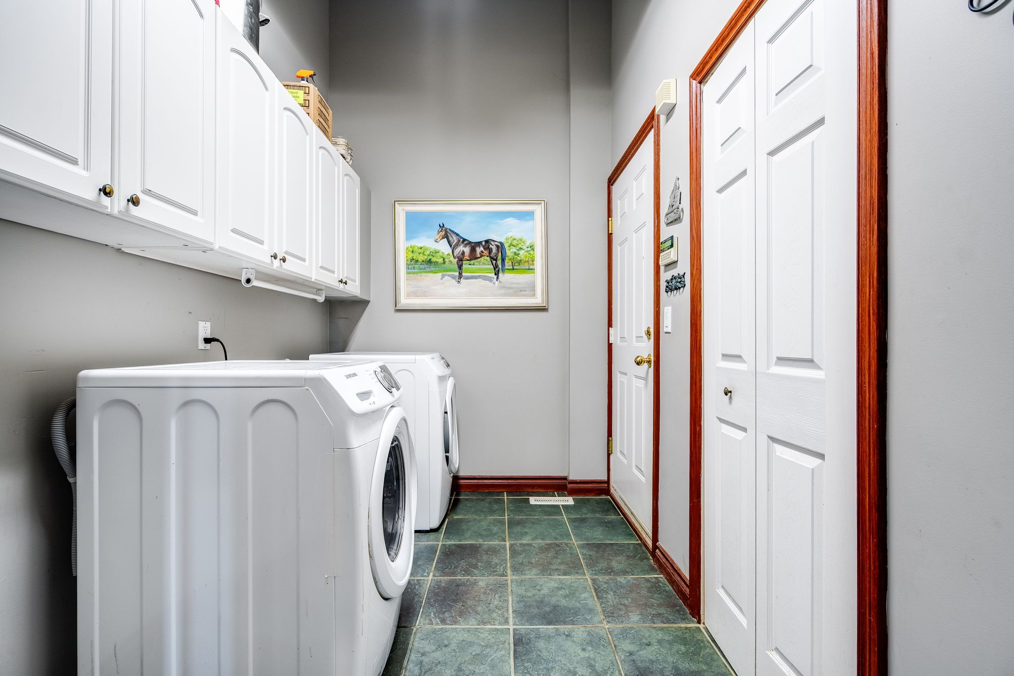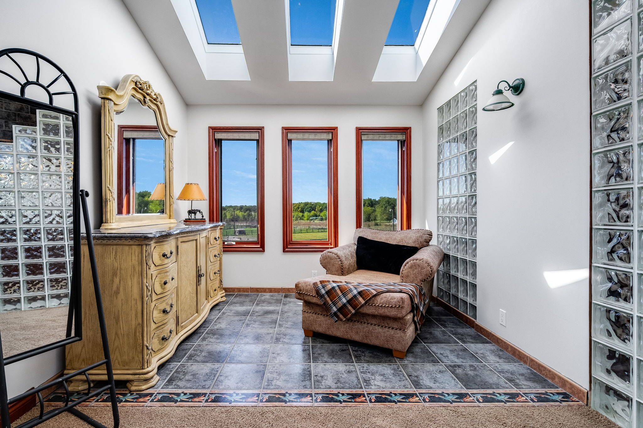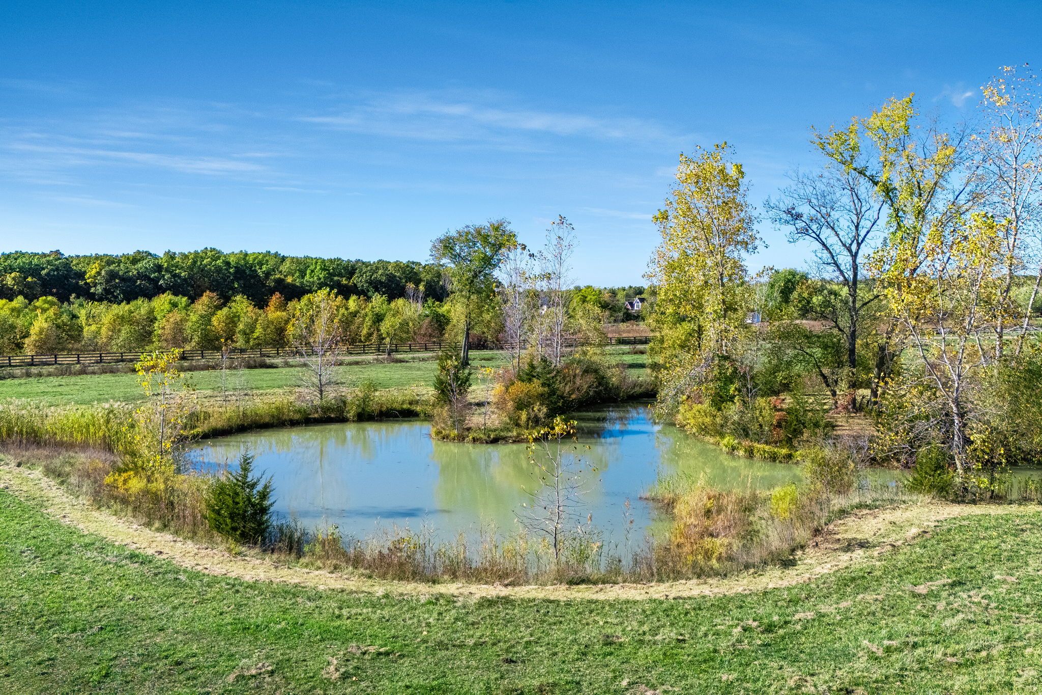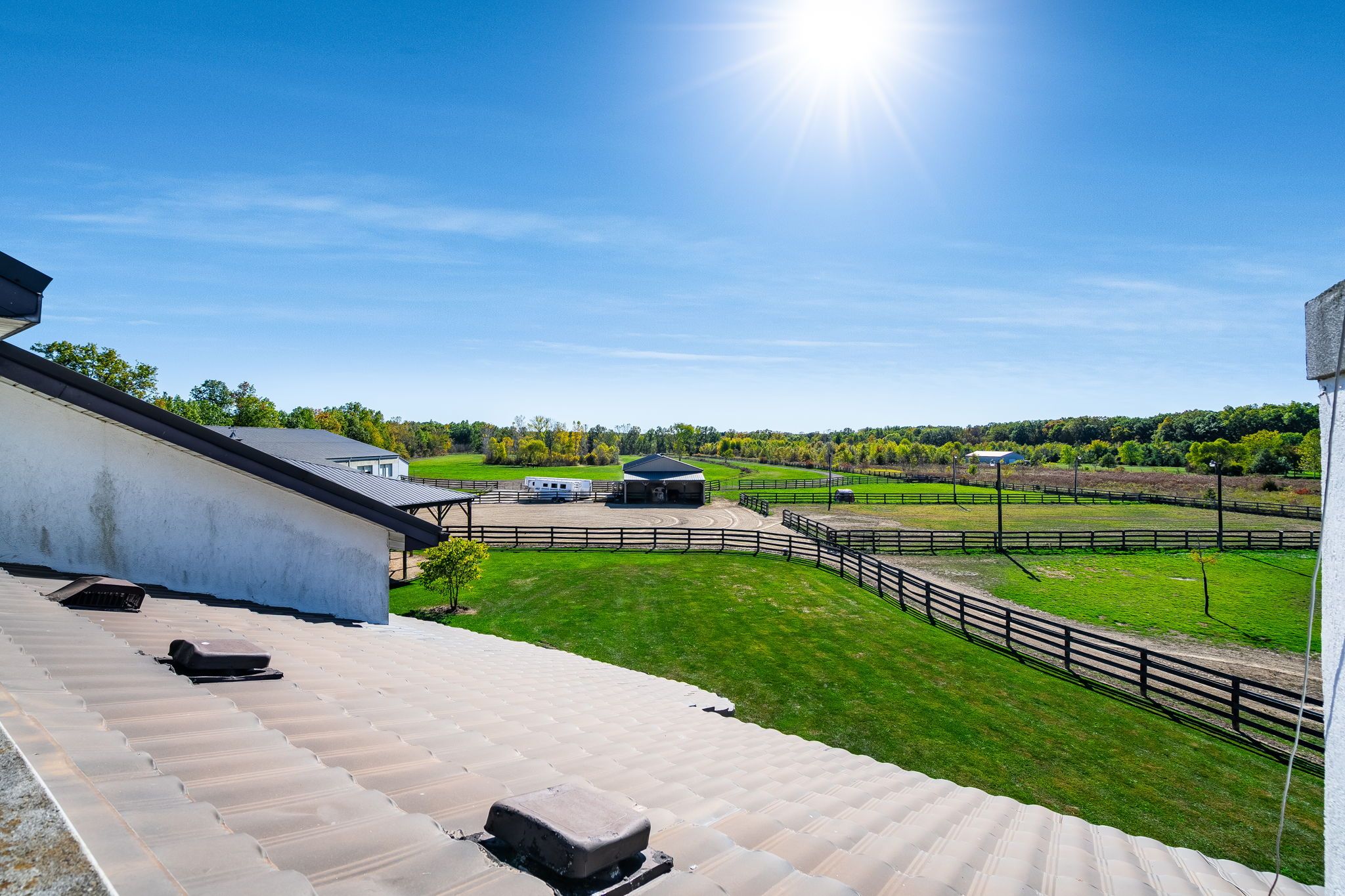 A unique modern ranch on nearly 20 acres with premier equestrian facilities. Royal run ranch features an 80 x 200 indoor arena with roll up doors for natural light and air flow, heated 12-stall barn with tack room and automatic waterers, hay barn, 6 fenced paddocks, 2 covered horse shelters, and insulated covered horse walker. Arena offers east-side parking for trailers and equipment. The home blends modern style with farmhouse charm, offering formal living/dining, open family room with fireplace, elevated kitchen overlooking back paddocks, and 4 fireplaces total. Primary suite on its own floor with walk-in closet, jacuzzi tub, and separate shower. Lower level includes gym, party room with wet bar, bonus rooms, and tanning room. Pond with finished track, mature trees, privacy, and scenic views complete this rare estate.