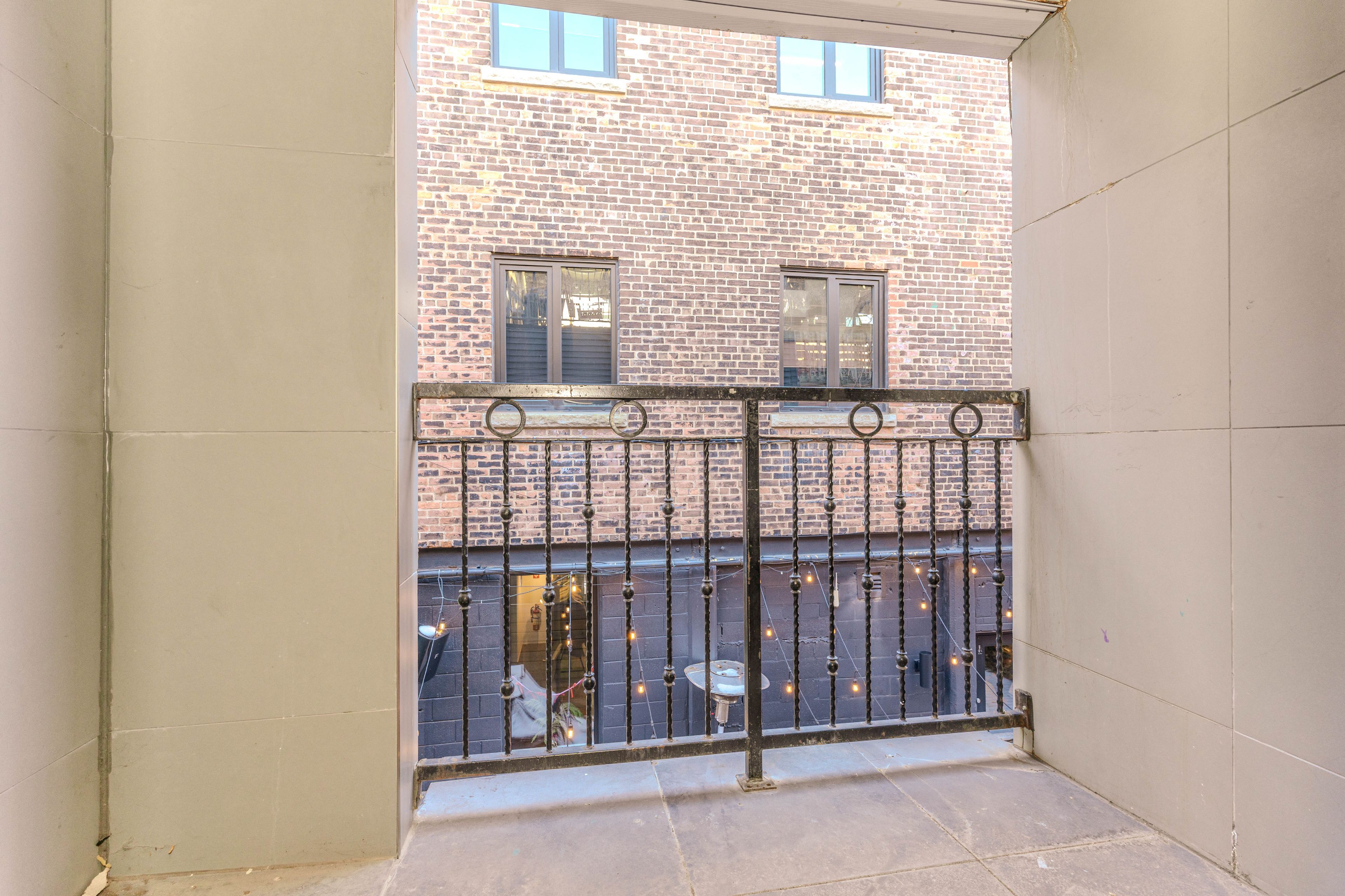 • Private outdoor balcony with a view of the patio.