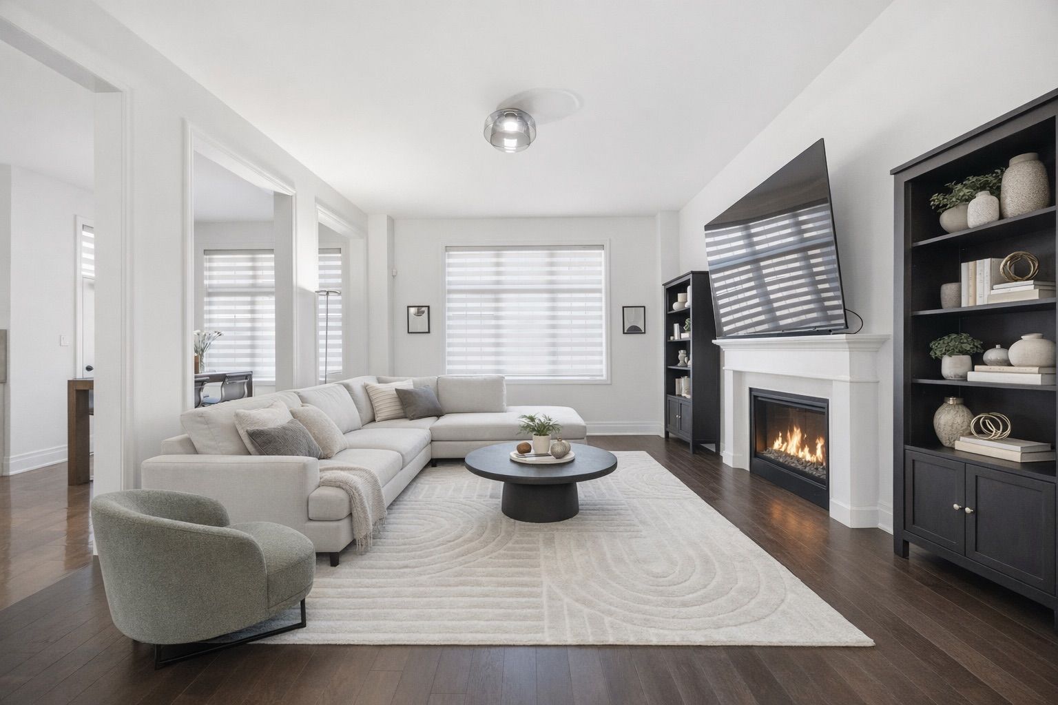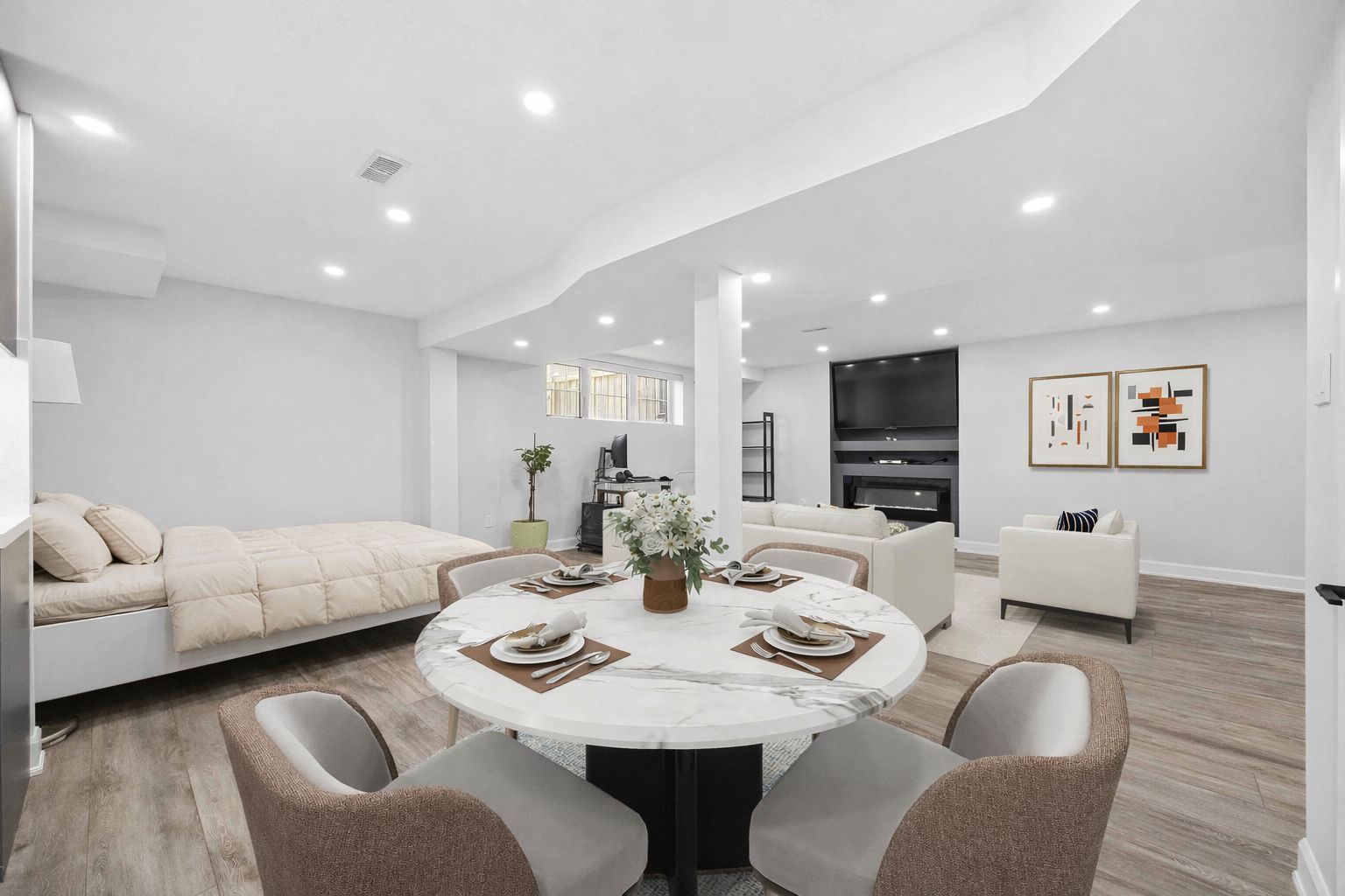 • Bright, open-concept living/dining area with inviting gas fireplace.