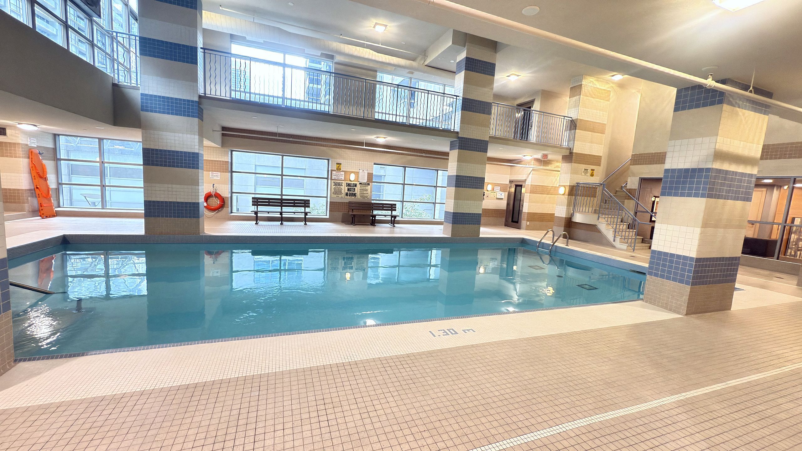 • Building features include a gym, indoor pool, and 24-hour security.