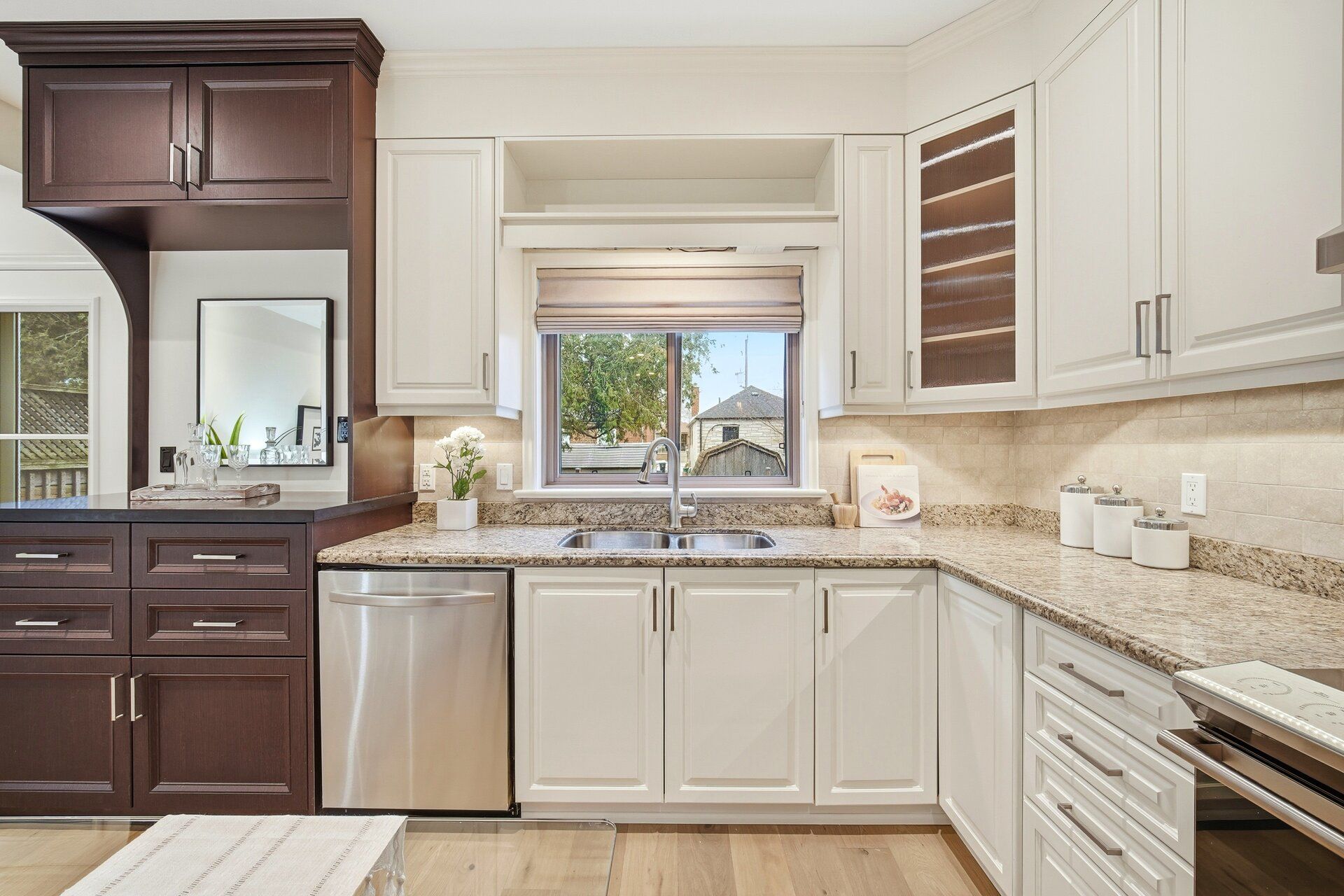 • Modern kitchen and family room open to a landscaped backyard with deck.