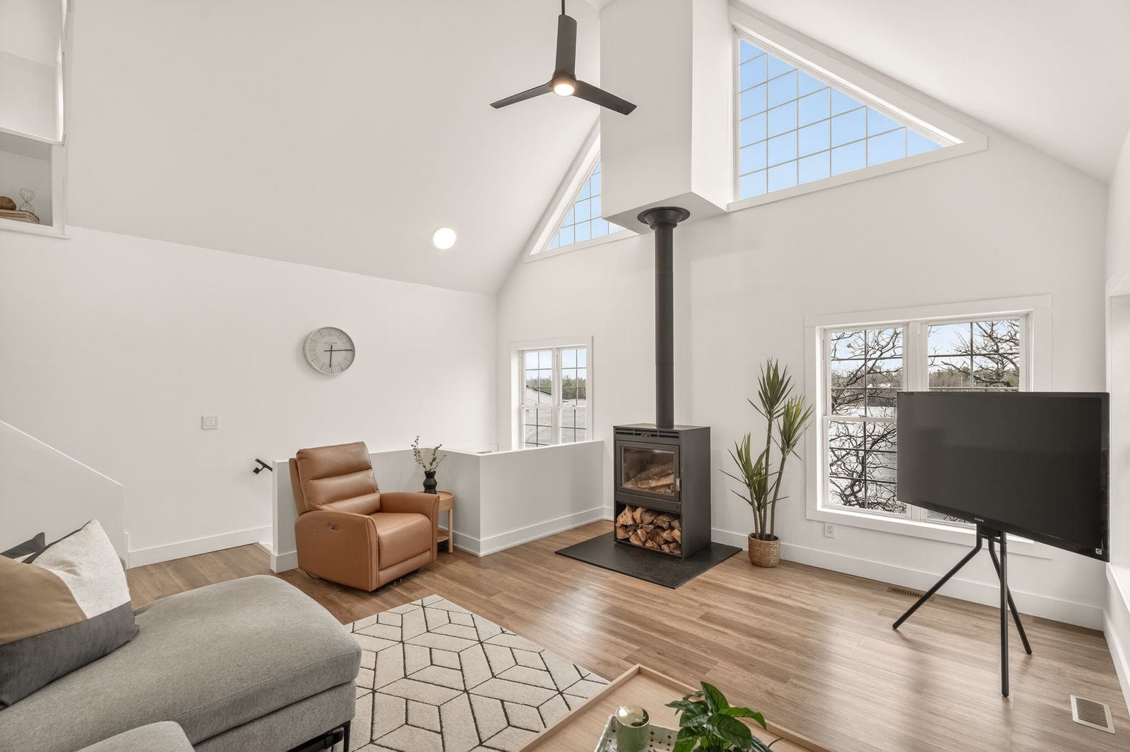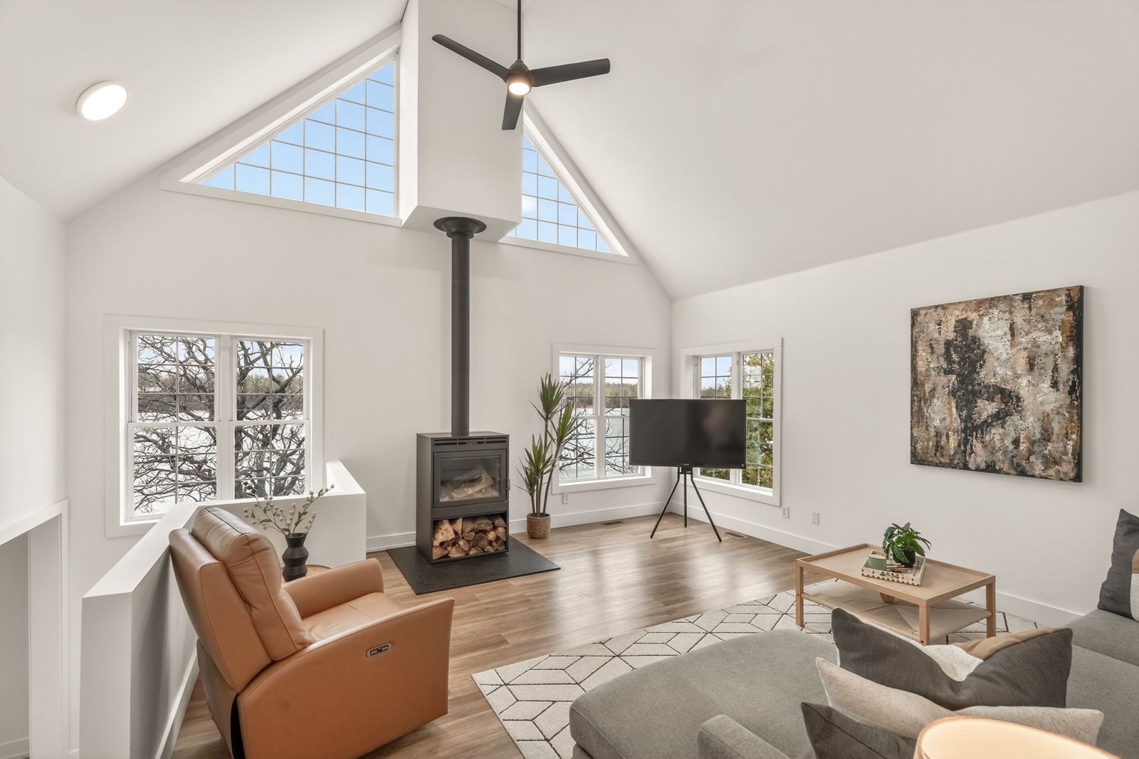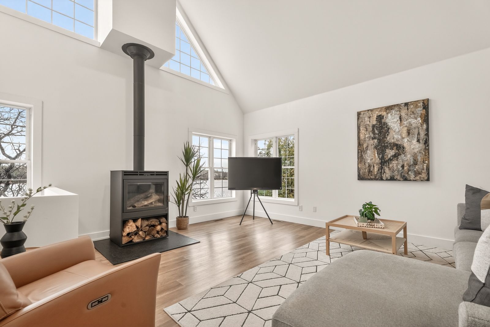 • Family room features over 20-foot ceilings and a modern wood stove.