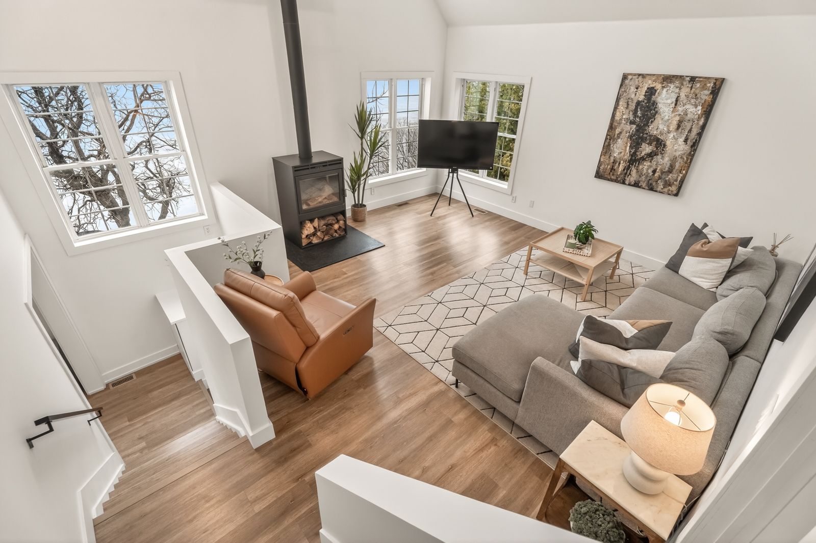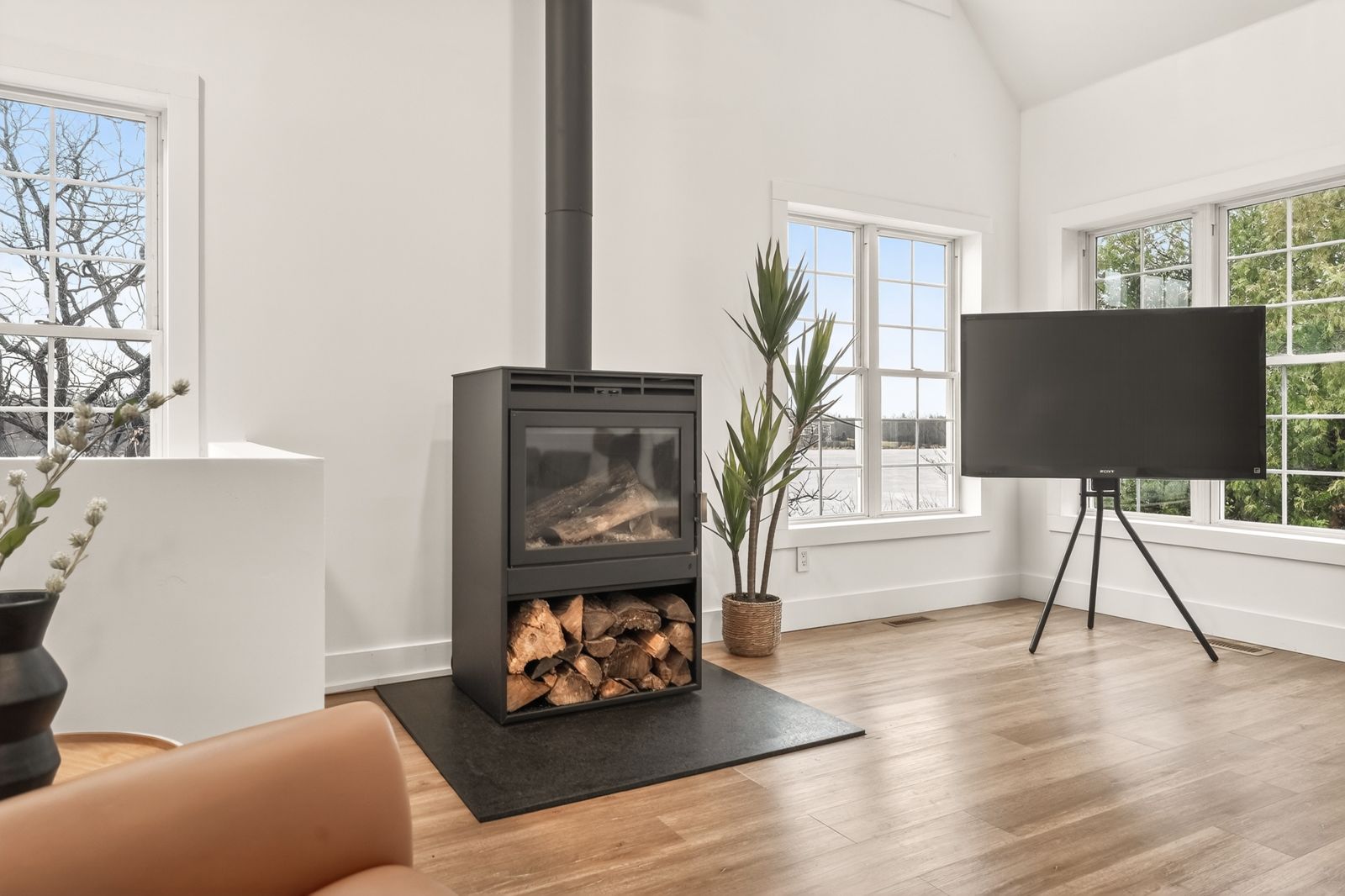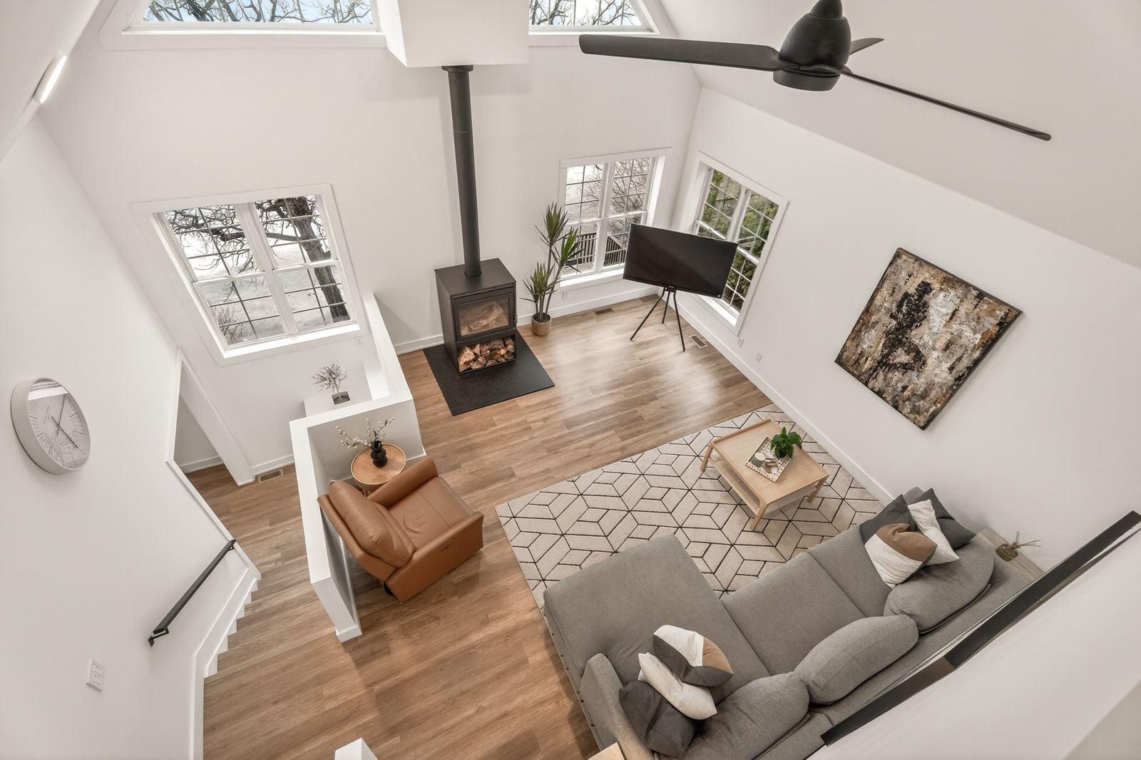 • Family room features over 20-foot ceilings and a modern wood stove.