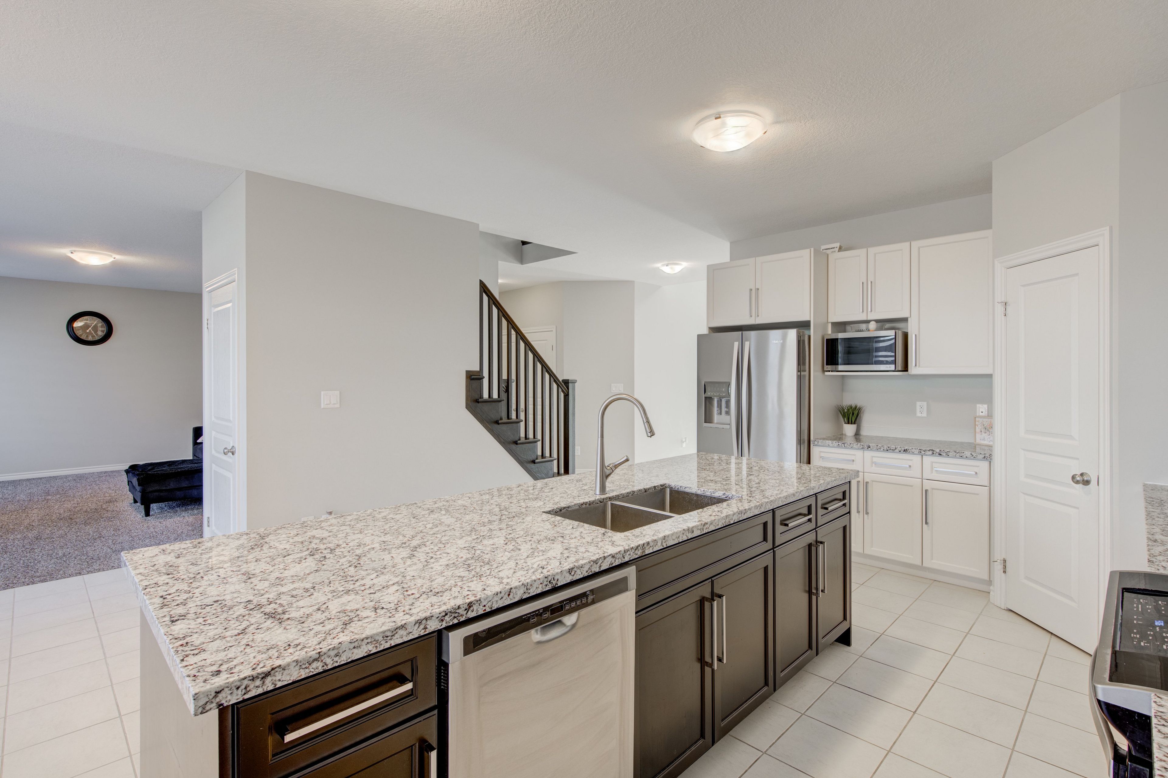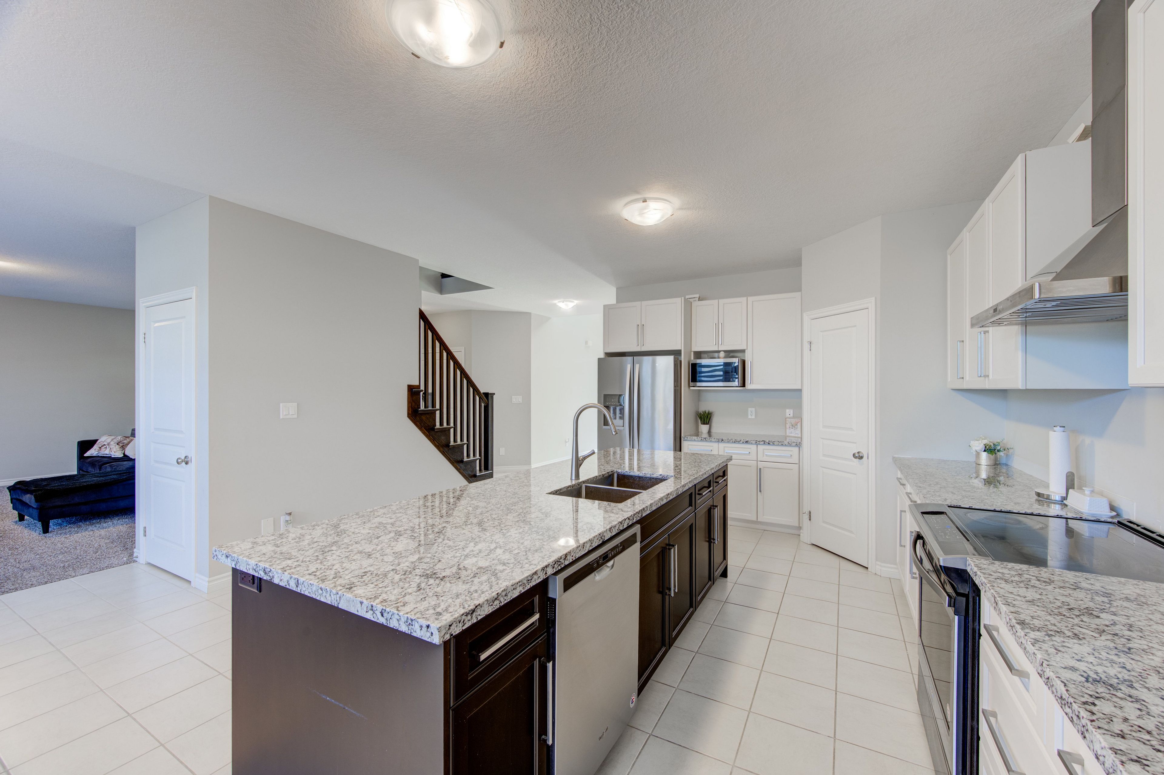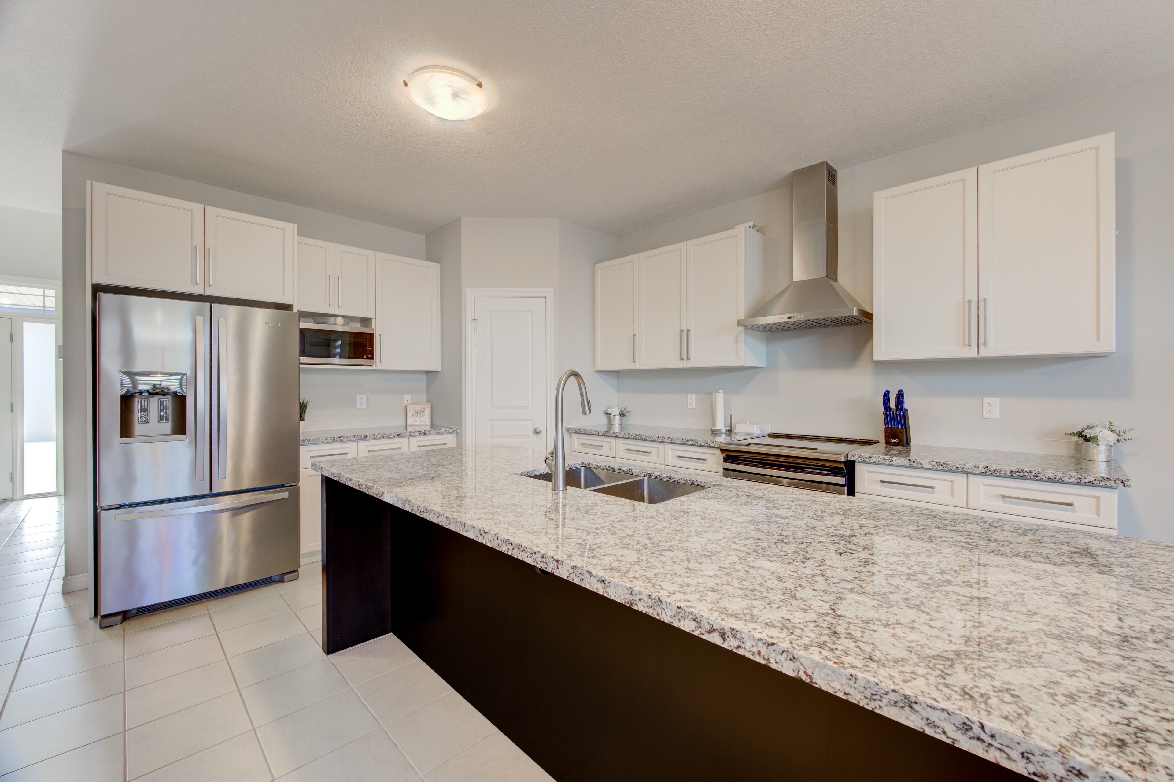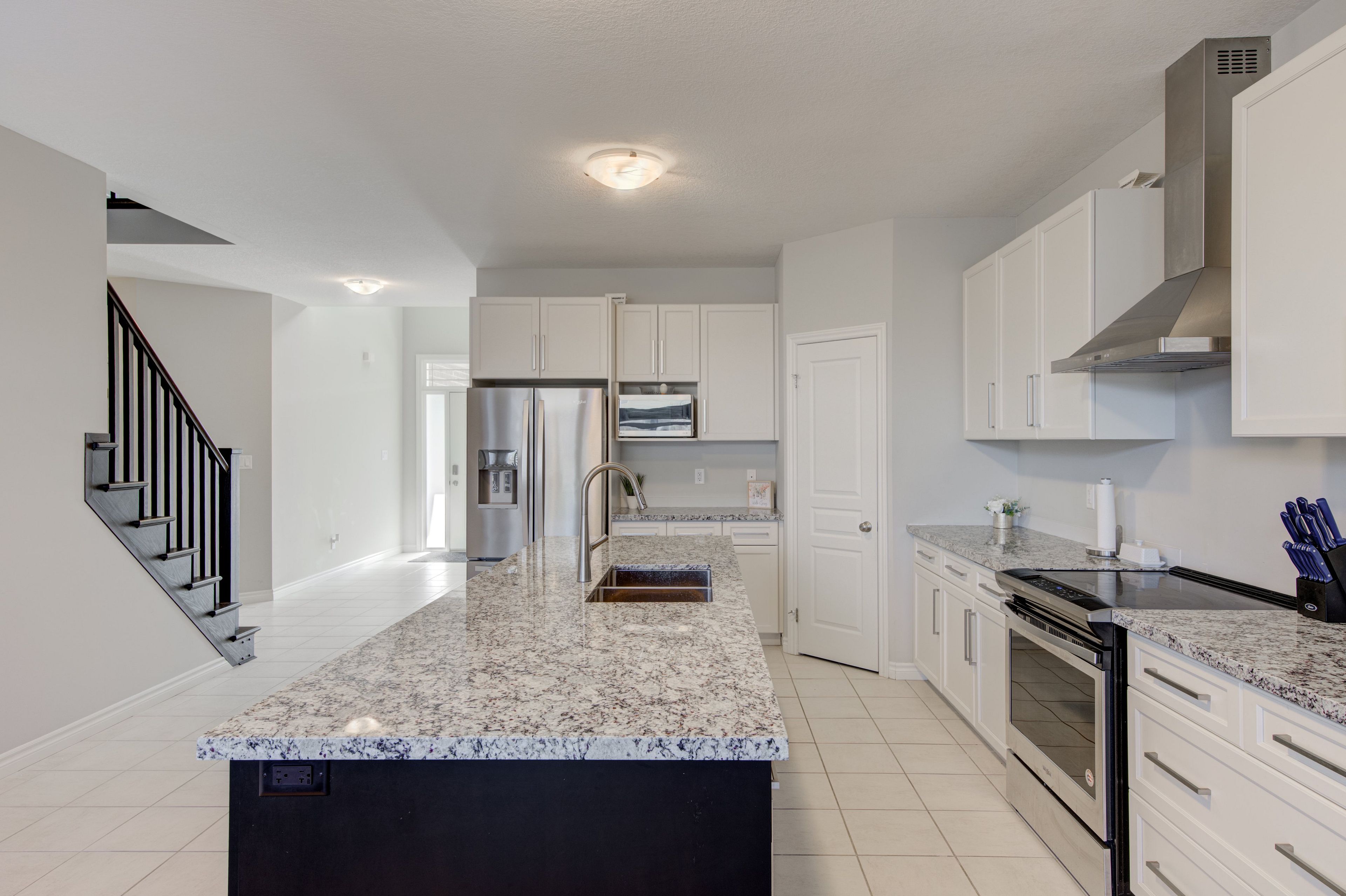 • Elegant kitchen features granite countertops, great for cooking and hosting.