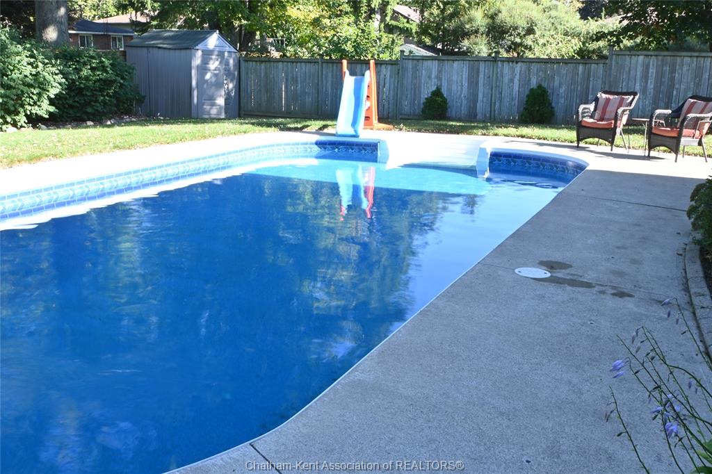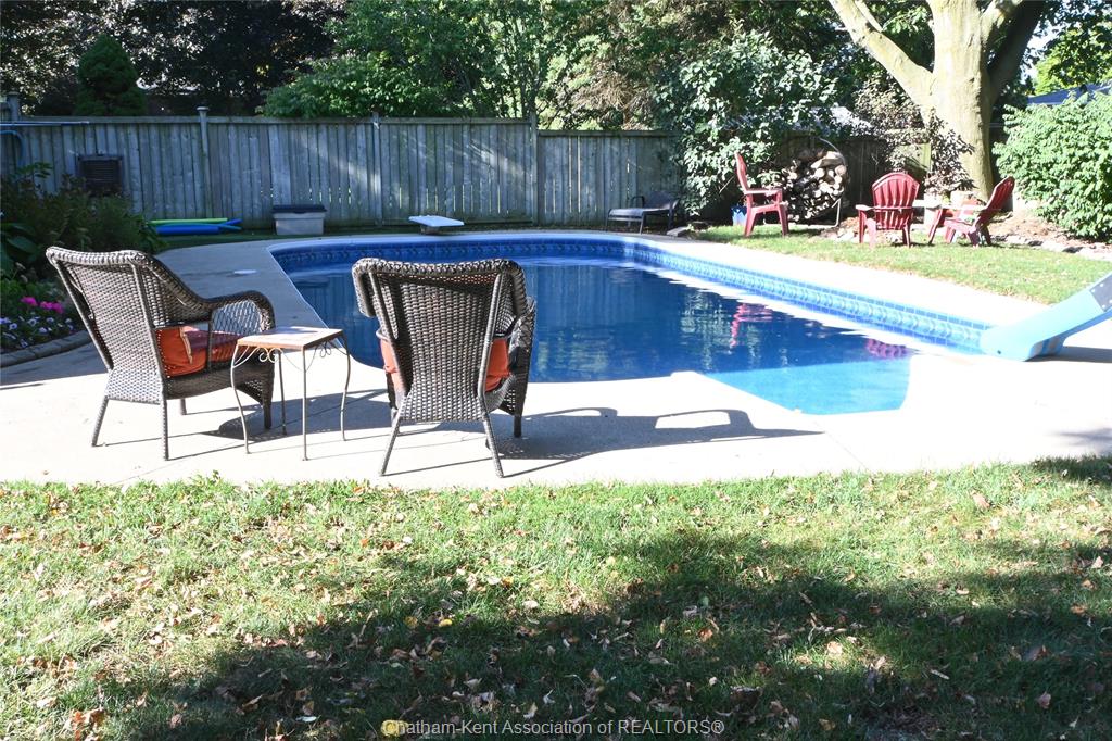 • Backyard features a heated pool, patio, and firepit for relaxation.