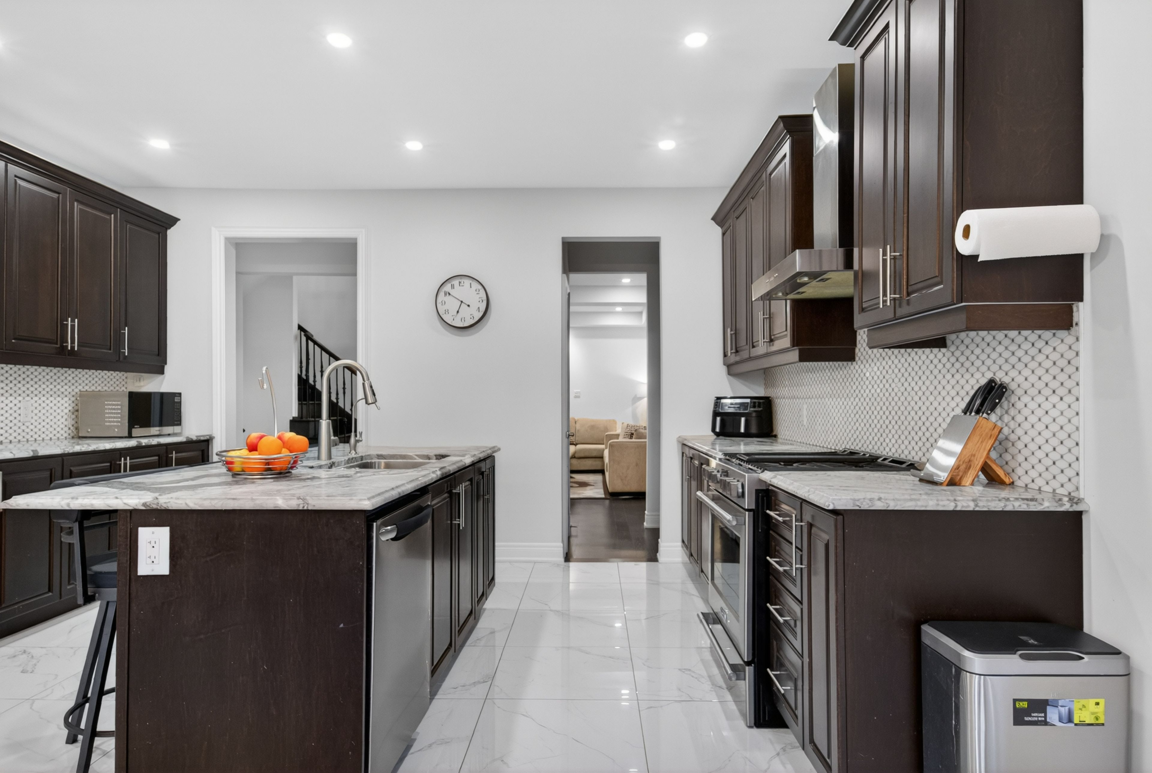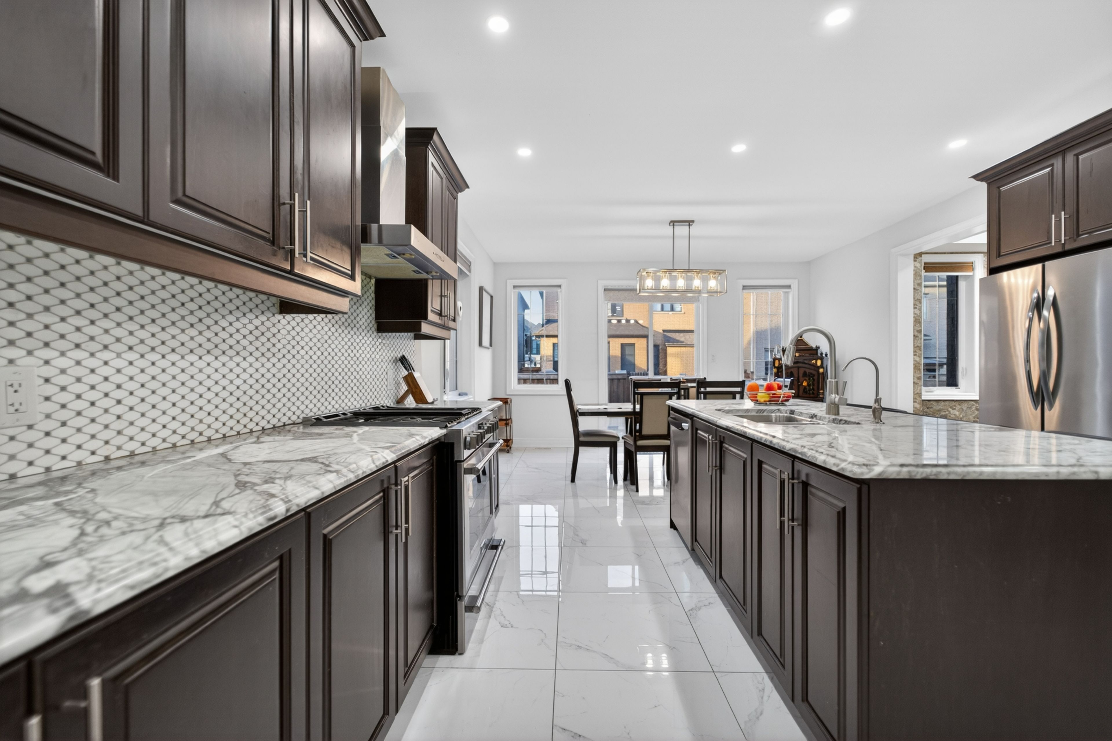• Modern kitchen with granite countertops, stainless steel appliances, and butler's pantry.