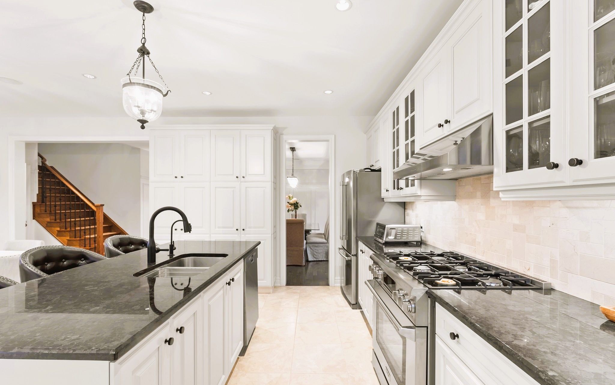 • Gourmet kitchen with high-end stainless steel appliances and gas range.