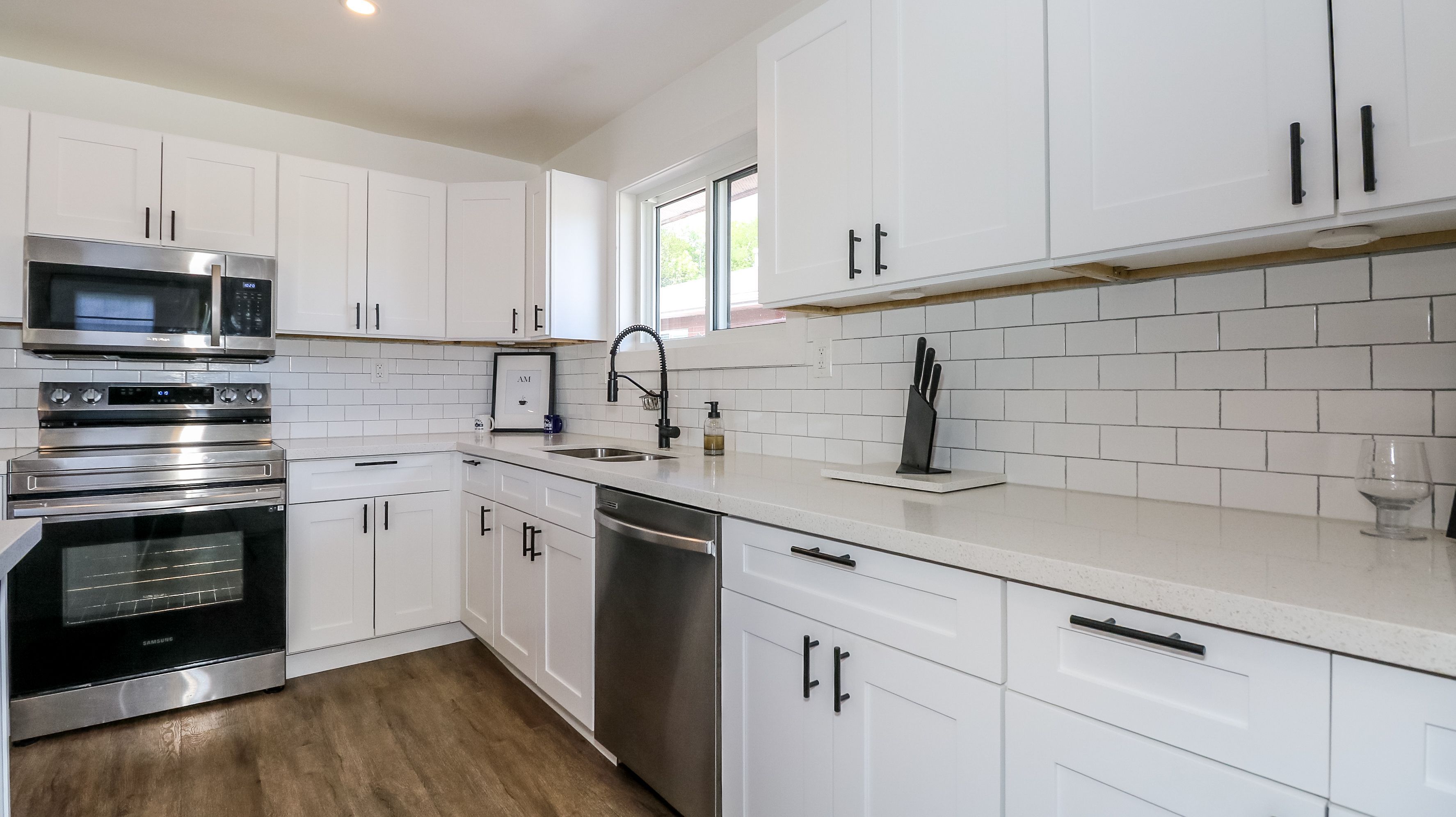 • Modern kitchen with quartz countertops and large island for gatherings.