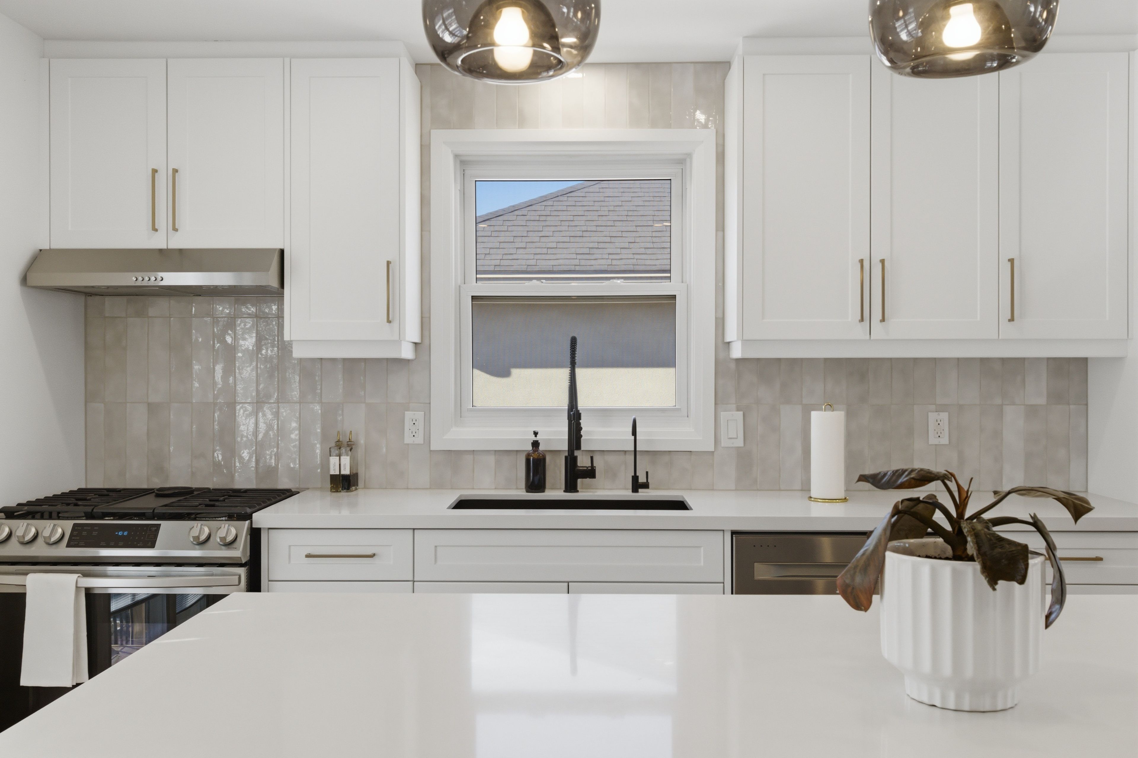 • Modern kitchen with quartz countertops and spacious island, perfect for cooking.