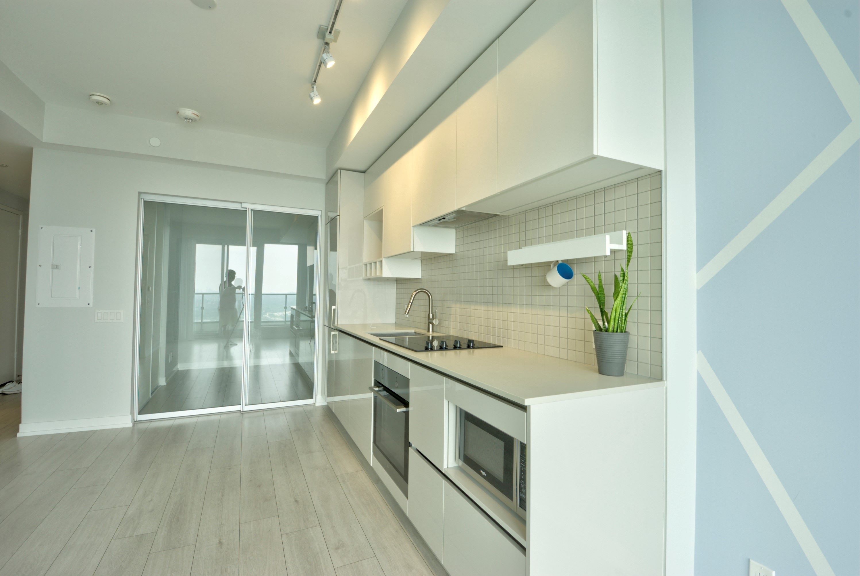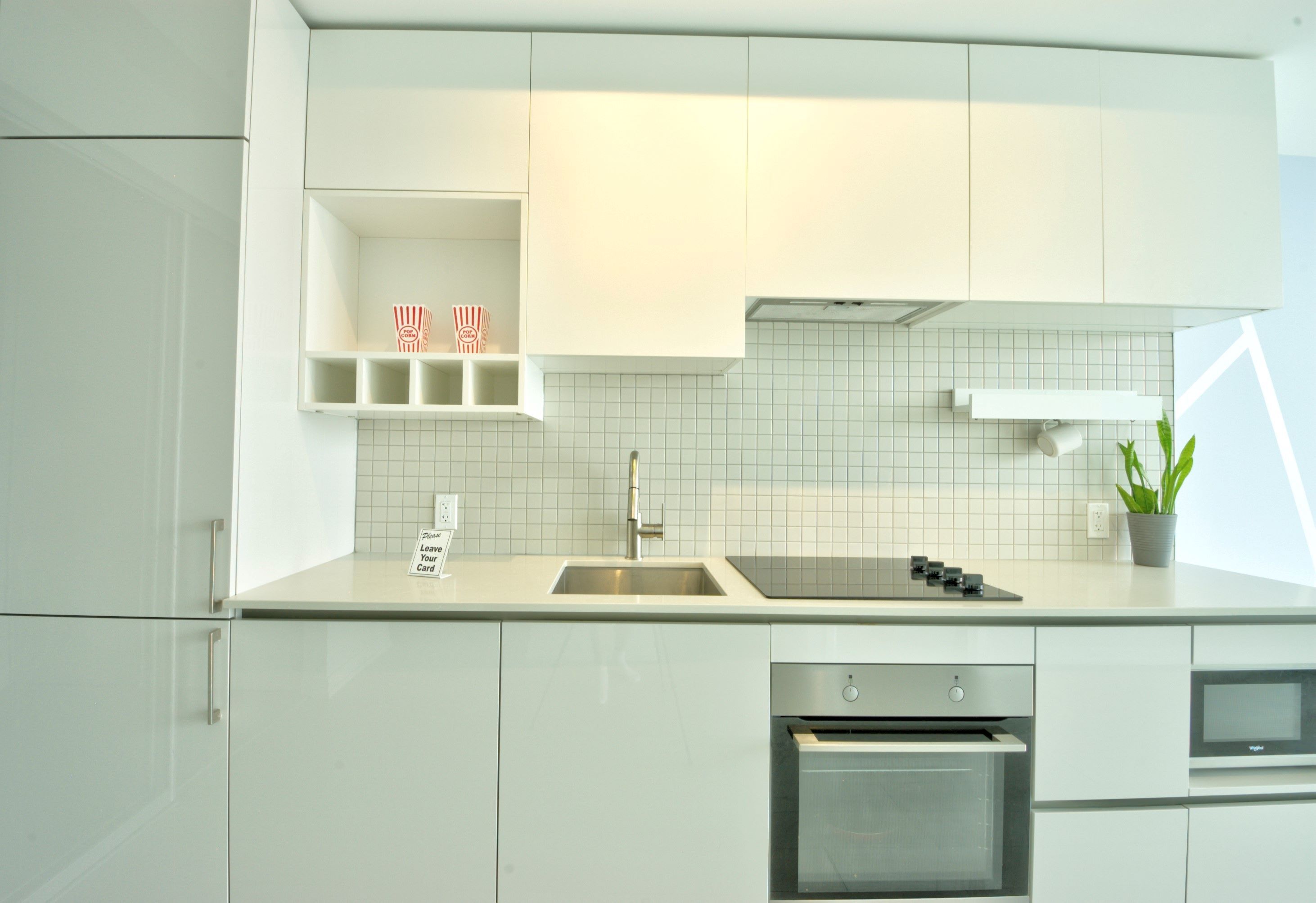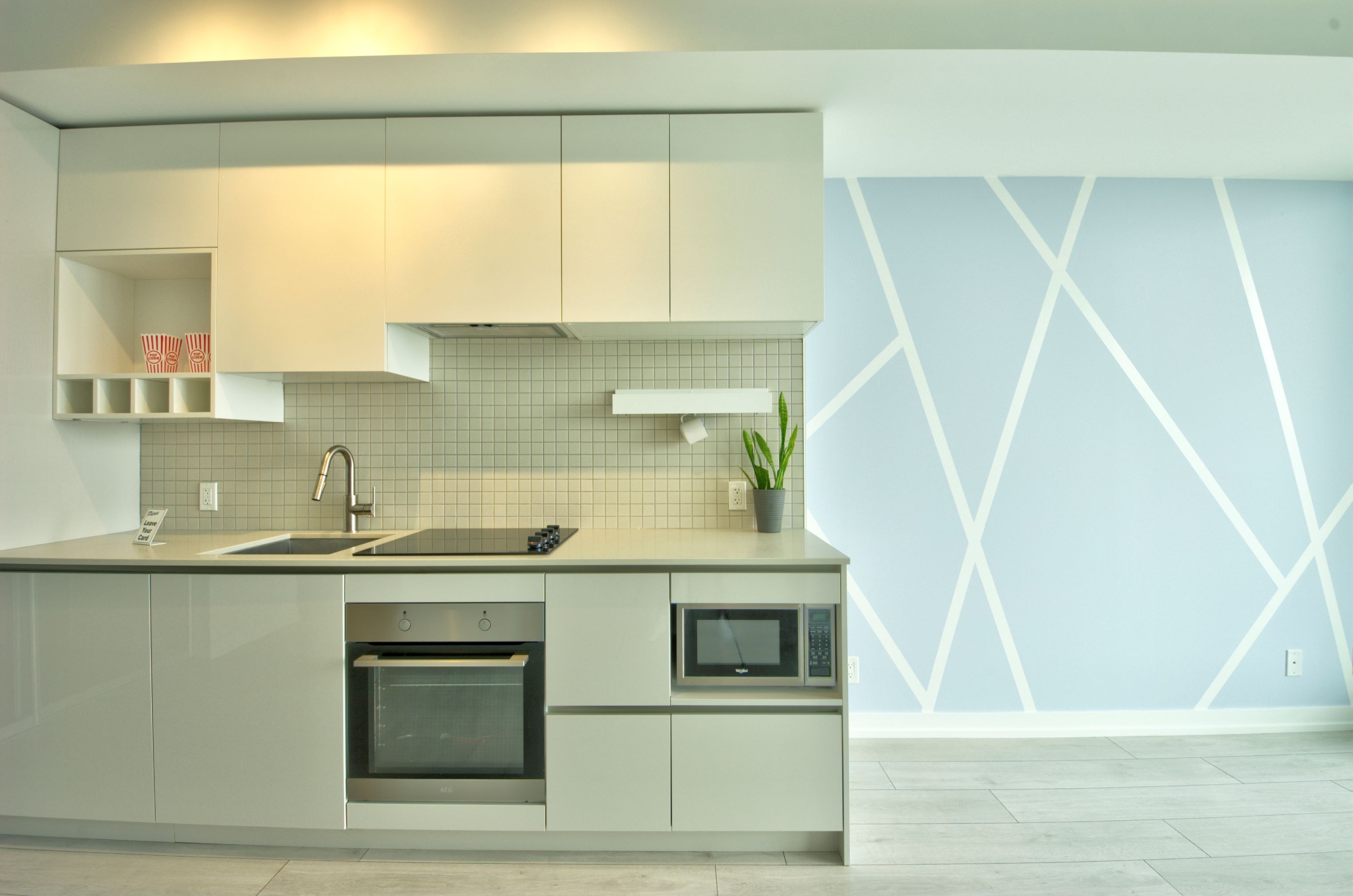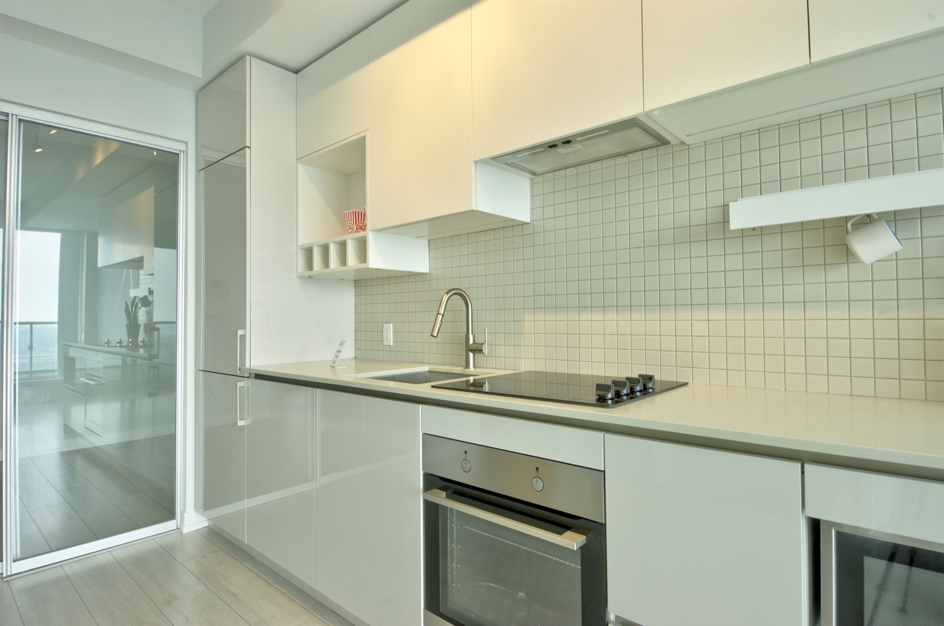 • Modern kitchen equipped with built-in appliances and stylish backsplash.
