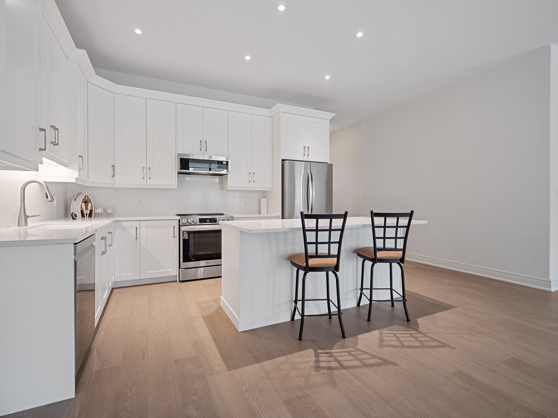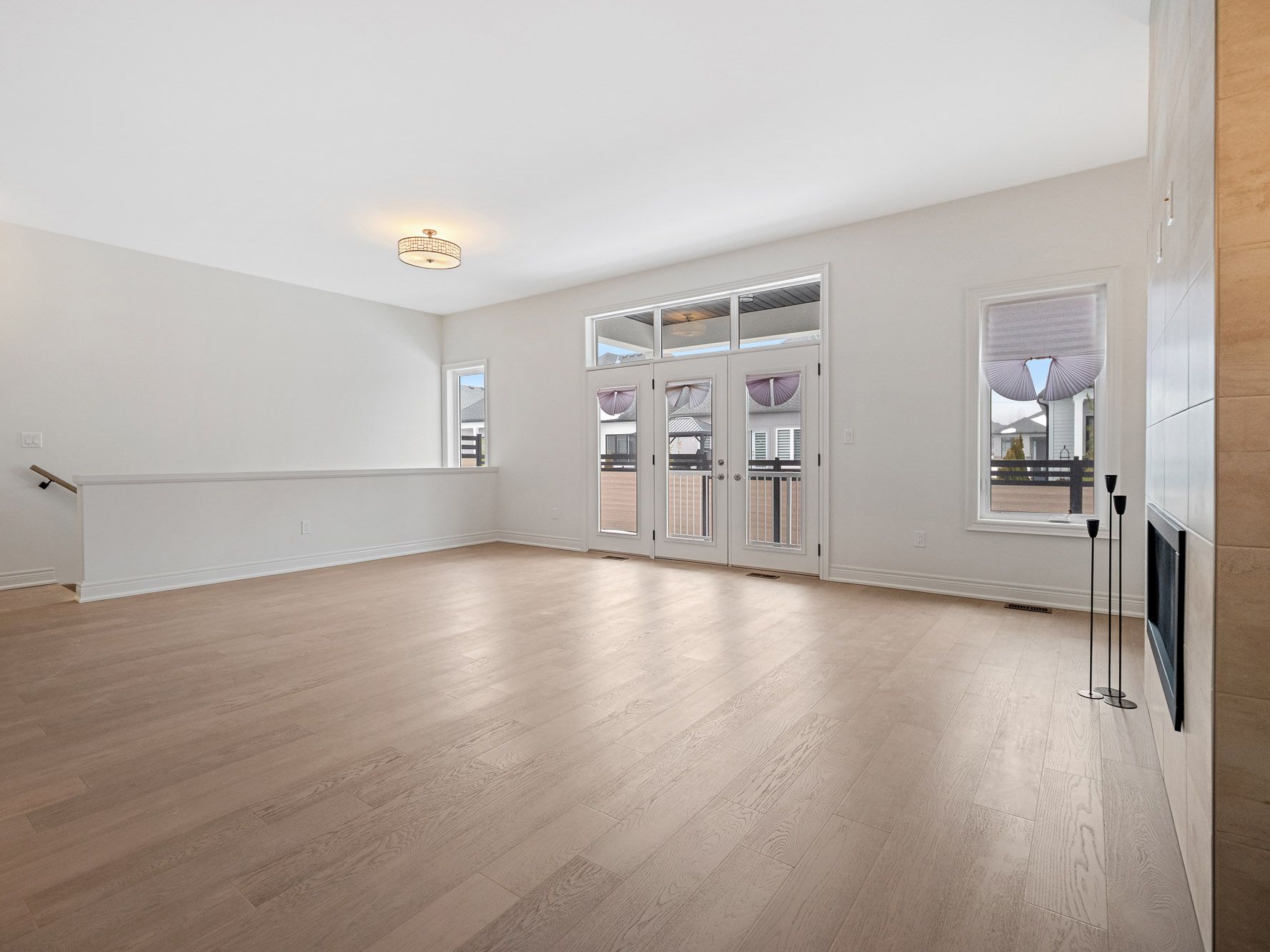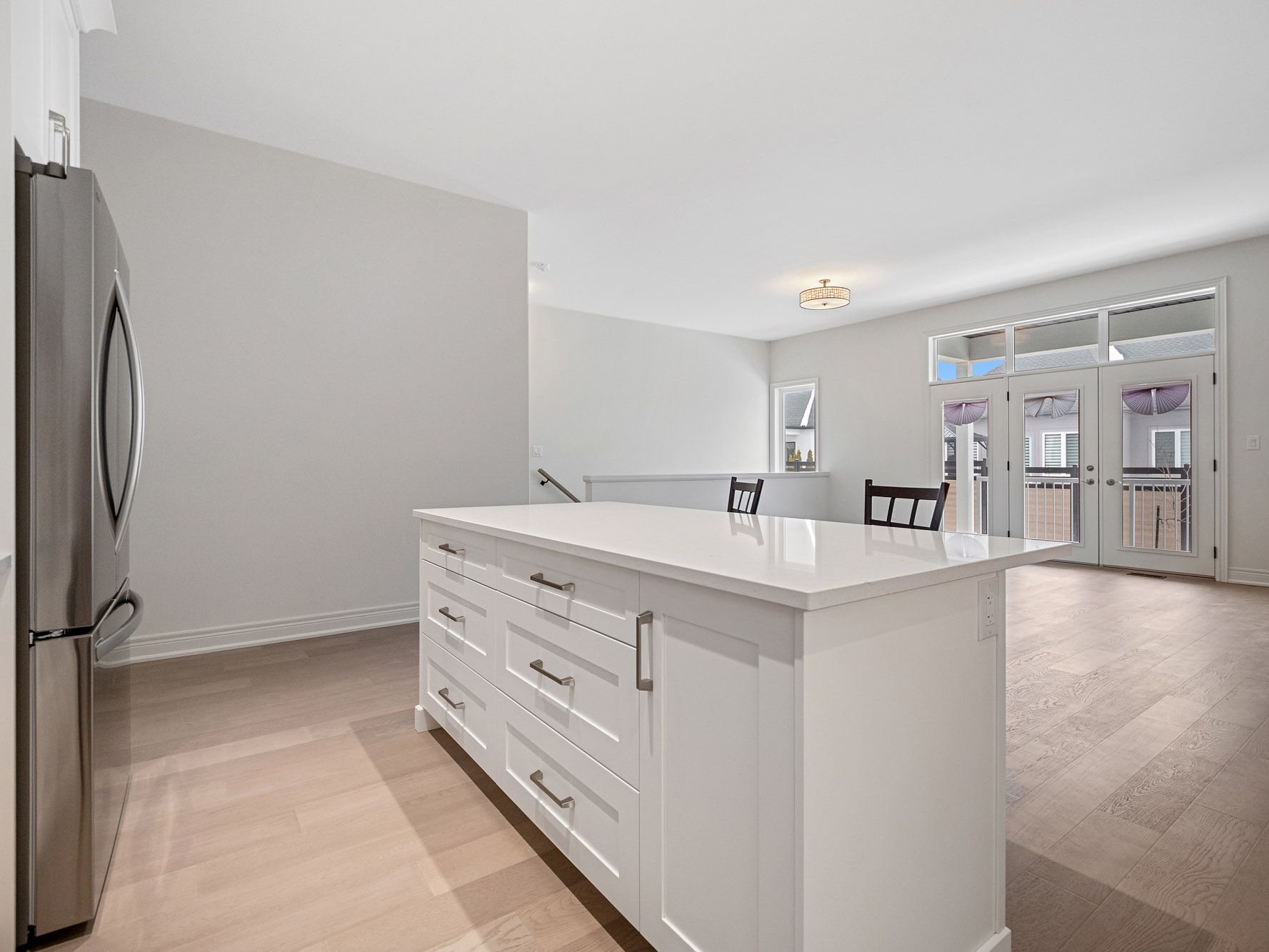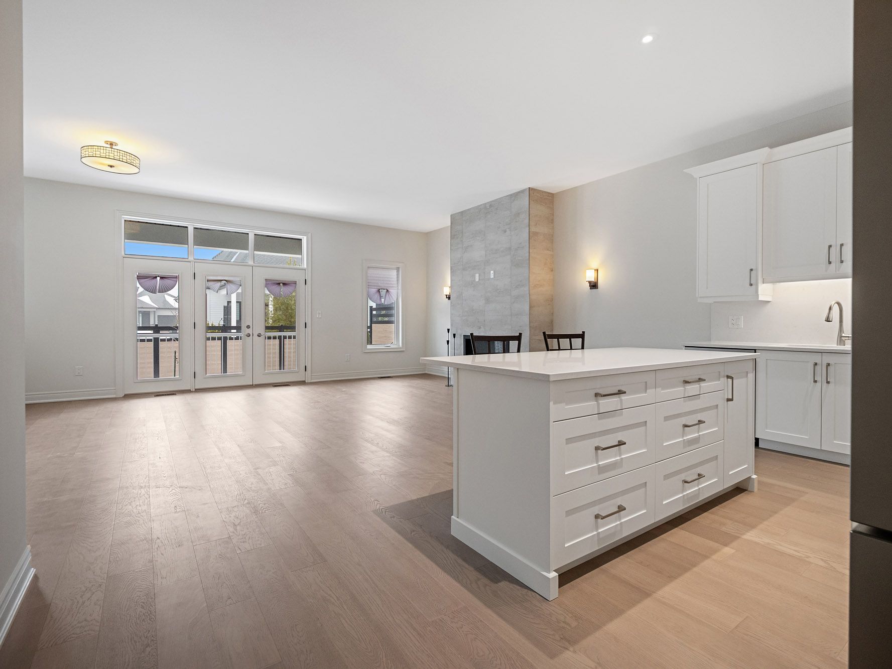 • Bright open concept living area with large windows and high ceilings.
