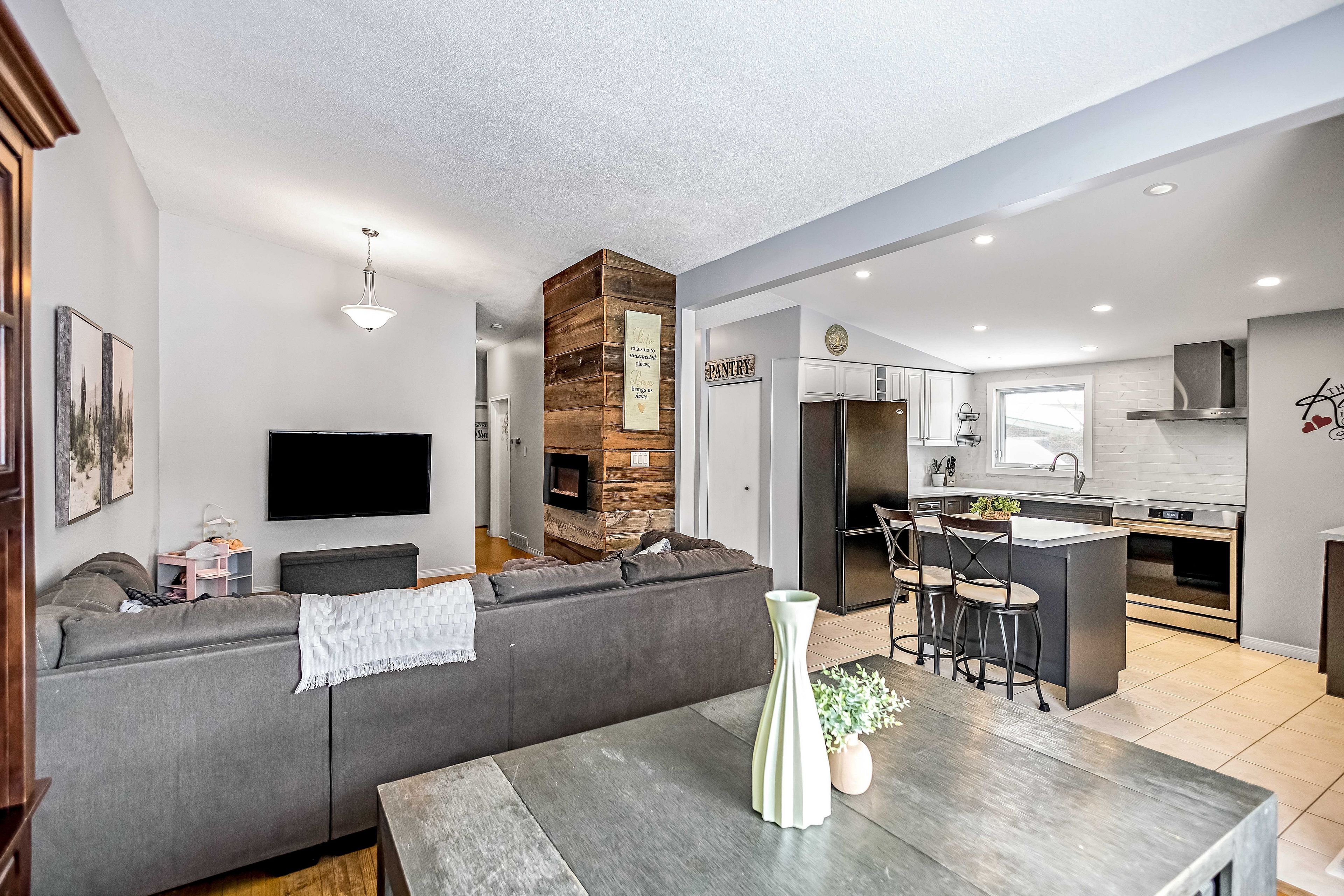 • Bright family room with vaulted ceiling and rustic fireplace for cozy vibes.