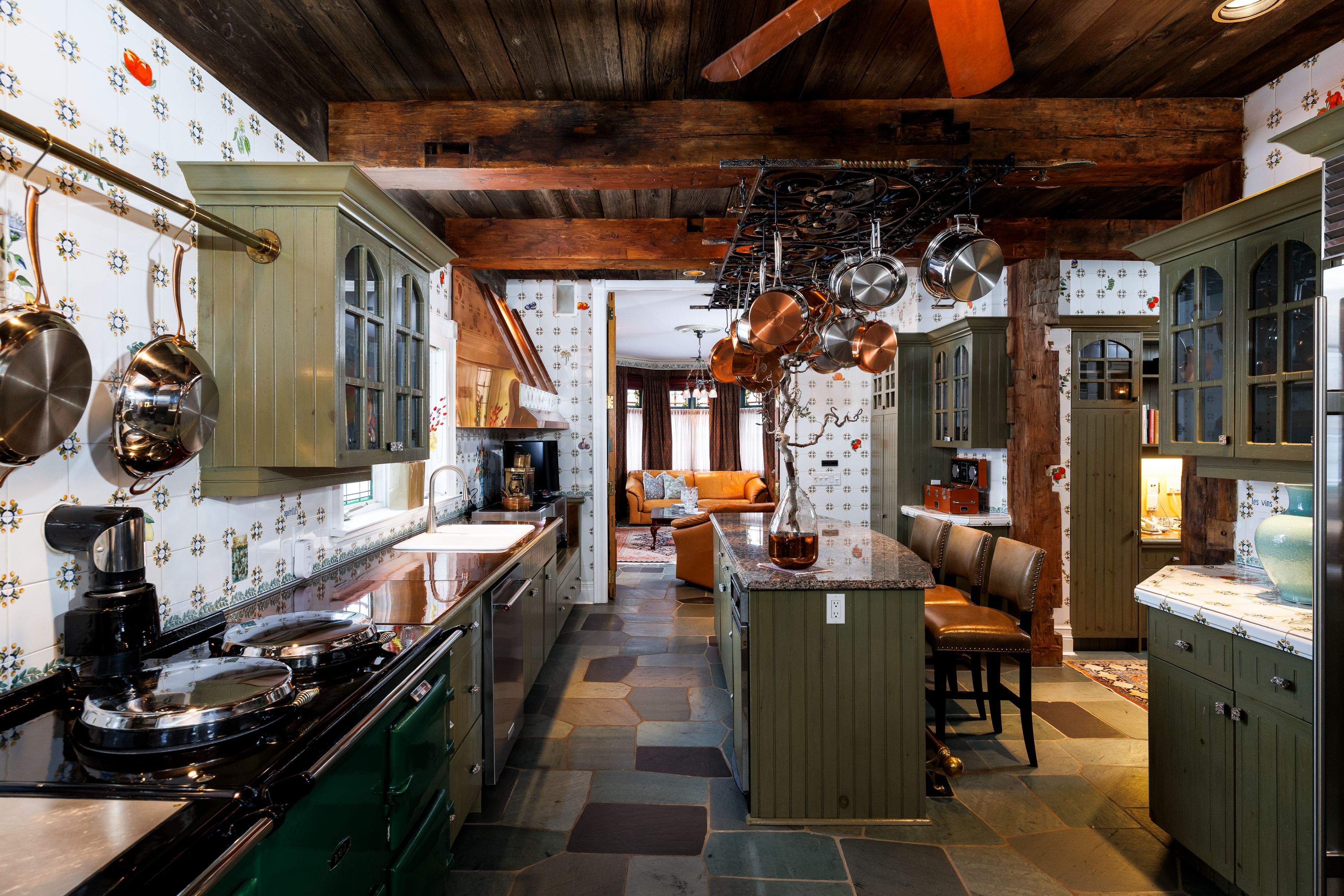 Tucked into one of toronto's most prestigious pockets, 5 castle frank cres is a truly one-of-a-kind residence that blends old world elegance w/ modern scale & functionality. Set on an exceptional, deep ravine lot, this home offers 7,000 sq ft of beautifully curated living space, surrounded by lush greenery & complete privacy in the heart of the city. Built in 1910, the home carries a rich architectural presence that has been thoughtfully maintained & enhanced over time. The interior reflects a distinctly european inspired aesthetic, where grand principal rms, exposed timber beams, & intricate craftsmanship create a warm & timeless atmosphere. Natural stone flooring compliment key areas of the home, while stained and leaded glass details add a brilliant touch of soft light throughout. The chef's kitchen is a true focal point, designed for both everyday living & entertaining. Outfitted w/ a classic aga cast iron range, commercial grade appliances, a custom copper hood, hand painted tile backsplash, & a large central island w/ integrated warming drawer, the space blends character w/ functionality. Custom cabinetry, stone countertops, & a hanging wrought iron pot rack completes the grandiose of the kitchen, evoking a refined country estate feel in downtown toronto. Signature features include 7 fireplaces w/ antique mantels, high ceilings, imported solid wood doors & a layout that offers both openness & defined living spaces. This 5 bedrm, 6 bathrm design is generous & well proportioned & is ideal for any family living at scale in an urban setting. Outside, the home transforms into a private retreat, w/ a lush ravine backdrop, expansive deck space, & complete seclusion from the hustle & bustle of the city. A garage w/ rare gated parking area for up to 5 vehicles further elevates the property, an exceptional amenity in the south rosedale neighbourhood. Steps to bloor street, upscale shopping in yorkville, the subway, & the dvp, the location offers unmatched convenience.