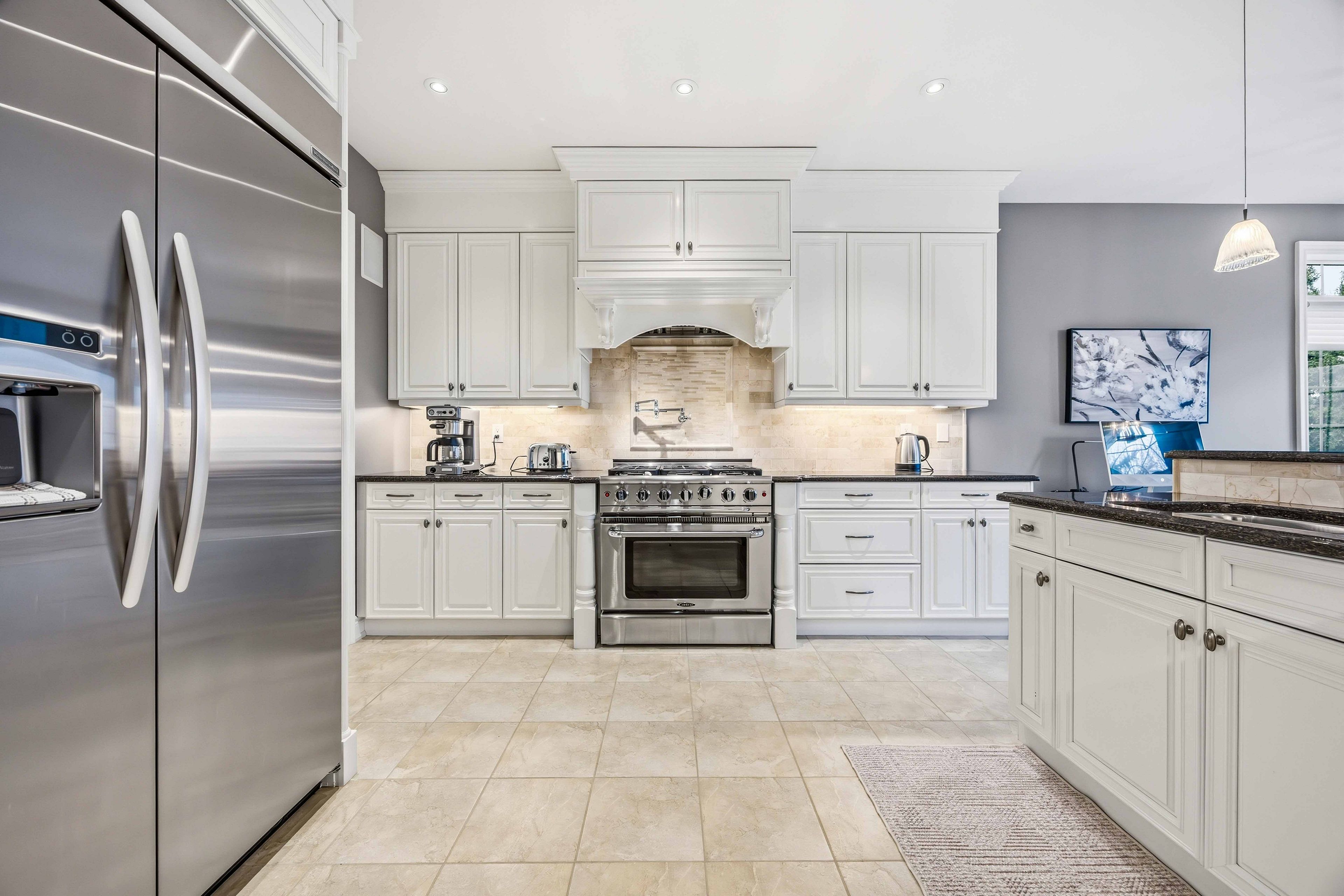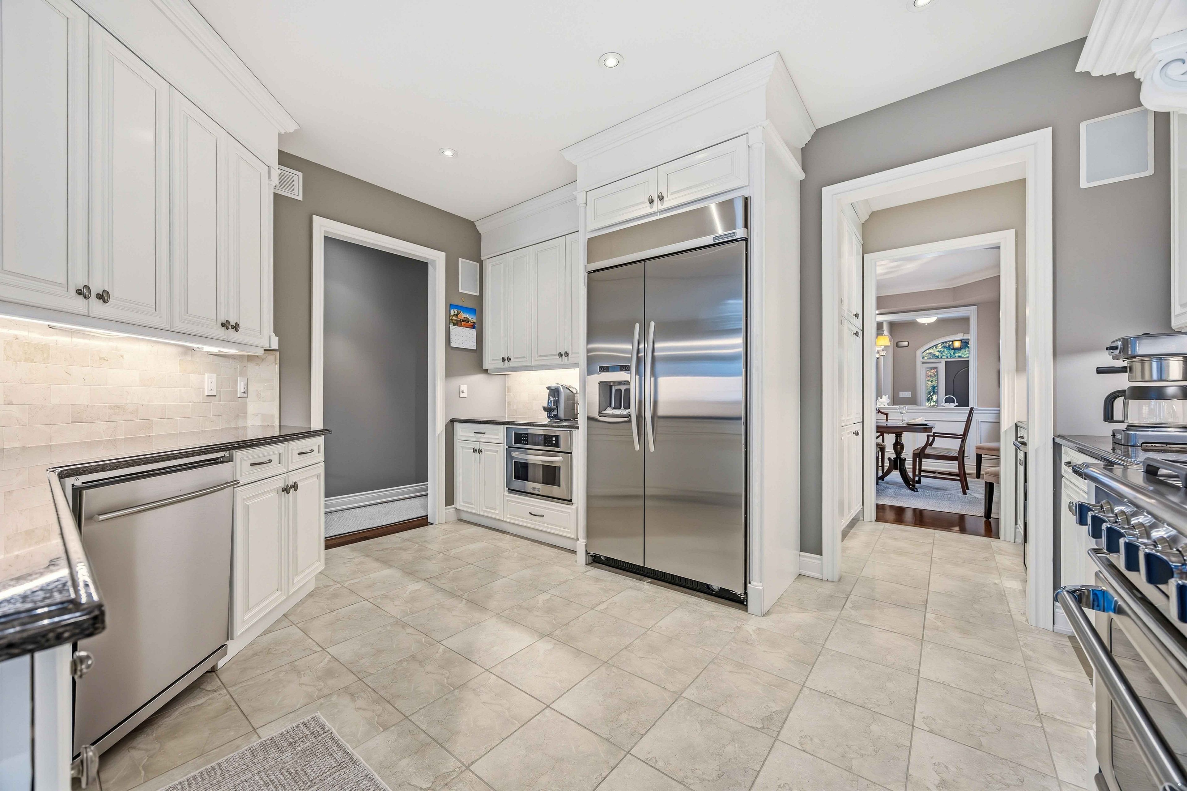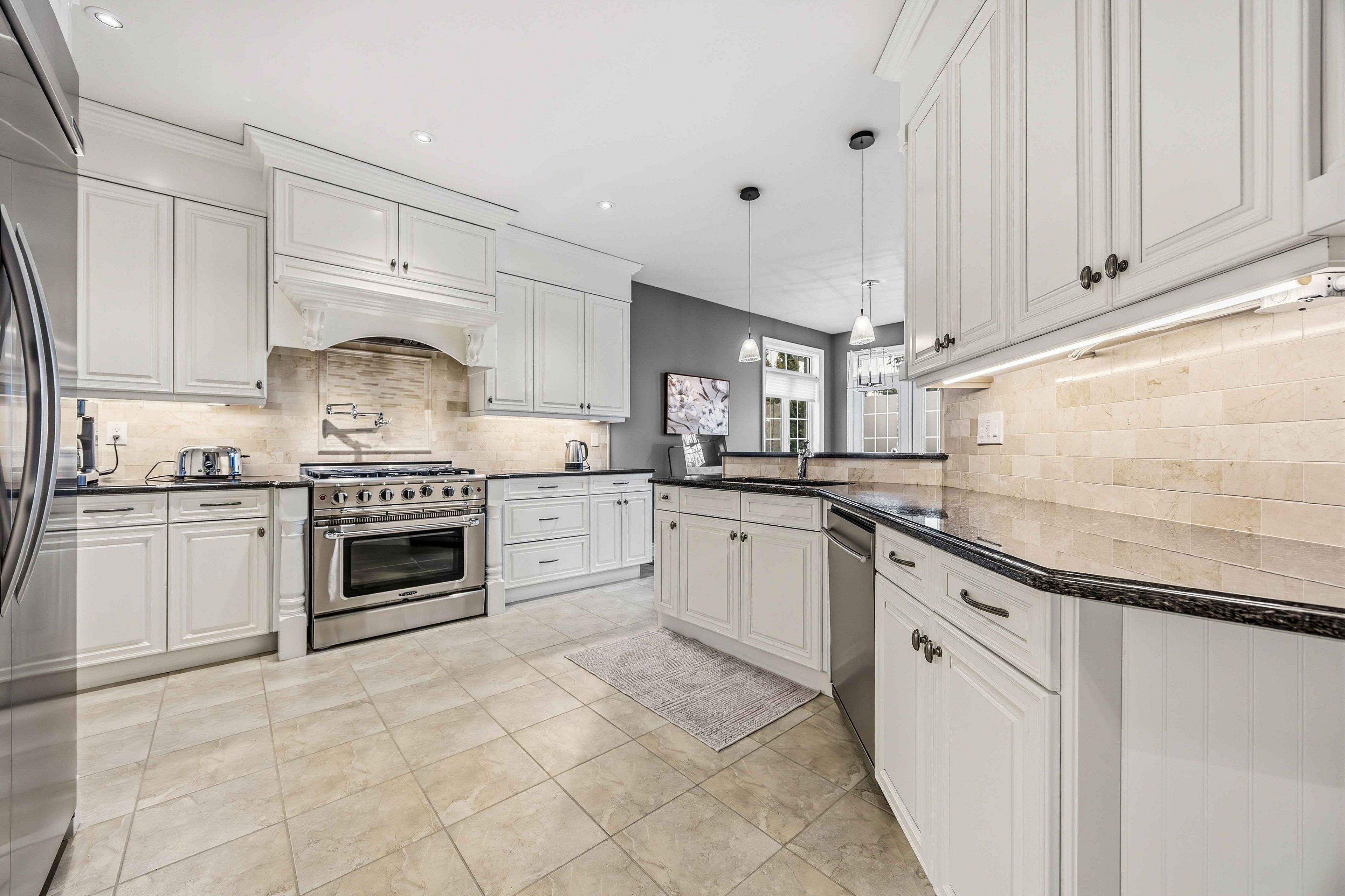 • Gourmet kitchen features granite countertops and built-in appliances.