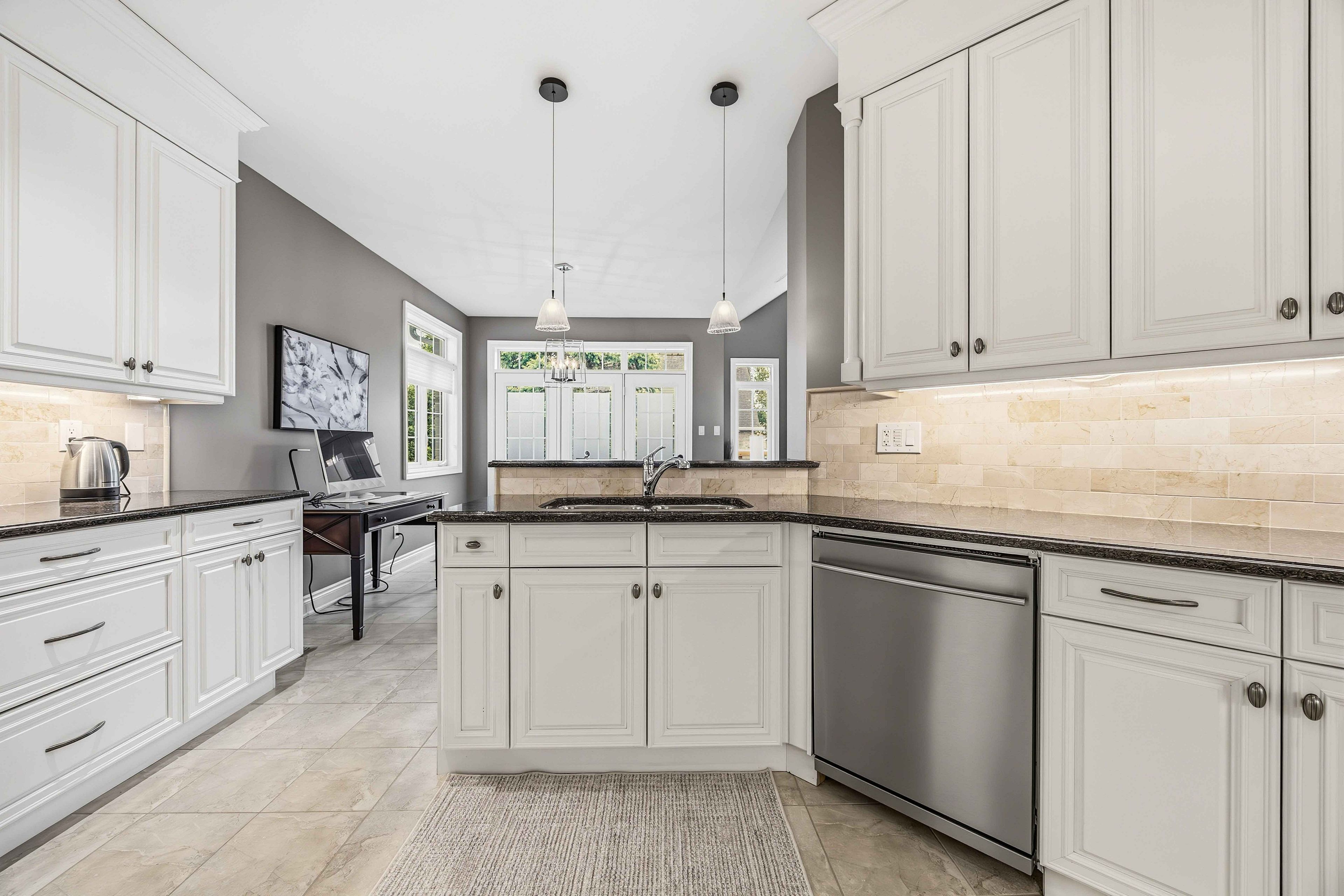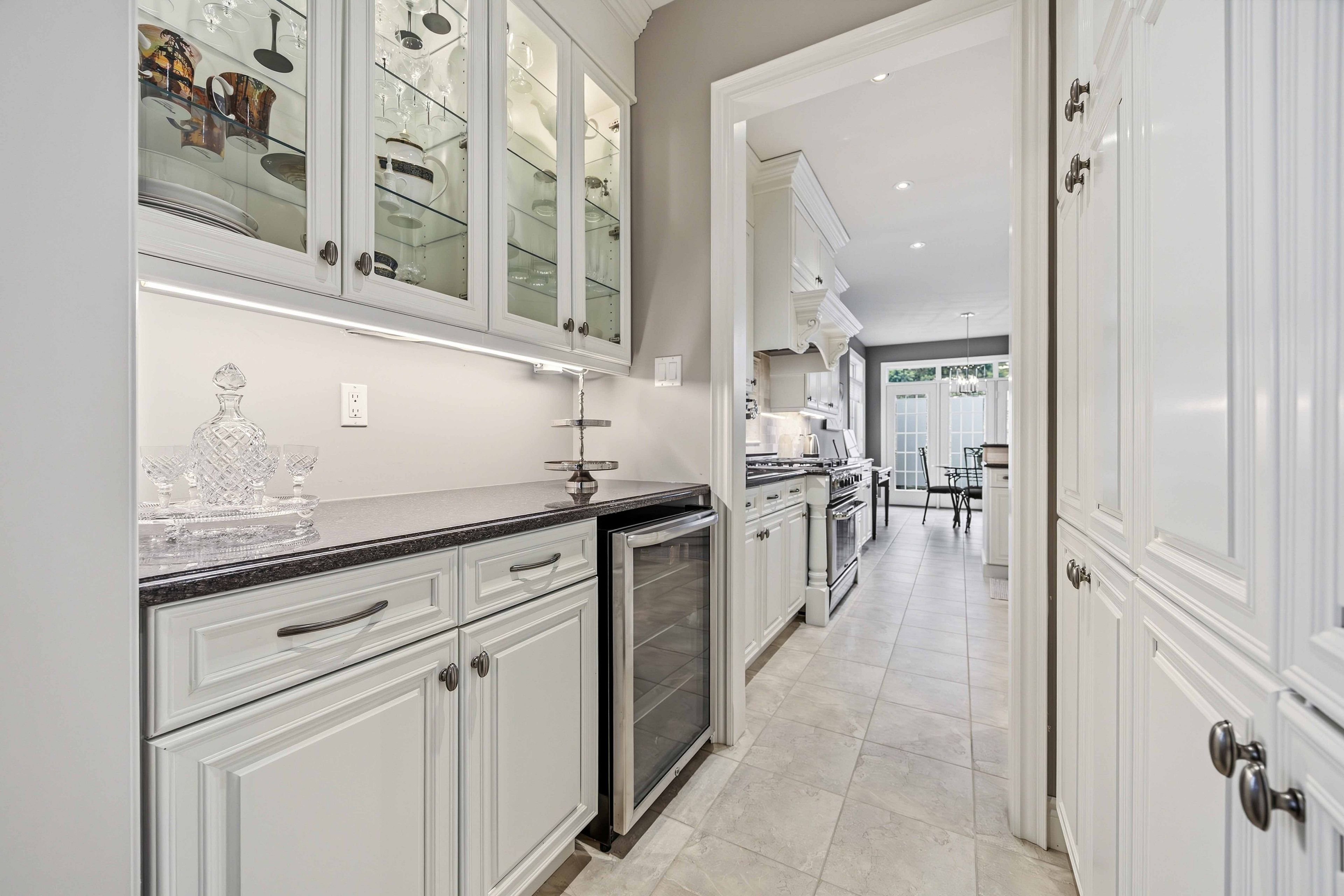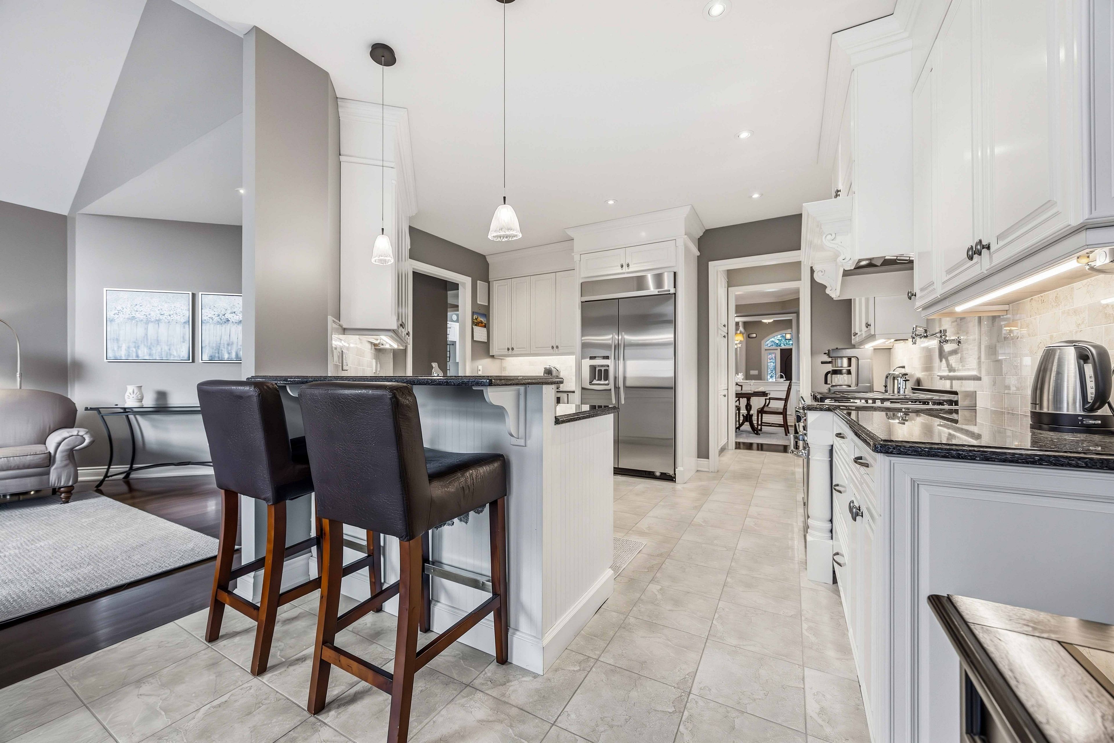 • Gourmet kitchen features granite countertops and built-in appliances.