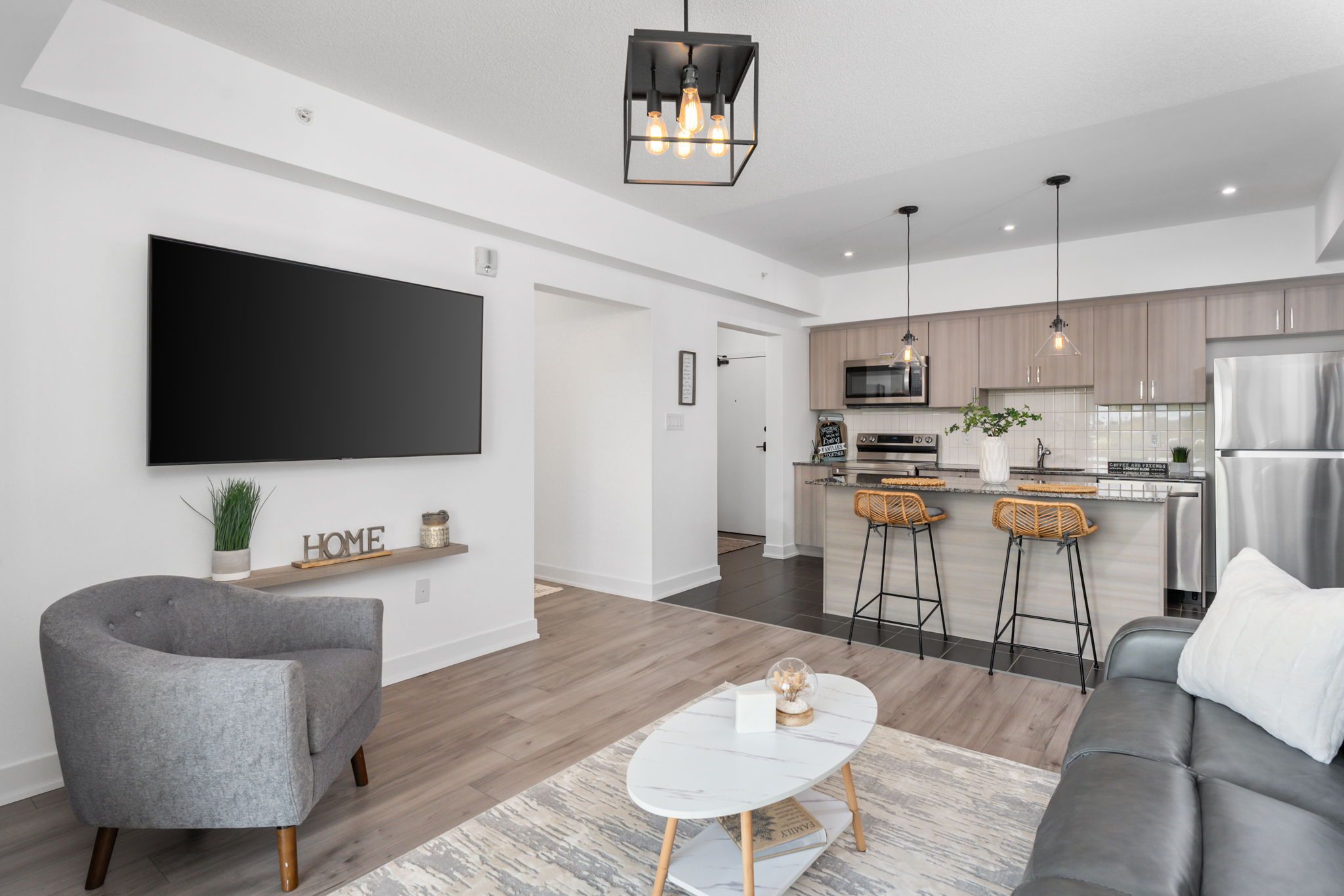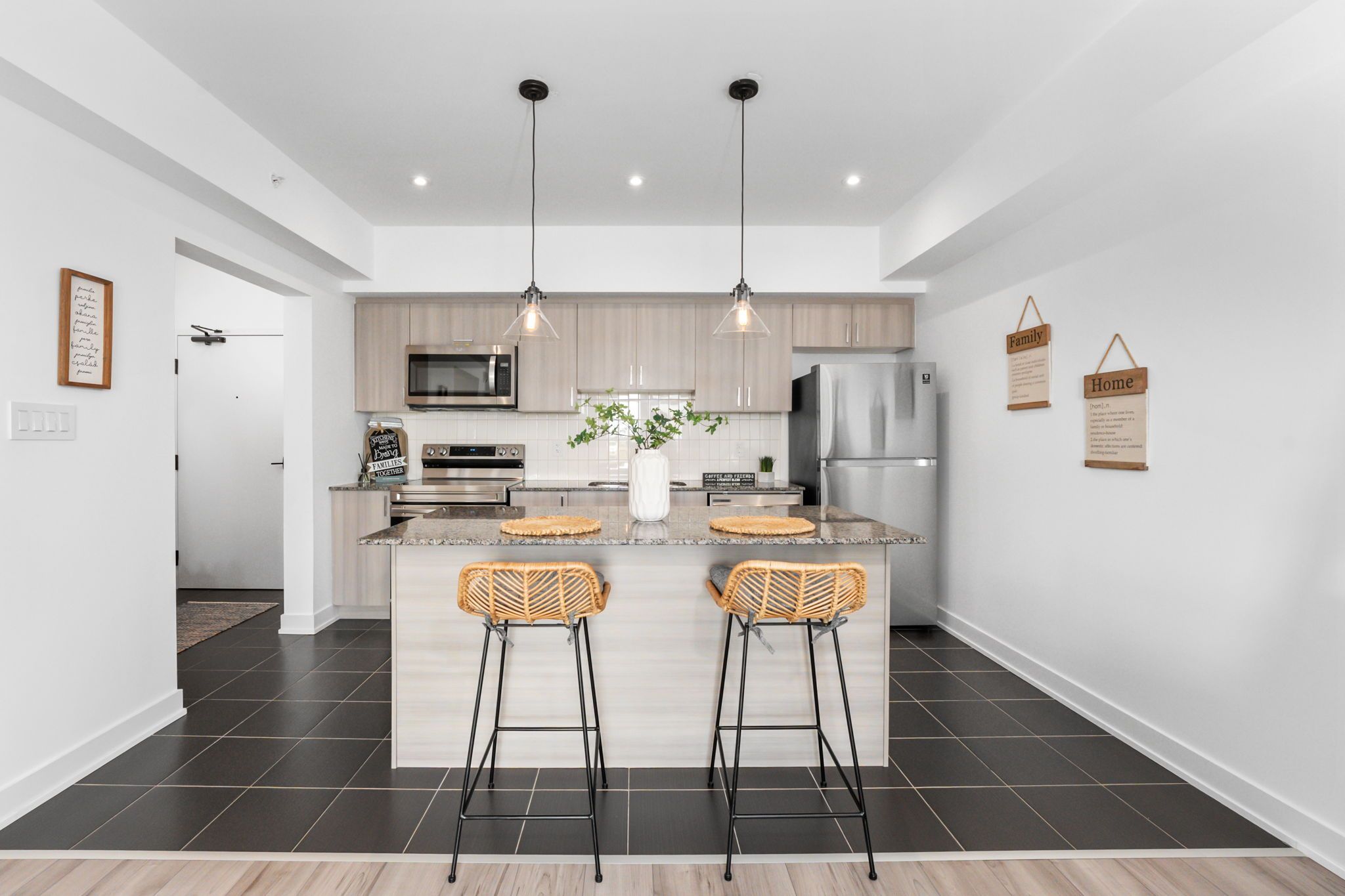 Welcome to bistro 6 at young & mapleview in barrie. Mins to go train, grocery stores, banks, hikingtrails & all amenities. Enjoy your forest view from the private balcony. Bright 4 yr new 1,060 sq. Ft 2 bedrooms & 2 full bathrooms. En-suite bath w a large walk-in shower & 2nd bath w a tub, large walk in closet. Laminate floor in hallway & living room. New modern light fixtures. Kitchen with pot lights, granite counter tops, island for entertaining / preparing meal. Most lights on dimmers. Outdoor community kitchen and gym. Gas line on balcony. Amazing private views from living /kitchen and both bedrooms.
