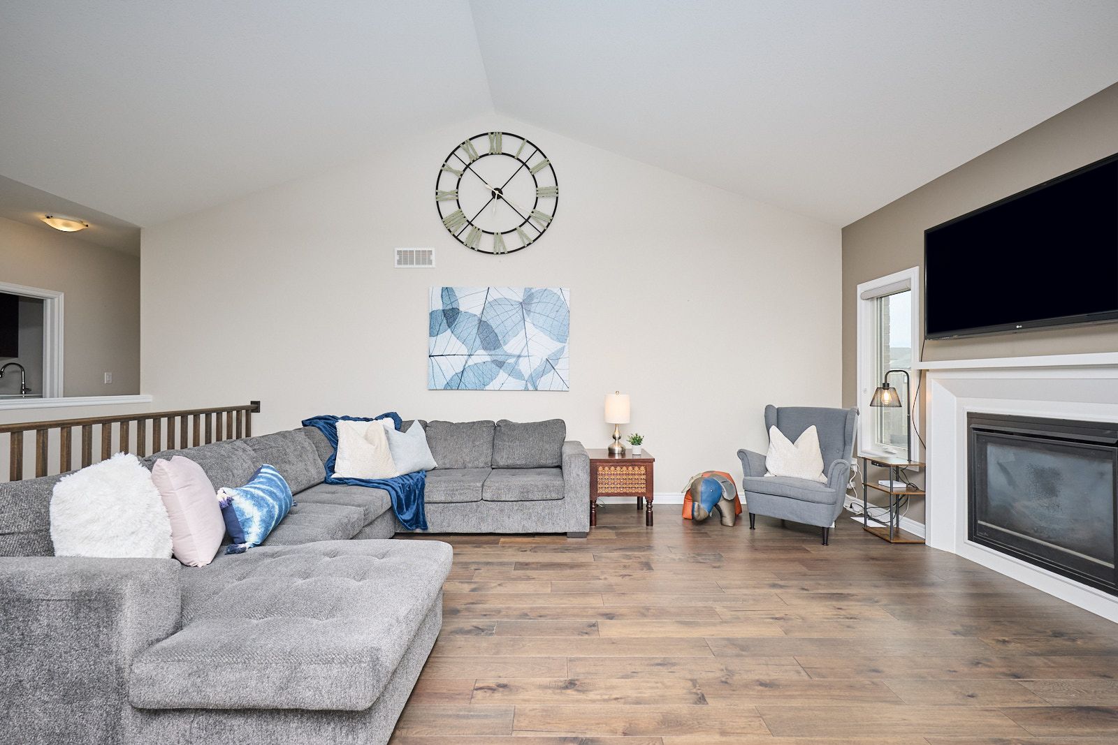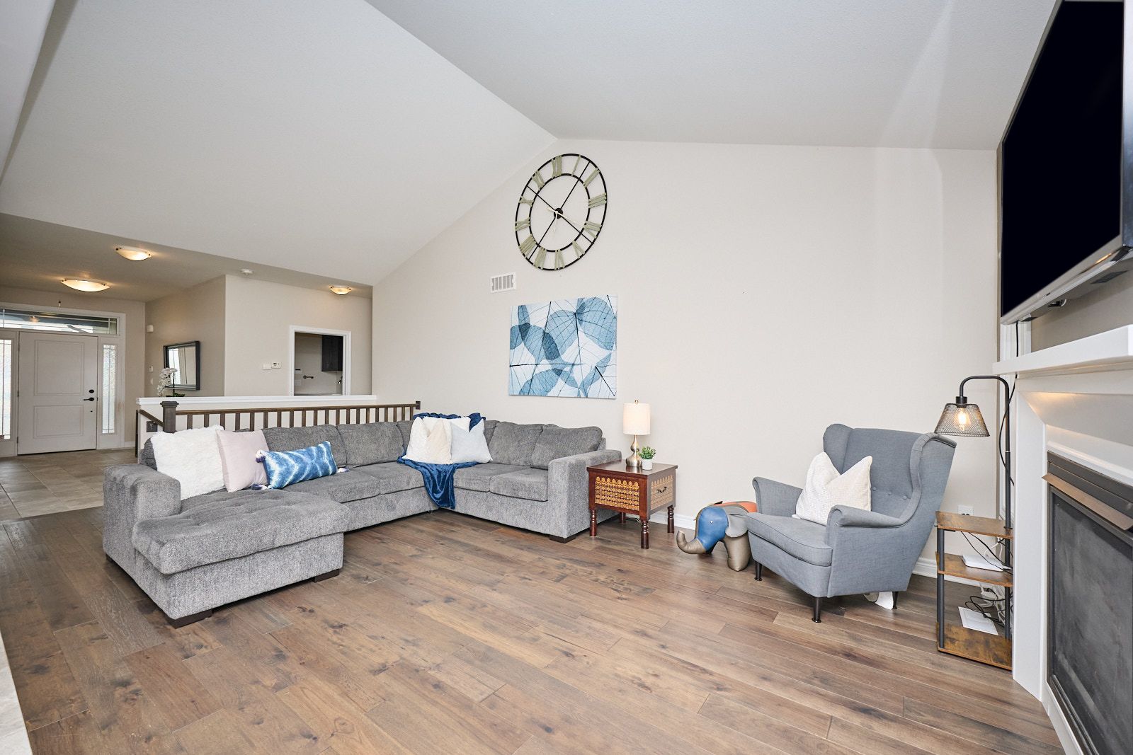 • Open concept main living area filled with natural light and vaulted ceilings.