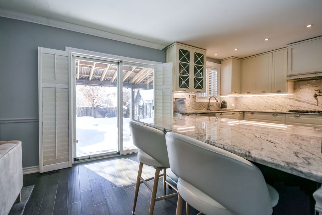 Turn key all-brick 4+1 bedroom family home in highly sought after country club estates! Beautifully updated and meticulously maintained, this move in ready home showcases thoughtful upgrades and exceptional pride of ownership throughout. Step outside to your private backyard oasis, enhanced by a tranquil pond and beautifully maintained landscaping, offering both privacy and serenity, ideal for relaxing or entertaining. The open concept main level features a spacious living room with a cozy napoleon gas fireplace, flowing seamlessly into the modern kitchen with granite countertops, stainless steel appliances, a gas stove, breakfast bar, and a walkout to the covered private deck, perfect for year round enjoyment! A formal dining room offers an elegant space for hosting, while a dedicated office provides ideal work from home flexibility. The primary bedroom is a true retreat, complete with a walk-in closet and a stylish 3-piece ensuite. The fully finished basement significantly expands the living space with a large recreation room with another napoleon gas fireplace and a fifth bedroom with its own spa-like 3-piece ensuite featuring a luxurious steam shower perfect for guests or extended family. Conveniently located for commuters, just minutes from highway 400 and the go station, and close to park place shopping, centennial beach, lover's creek, scenic trails, and all essential amenities. Notable updates: furnace (2020), a/c (2017), roof (summer 2022), fridge (2017), stove & oven (2020), dishwasher (2025).