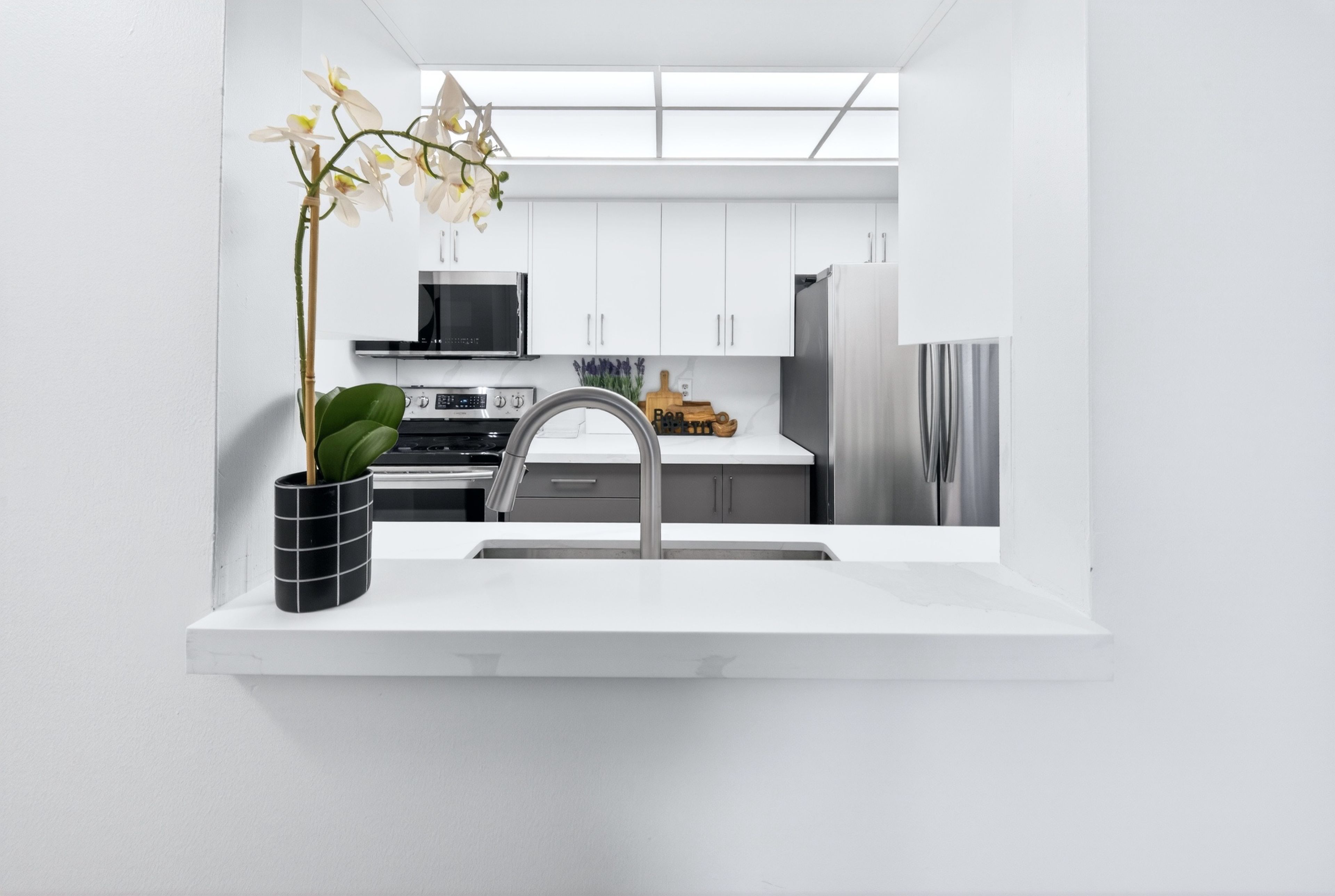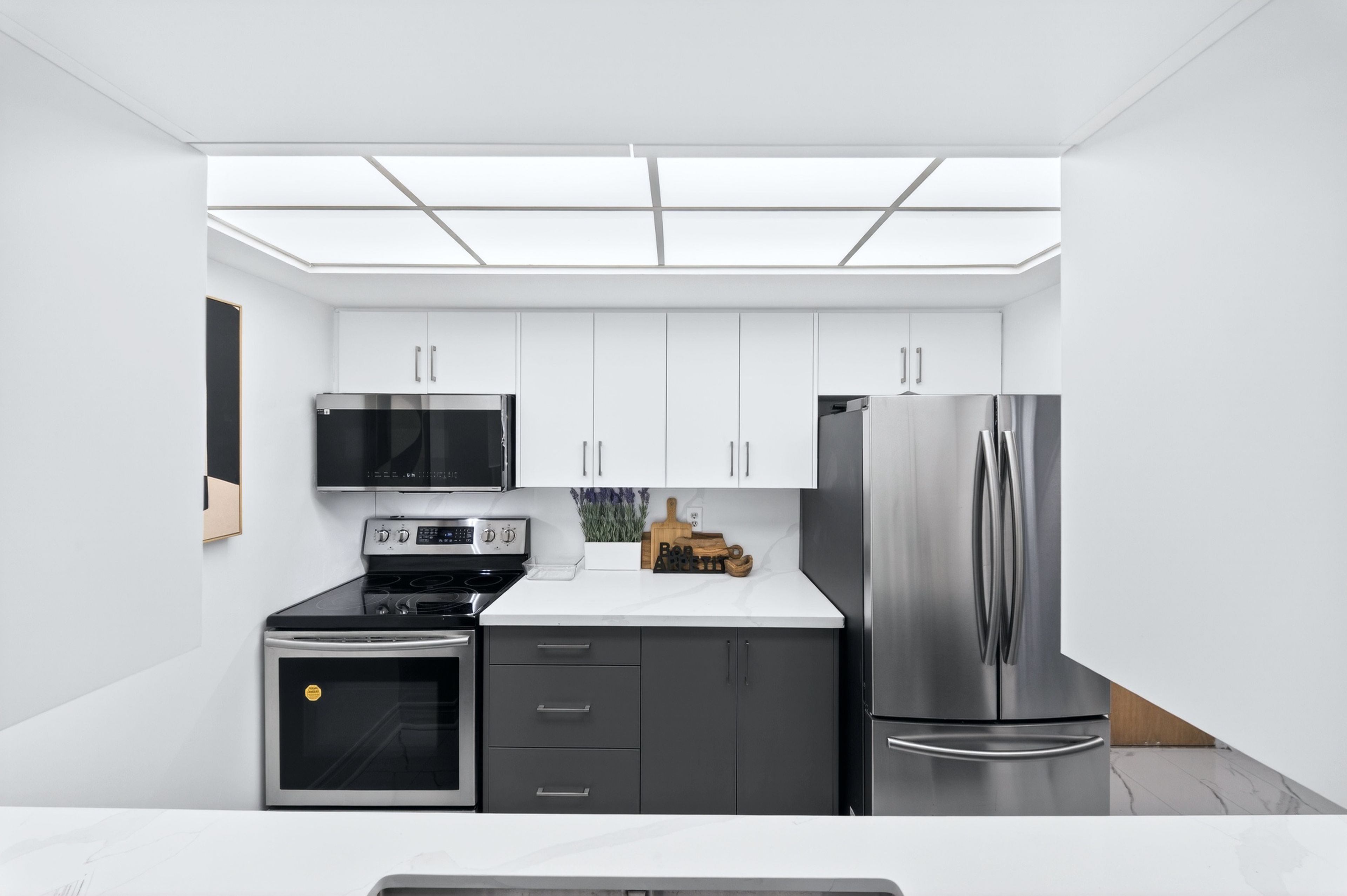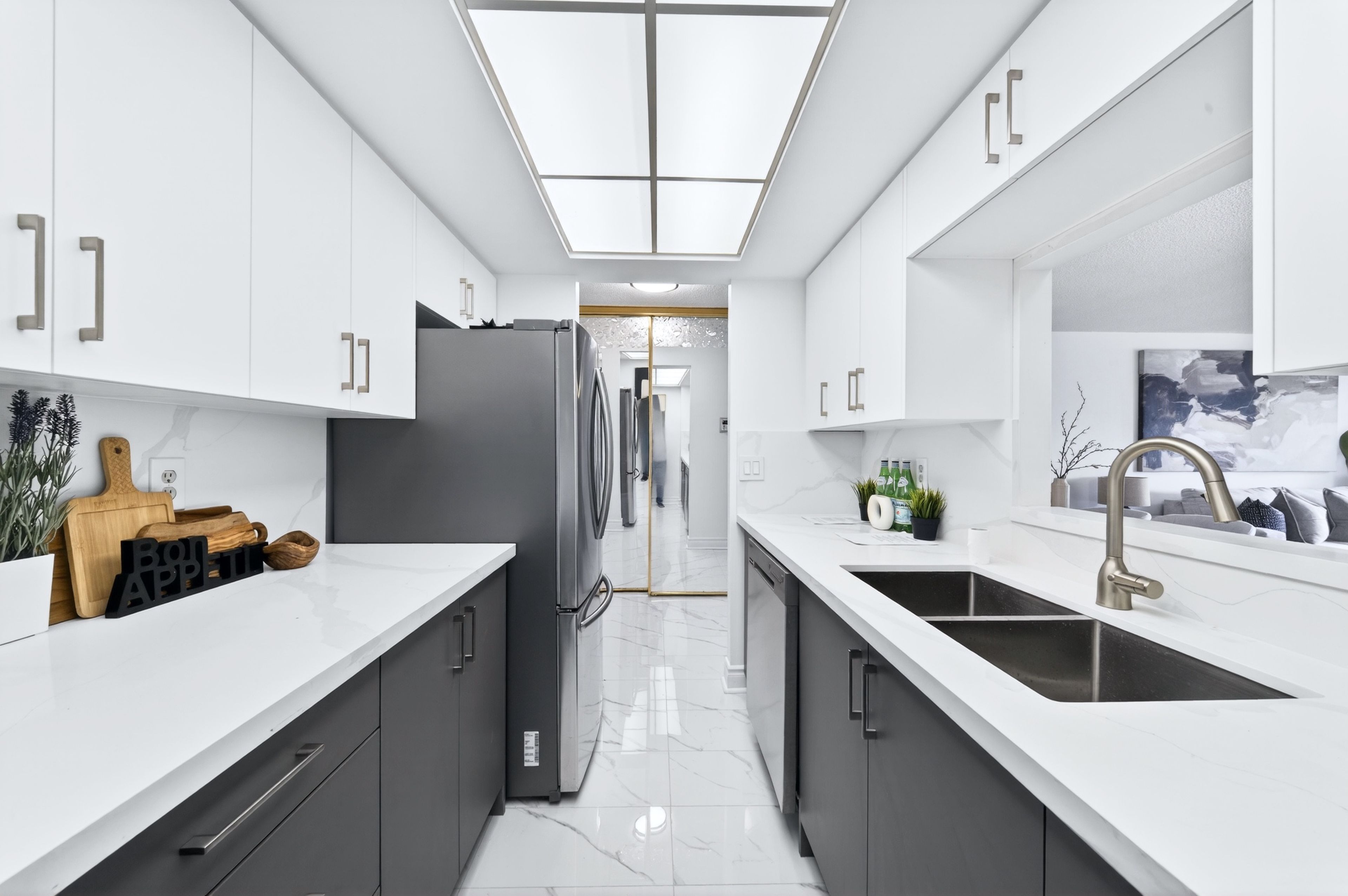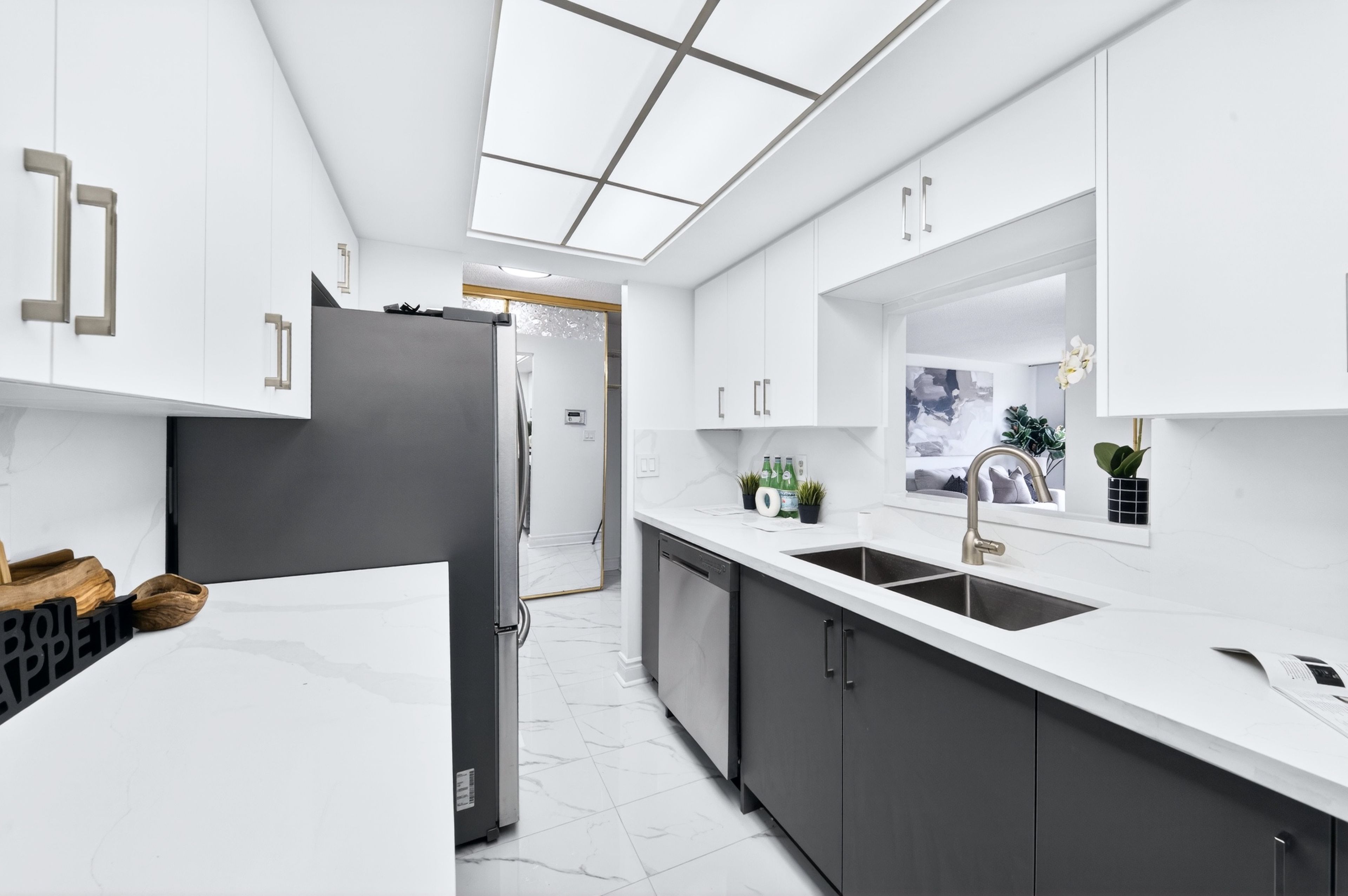 • Newly updated kitchen with modern cabinetry and ample counter space.