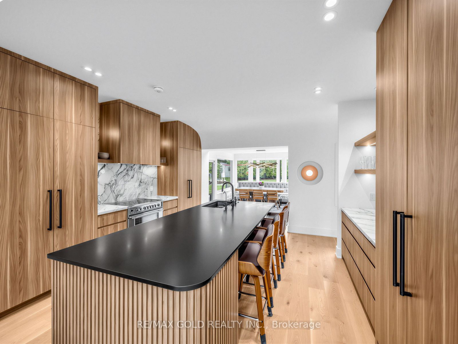 • Custom kitchen with a large island and built-in coffee and bar station.