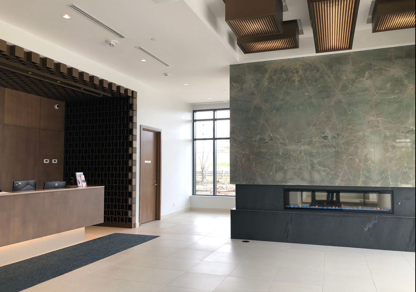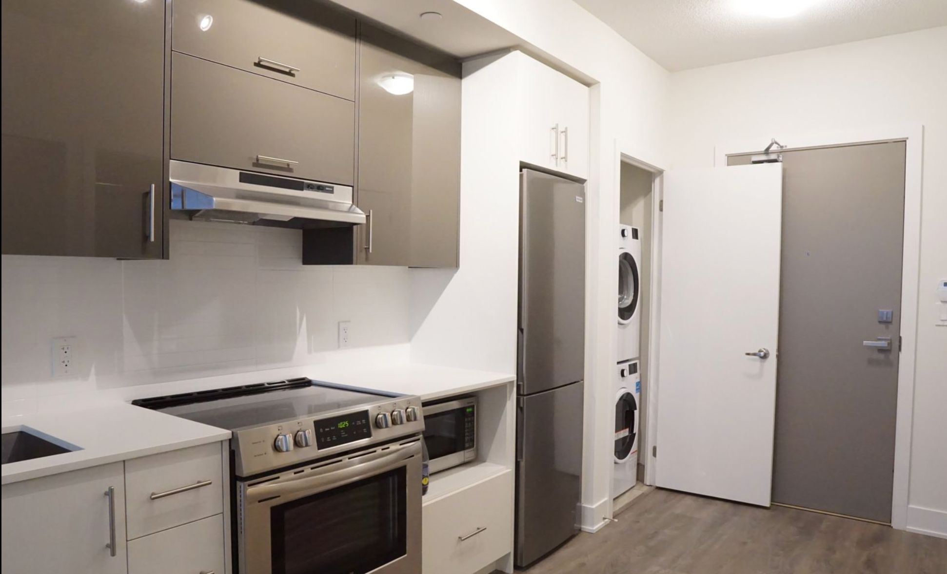 • Modern kitchen with stainless appliances and quartz countertop.