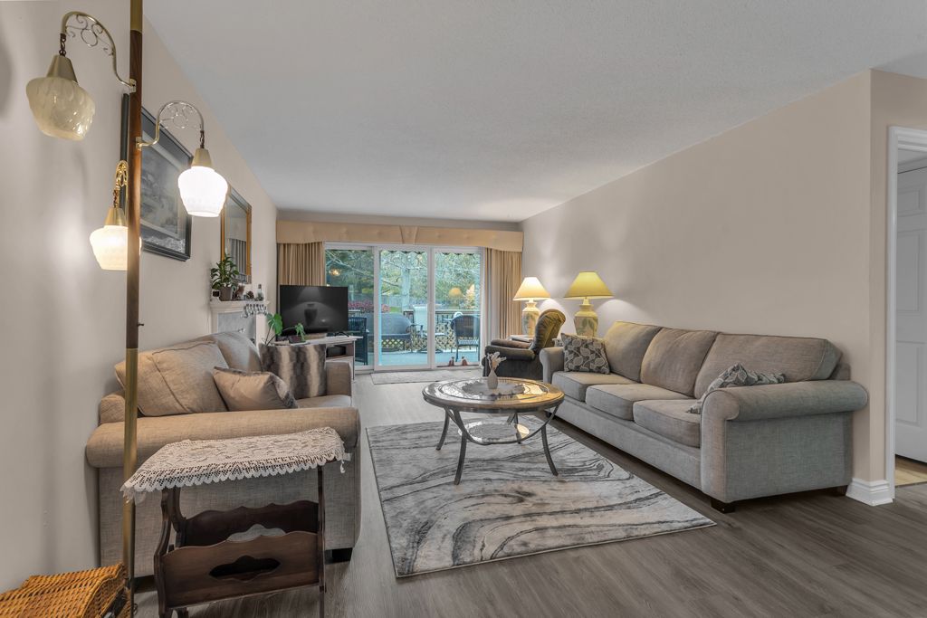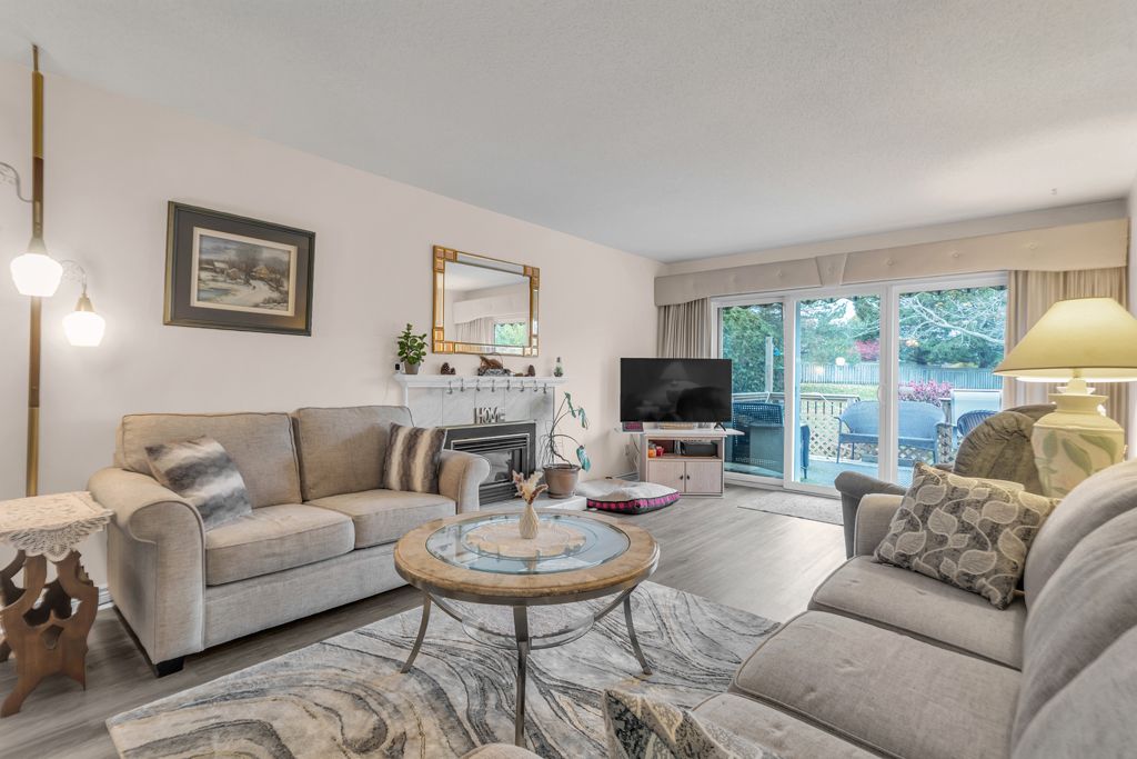 • Bright living room leads to an oversized deck overlooking green space.