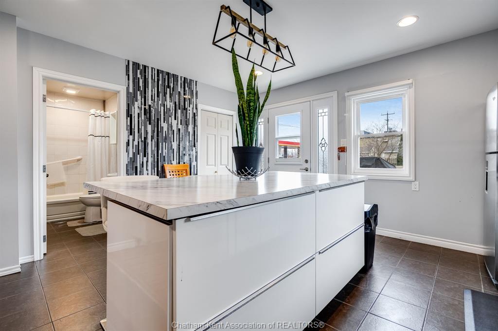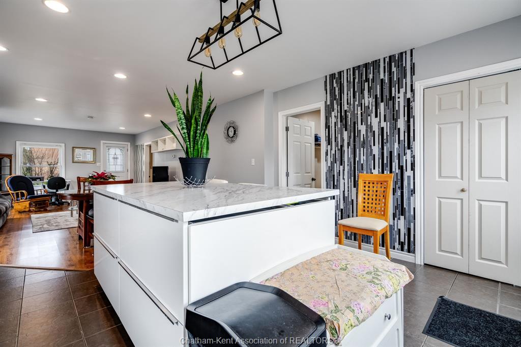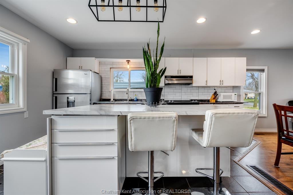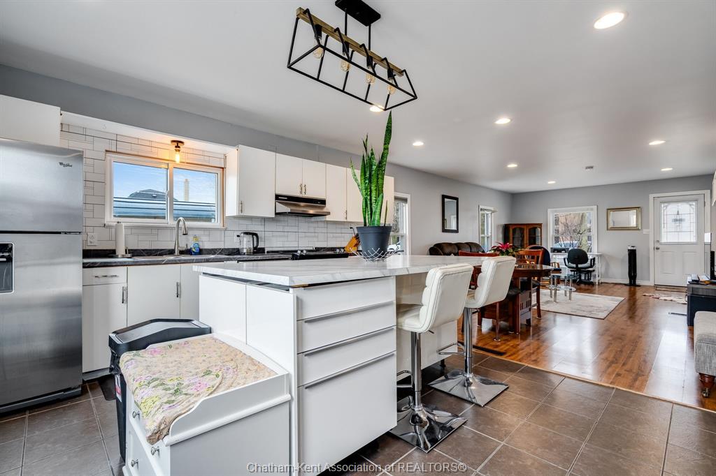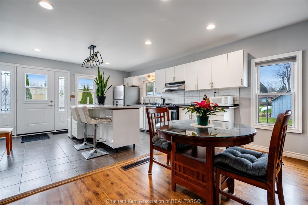 Welcome to 5 dufferin, ideally located in the heart of tilbury on an impressive double-wide lot measuring approximately 90' x 124'. This charming, move-in ready home features updated main-floor living with a modern open-concept layout. The stylish kitchen, complete with an eat-in island, seamlessly flows into the dining and family rooms, creating a bright and inviting space perfect for everyday living and entertaining. Step through the patio doors to a spacious sundeck overlooking your expansive lot - an ideal spot to relax and enjoy your morning coffee. Perfect for both first-time home buyers and retirees, this home offers comfort, convenience, and easy living. Ideally situated close to all amenities and with quick access to hwy 401.