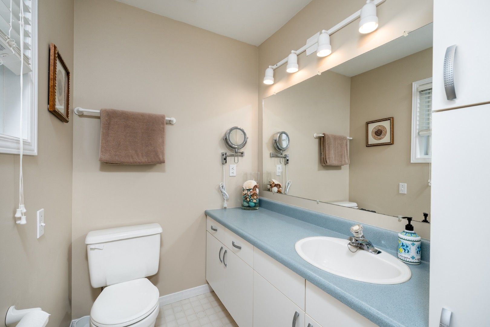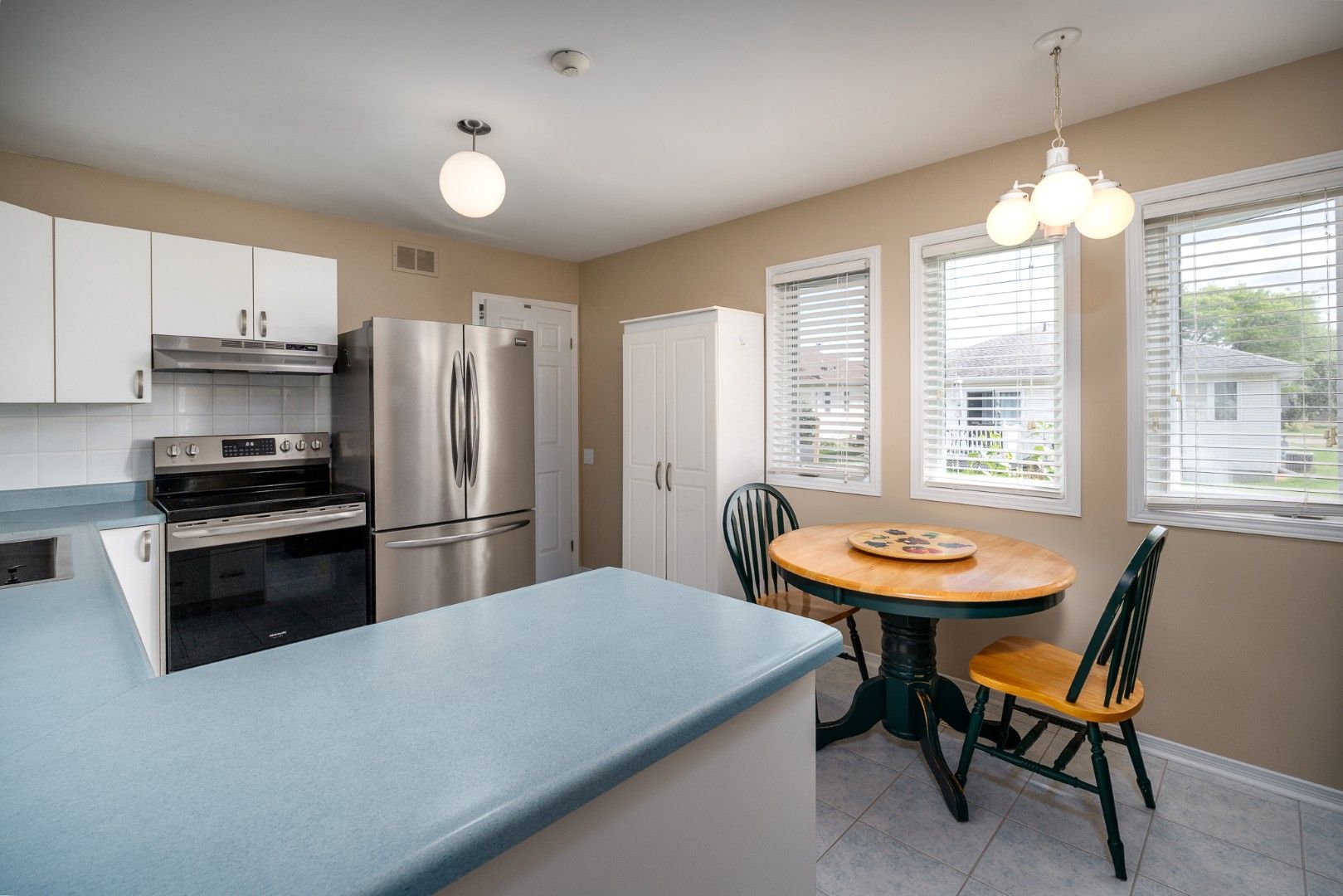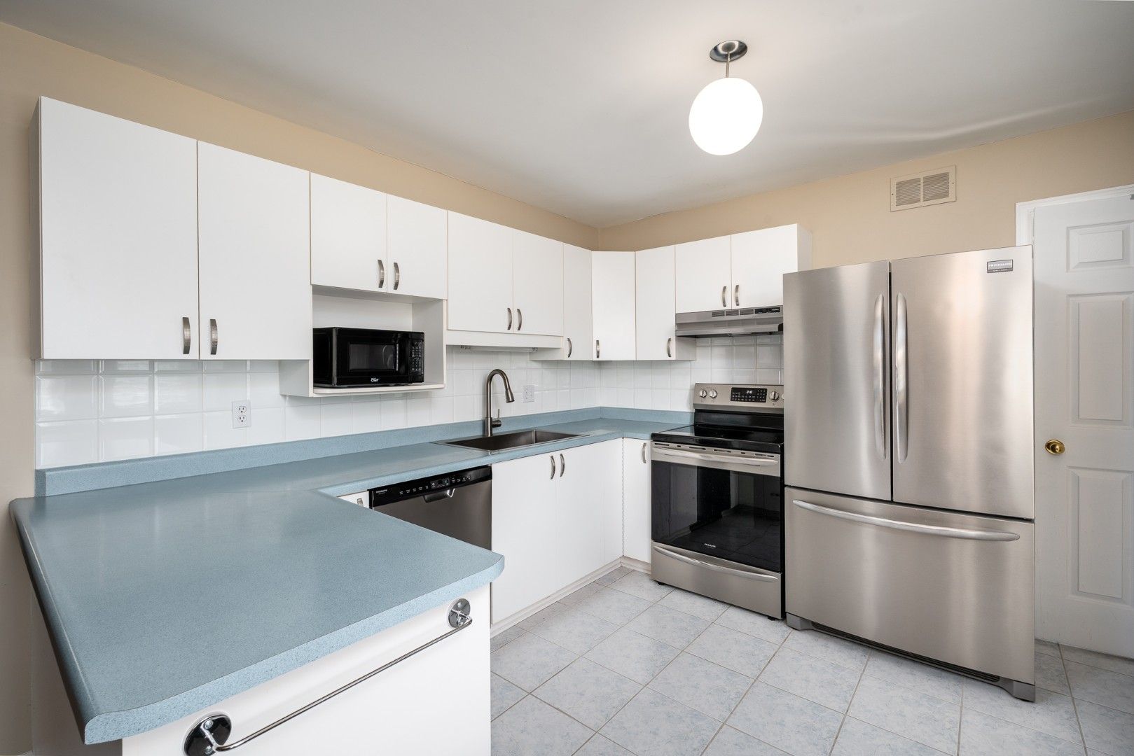 • Bright kitchen with newer stainless-steel appliances and white cabinetry.