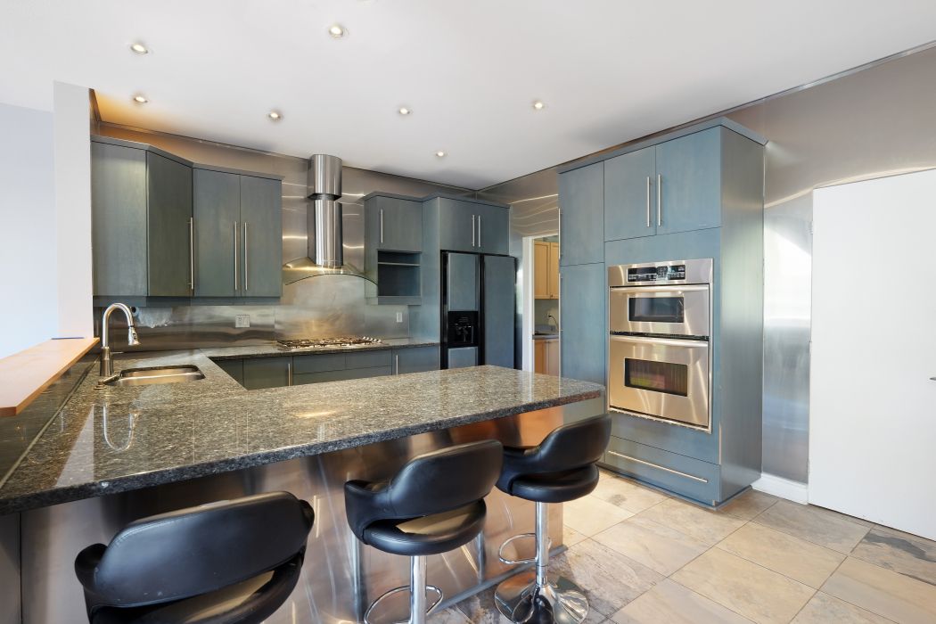 • Open-concept kitchen with large eat-in area and island seating.