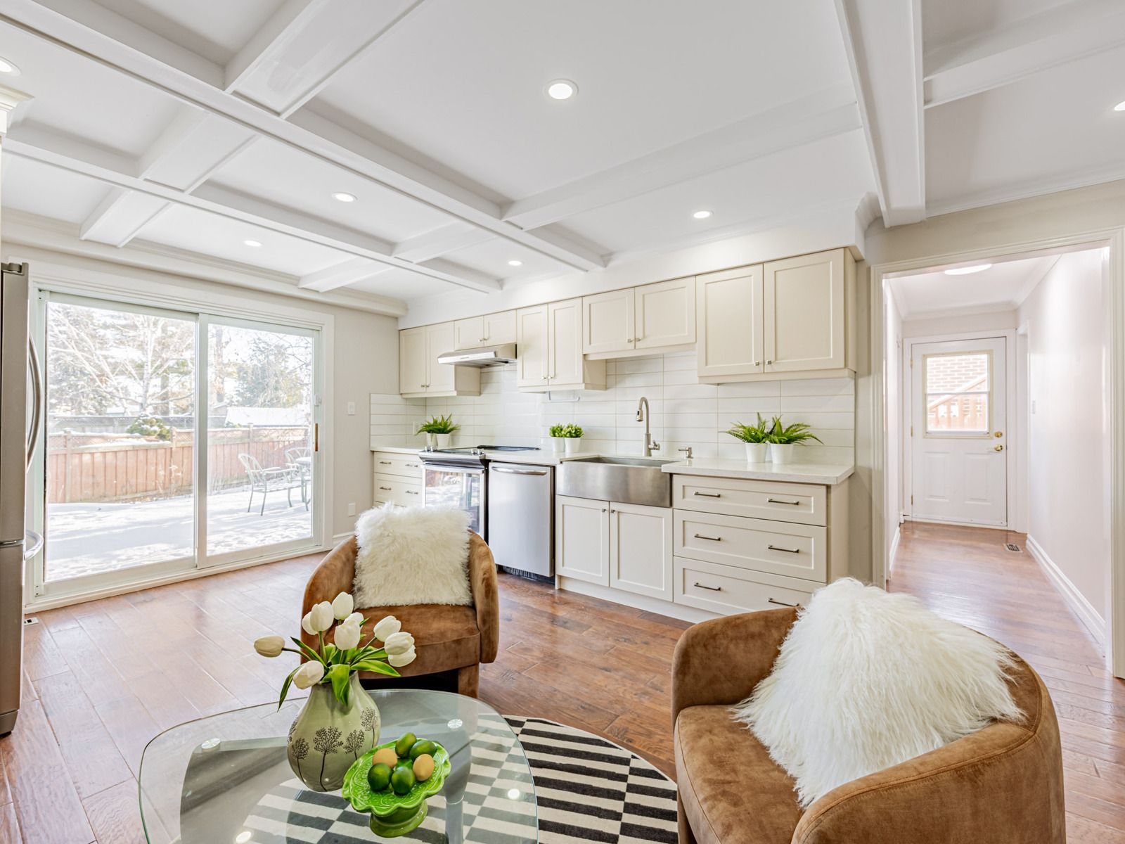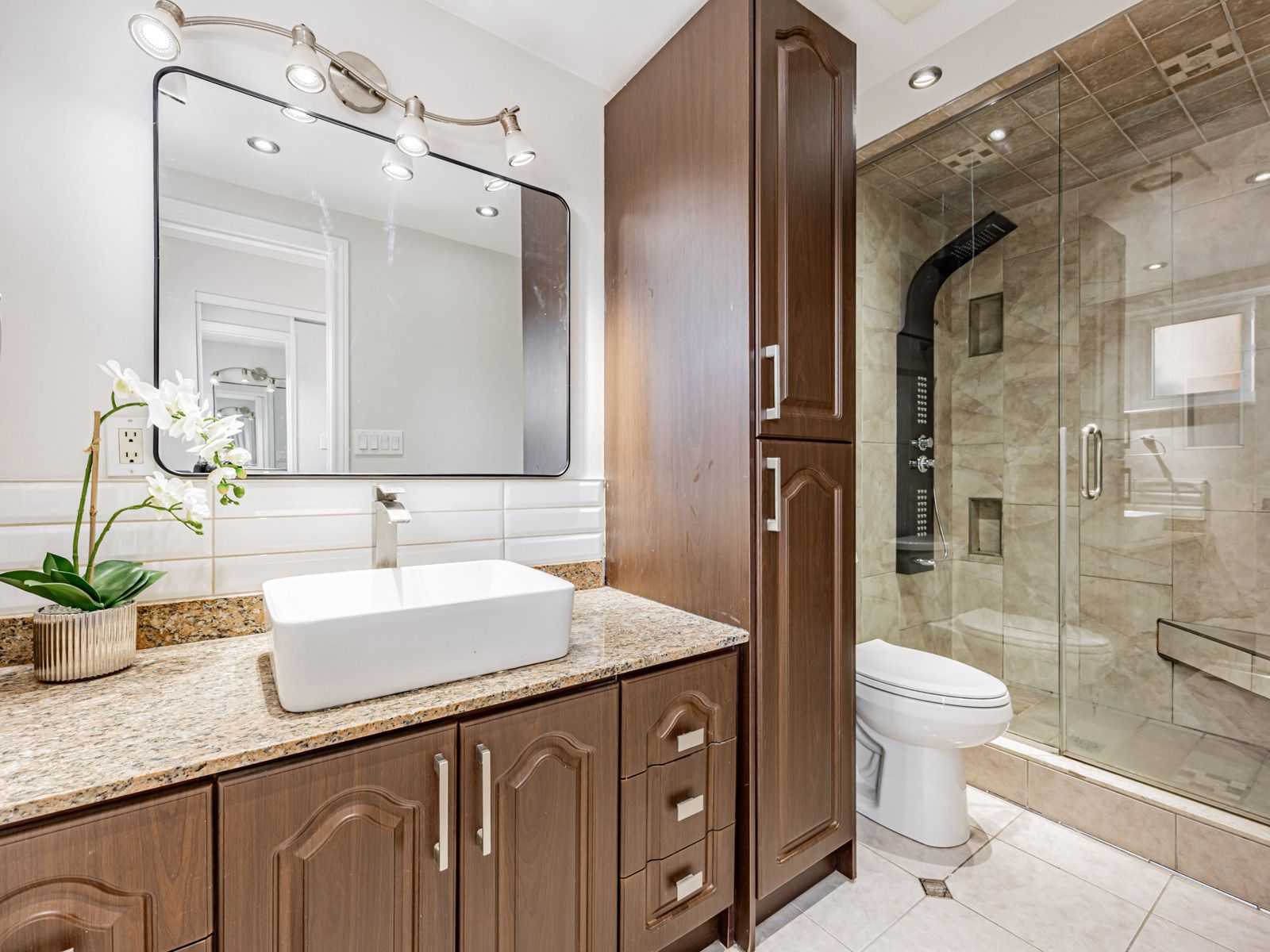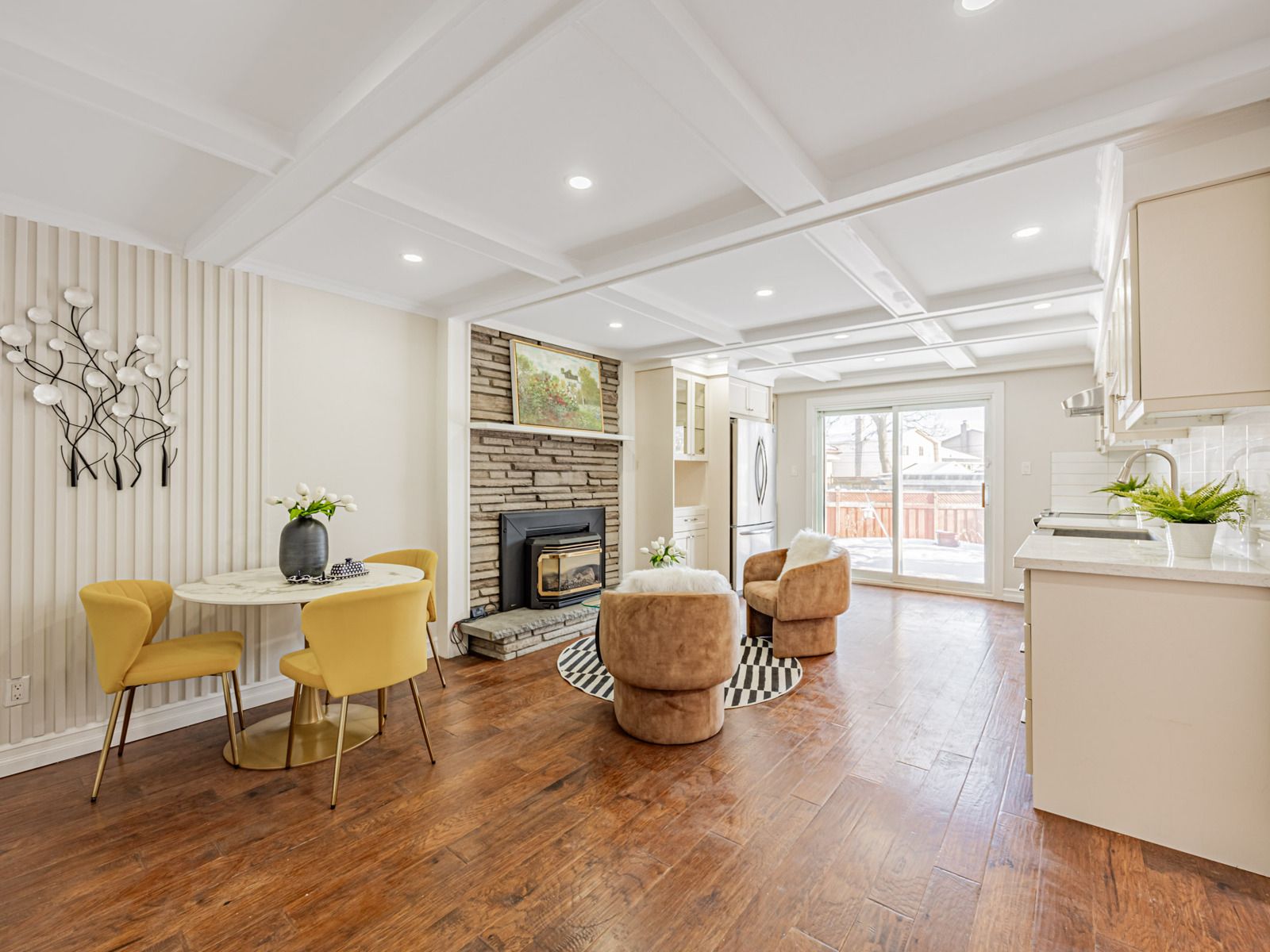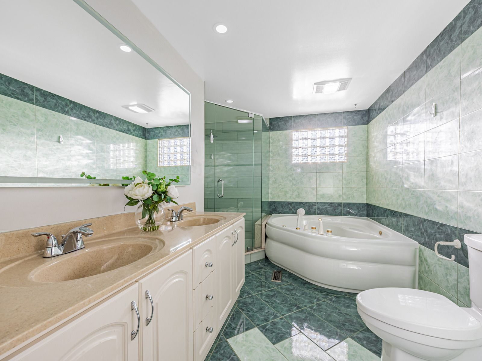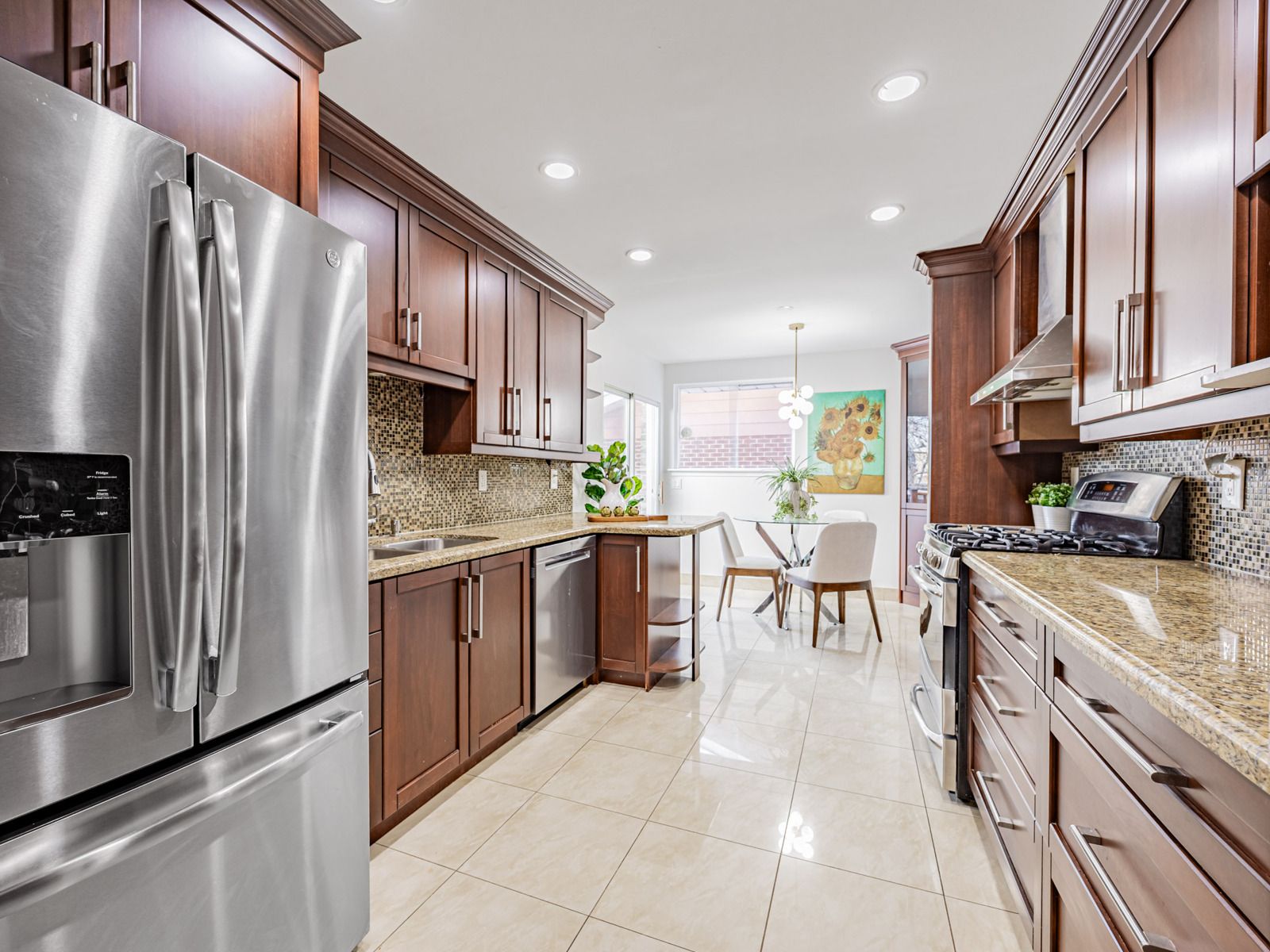 • Two spacious eat-in kitchens featuring modern appliances and stone countertops.