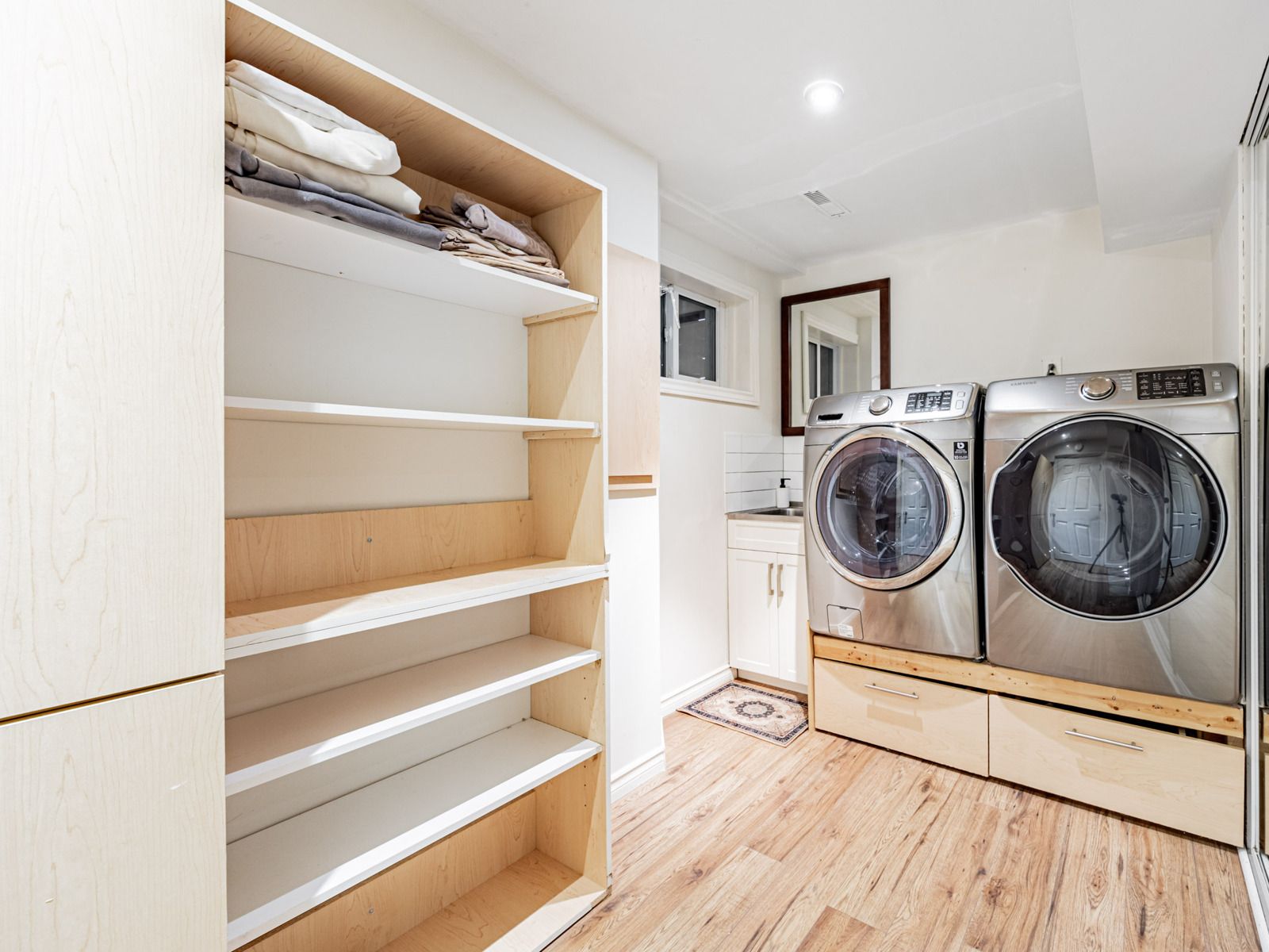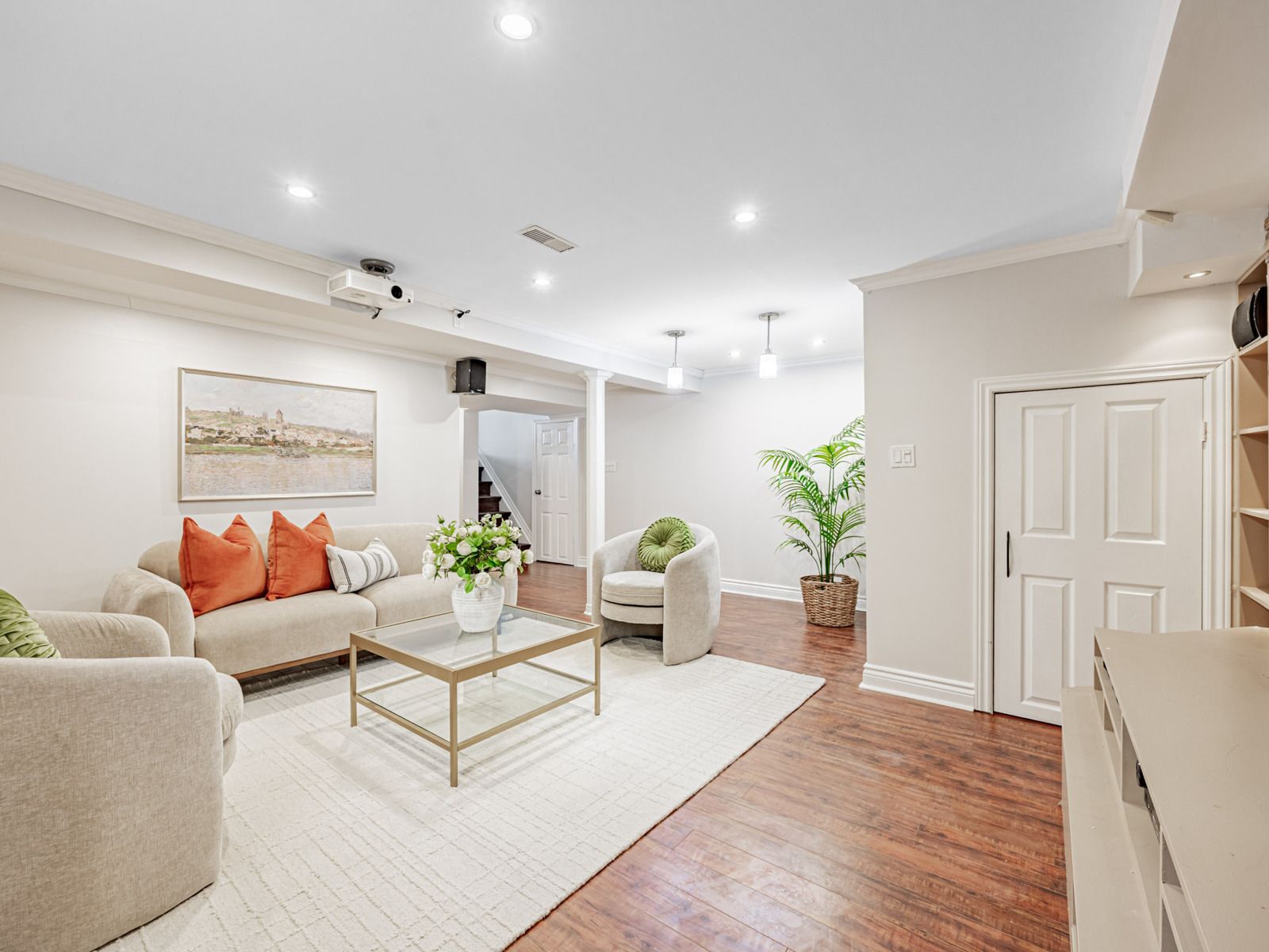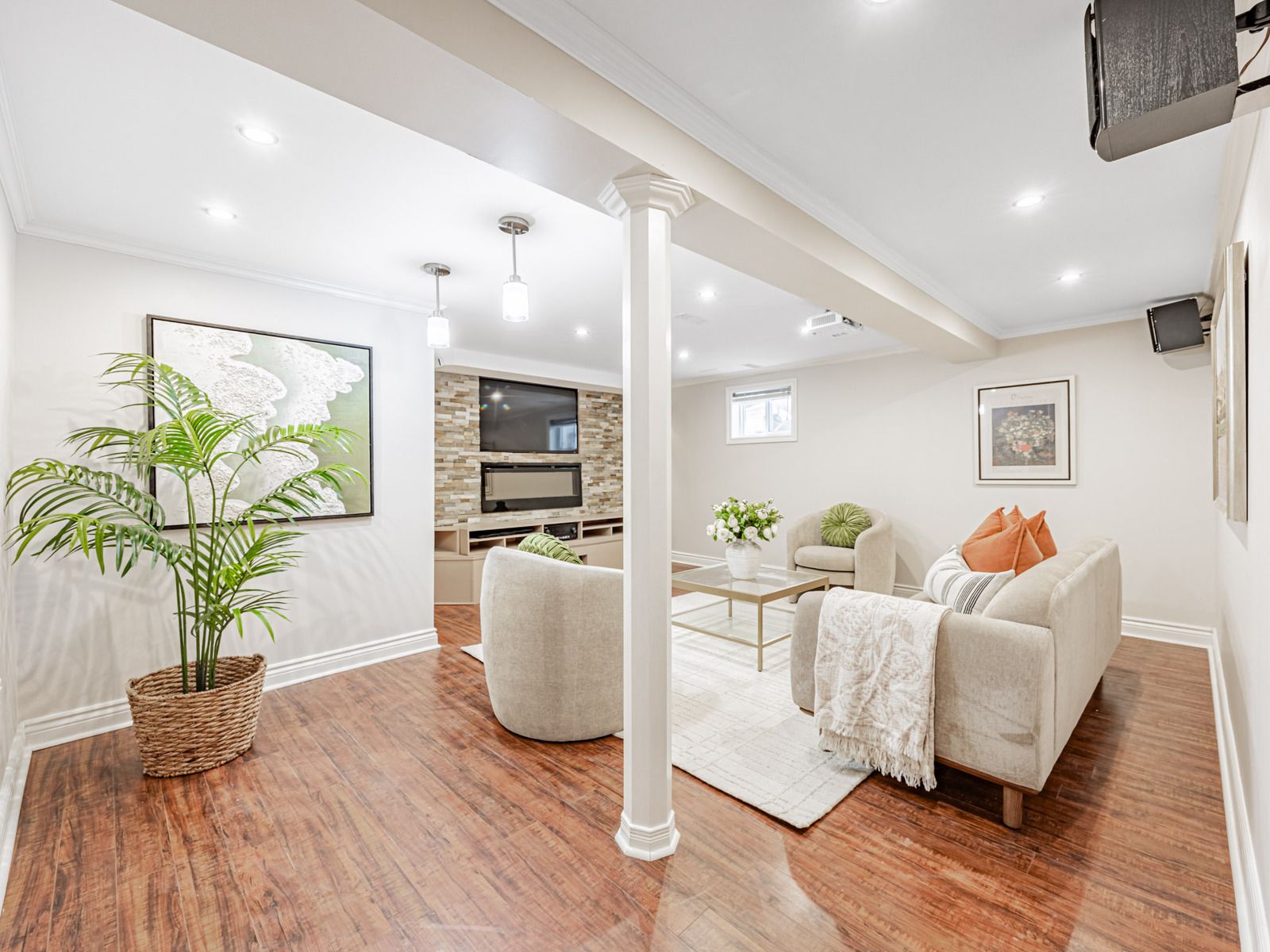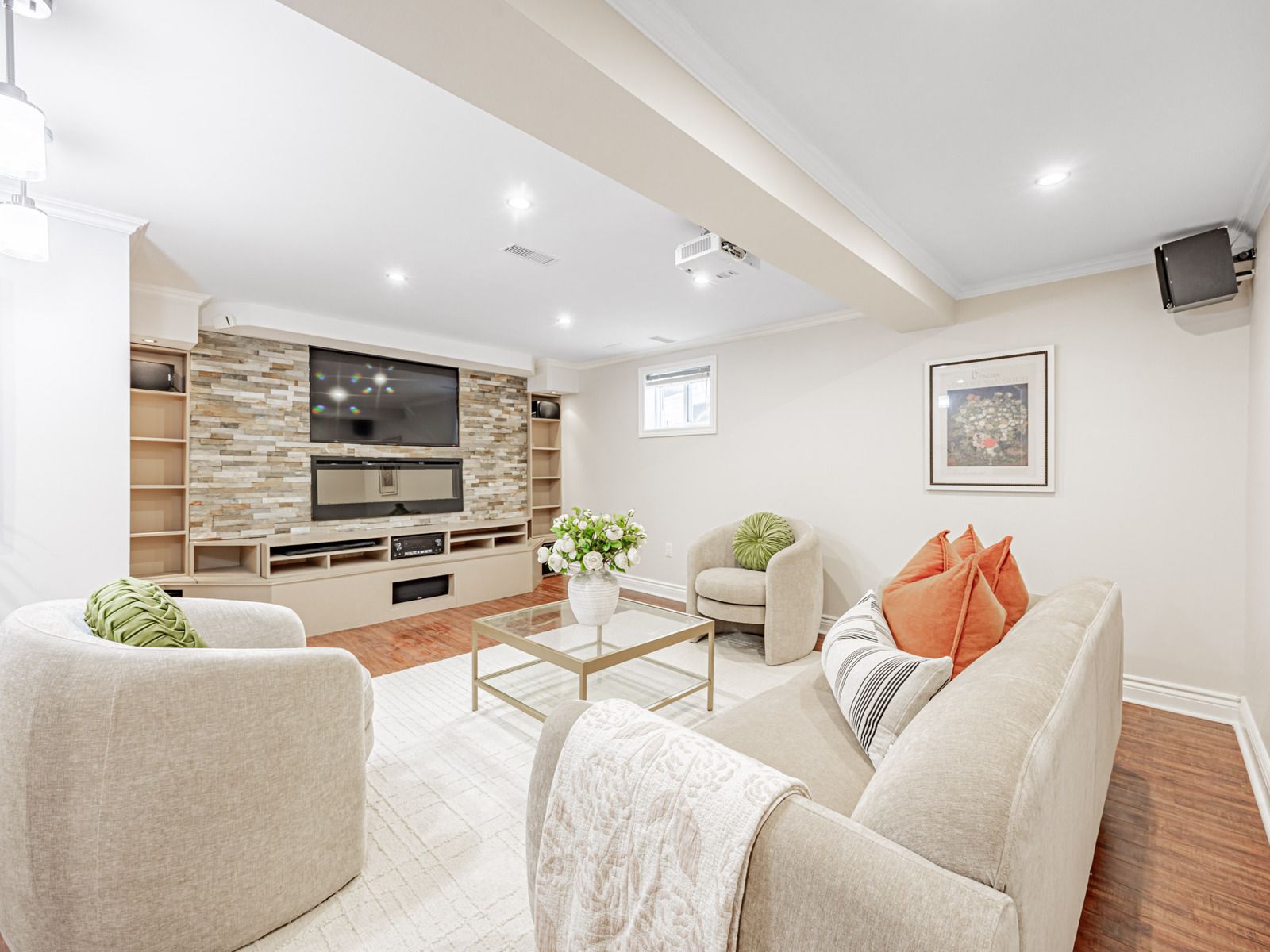 • Finished basement with a home theatre and built-in entertainment features.