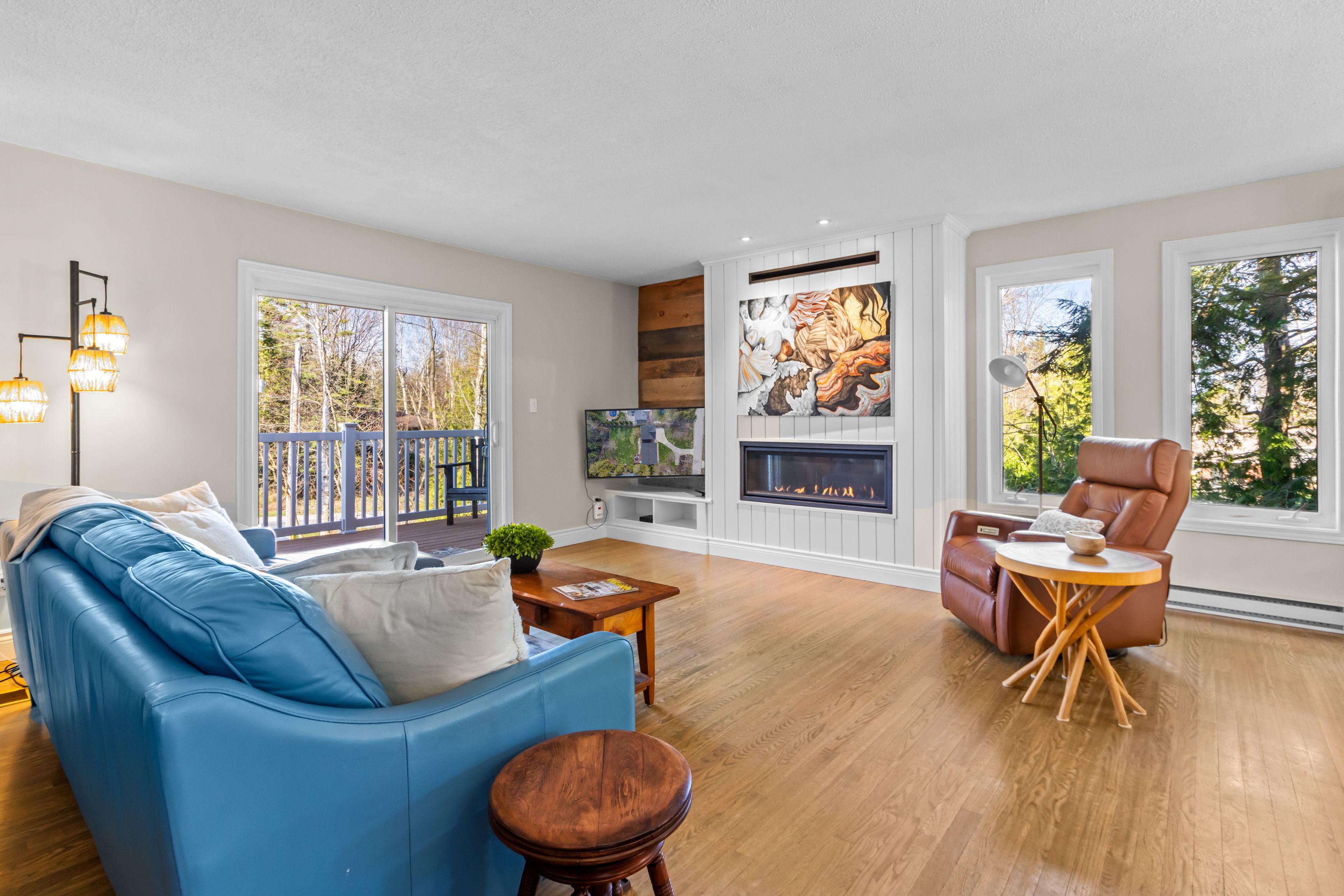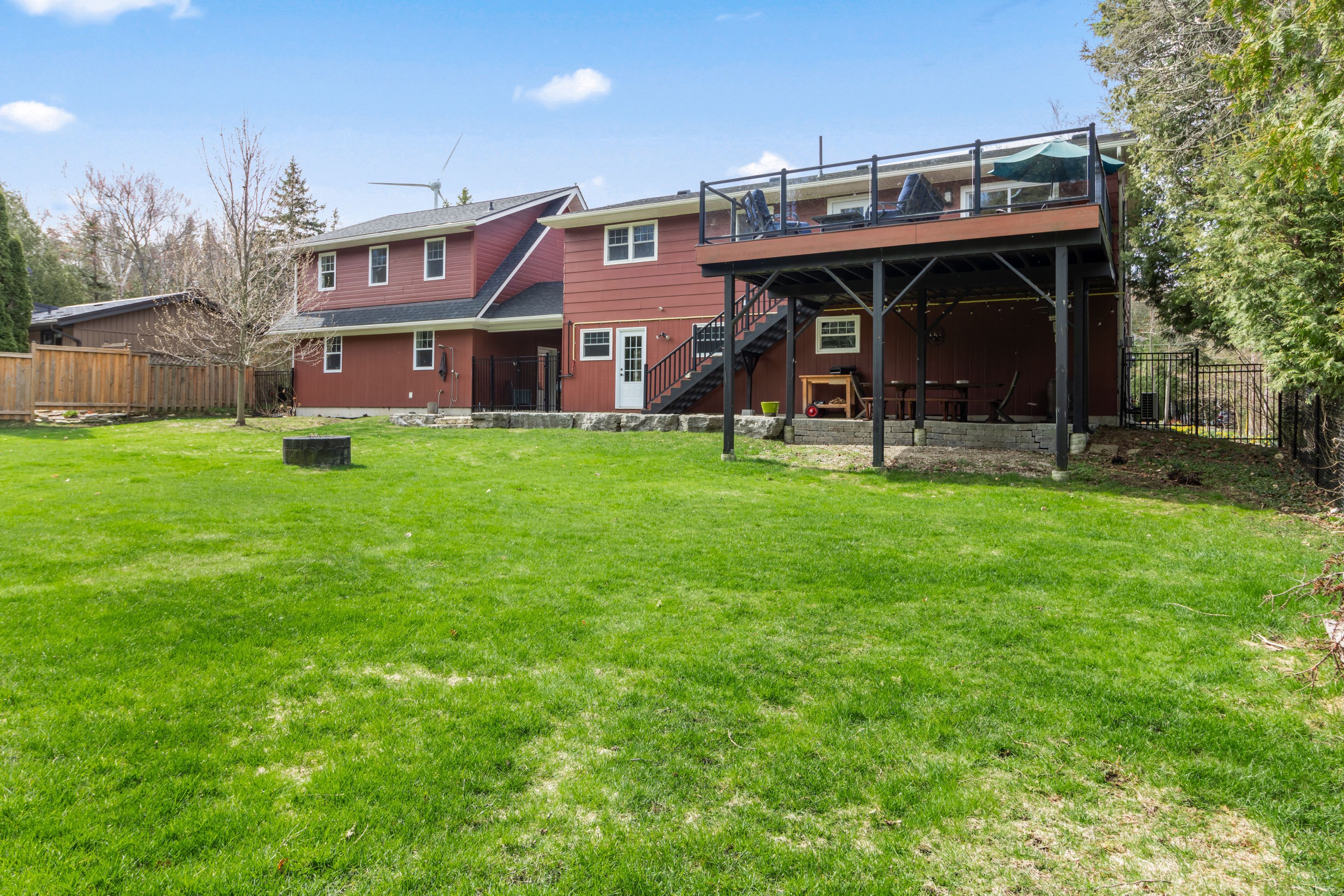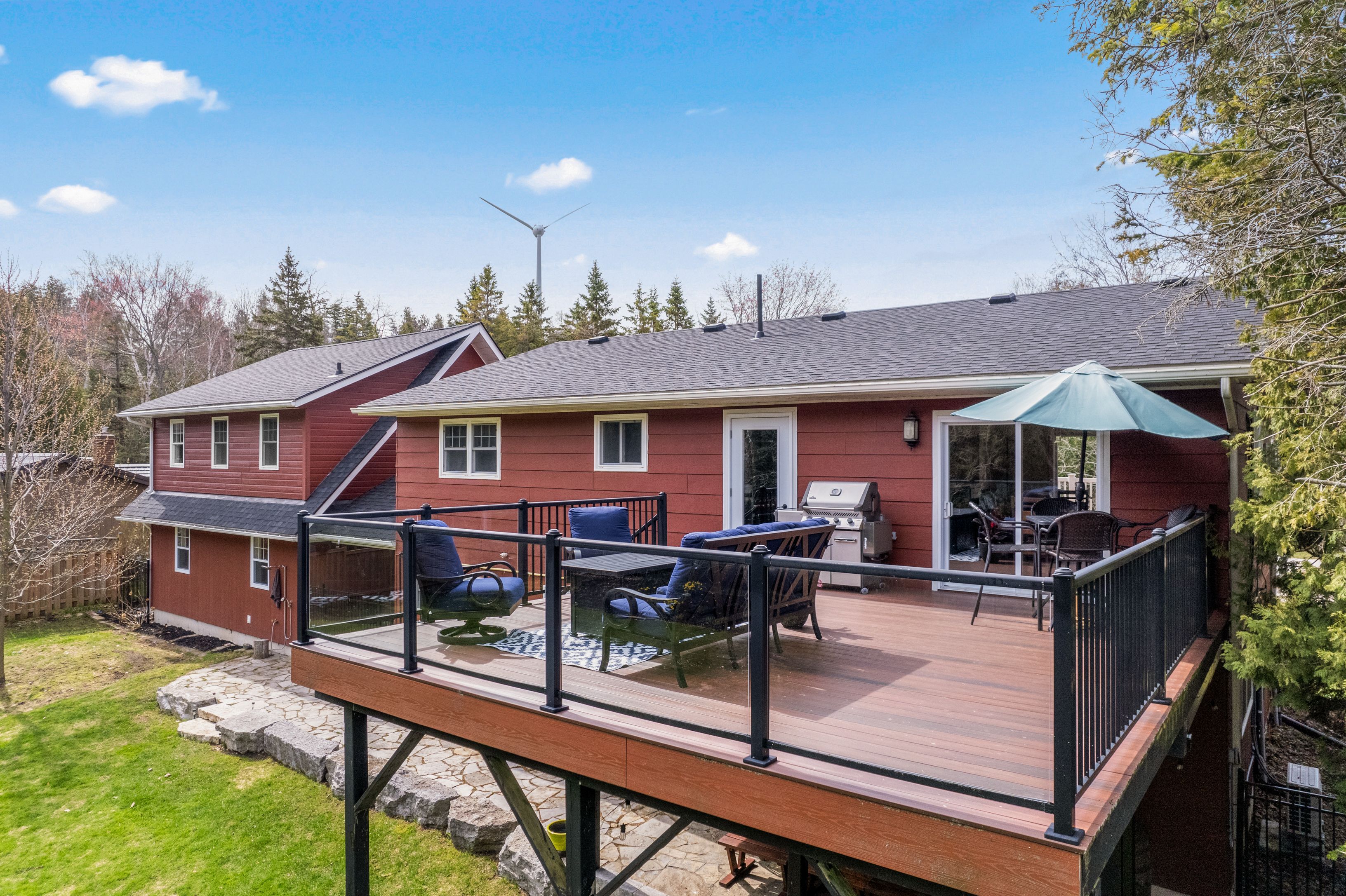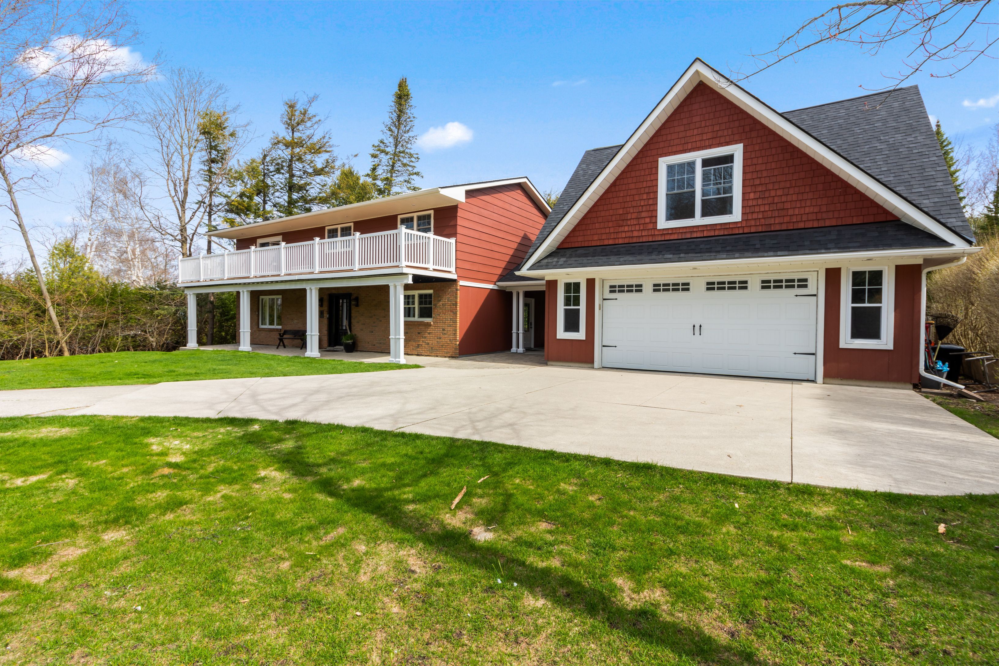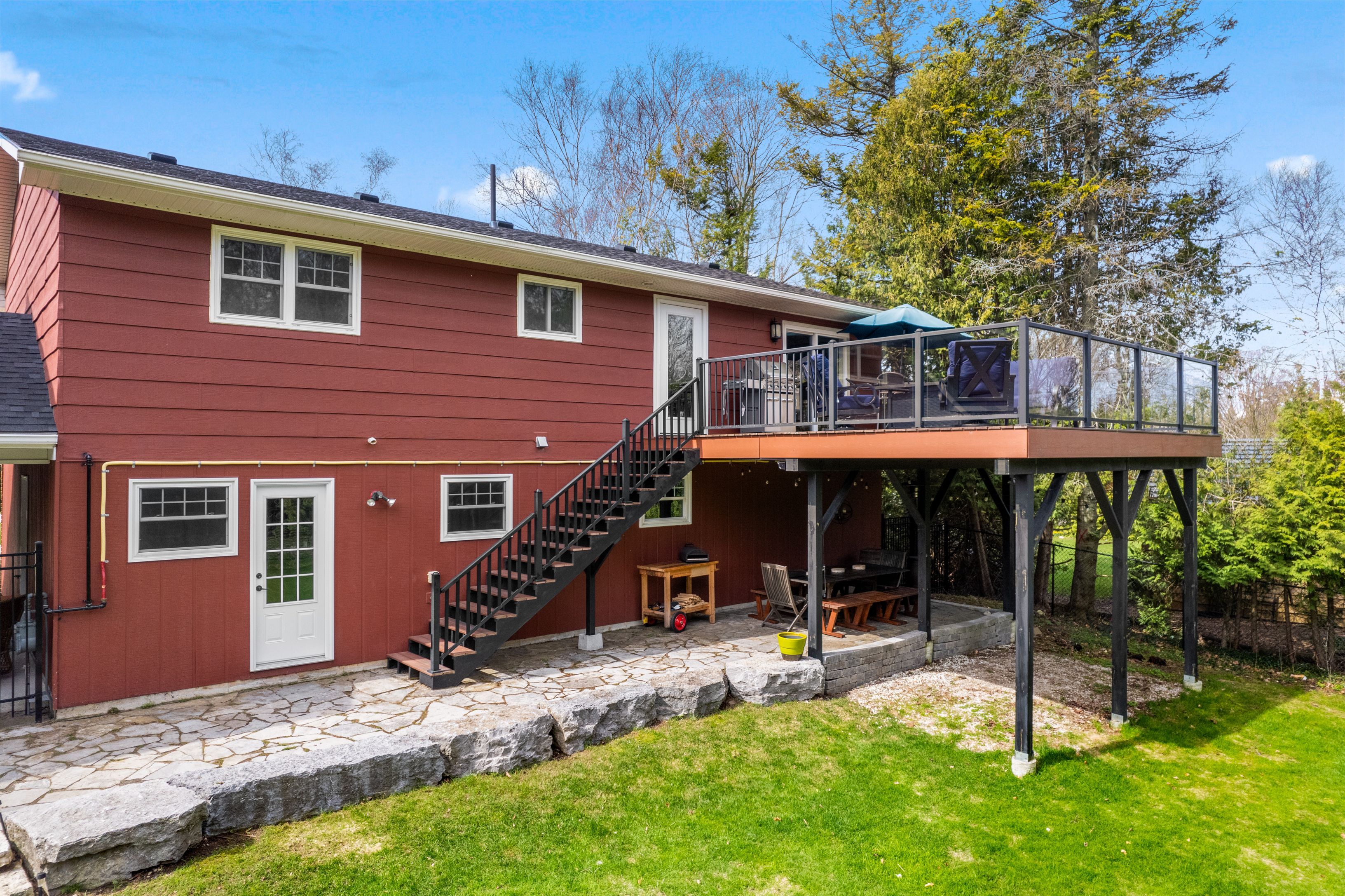 A distinctive raised bungalow in one of saugeen shores' most desirable pockets, just a short 3-minute walk to the sandy shores of gobles beach. Set on a beautifully private 100 x 215 ft lot backing onto mature trees, this property offers a rare blend of space, privacy, and lifestyle. The upper level showcases a bright, open-concept living, dining, and kitchen area designed for both everyday living and effortless entertaining. Step out to the expansive rear deck with sleek glass railings that frame the natural surroundings, along with a second elevated patio at the front of the home. The updated kitchen features rich cabinetry, quartz countertops, stainless steel appliances, and a wolf gas stove. The living room is anchored by a modern gas fireplace with shiplap detailing, while large windows throughout fill the space with natural light. This level also offers three well-sized bedrooms and a stylishly updated bathroom with double sinks and a generous walk-in shower. On the main floor, you'll find additional versatile living space including a large bedroom, a second bedroom or flex room currently used as a fitness area, and a cozy family room with a european-style gas fireplace-perfect for relaxed evenings. The thoughtfully designed bathroom combines patterned tile, classic subway tile, and wallpaper accents, creating a space that feels both timeless and refined. A functional mudroom, main floor laundry, and direct access to the oversized double garage complete this level. Above the garage, a separate approximately 650 sqft suite offers exceptional flexibility with its own kitchen, bathroom, bedroom, and living space-ideal for guests, extended family, or potential income. With over 2,900 sqft of living space, a serene treed backdrop, and port elgin downtown just minutes away, this is an opportunity to enjoy a more relaxed, coastal lifestyle in a quiet, established setting. Be sure to book your private showing today.