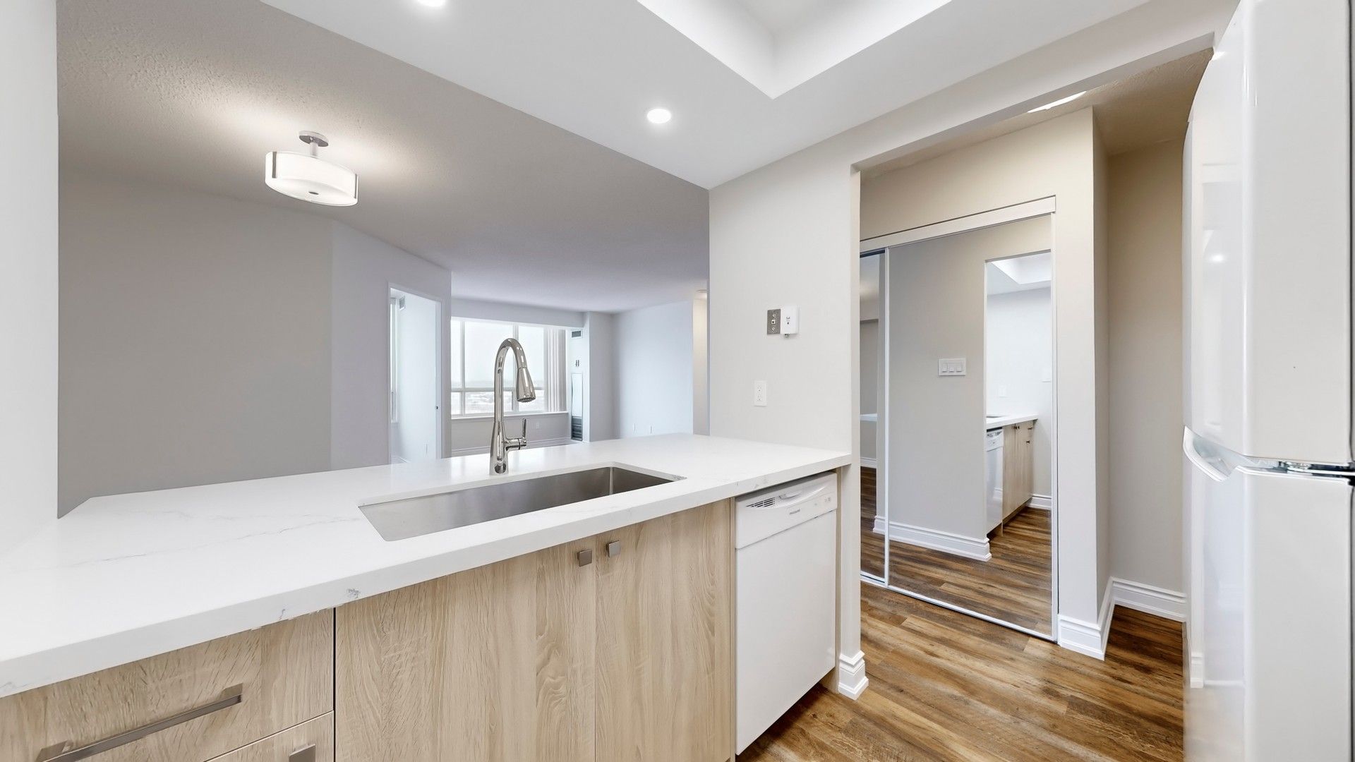Bright and spacious, this hidden gem offers an exceptional layout and scenic views within a prestigious tridel gated community in a highly sought-after toronto east location. This beautifully renovated two-bedroom residence features a thoughtfully designed split-bedroom floor plan and a generously sized open-concept living and dining area, ideal for both everyday living and entertaining. The modern kitchen is equipped with quartz countertops and backsplash, newer appliances, and a convenient breakfast bar. Additional highlights include a stylishly updated bathroom, new vinyl flooring throughout, potlights and upgraded light fixtures. The elegant primary bedroom provides a tranquil retreat with ample closet space and a semi-ensuite bathroom. Residents enjoy outstanding amenities, including a gated security entrance, indoor swimming pool, a fully equipped fitness centre, sauna, games and media rooms, as well as squash and tennis courts. Enjoy unparalleled convenience with easy access to the ttc, go train, and a nearby shopping mall. Condo fees include heat, hydro, and water. One parking space is included.