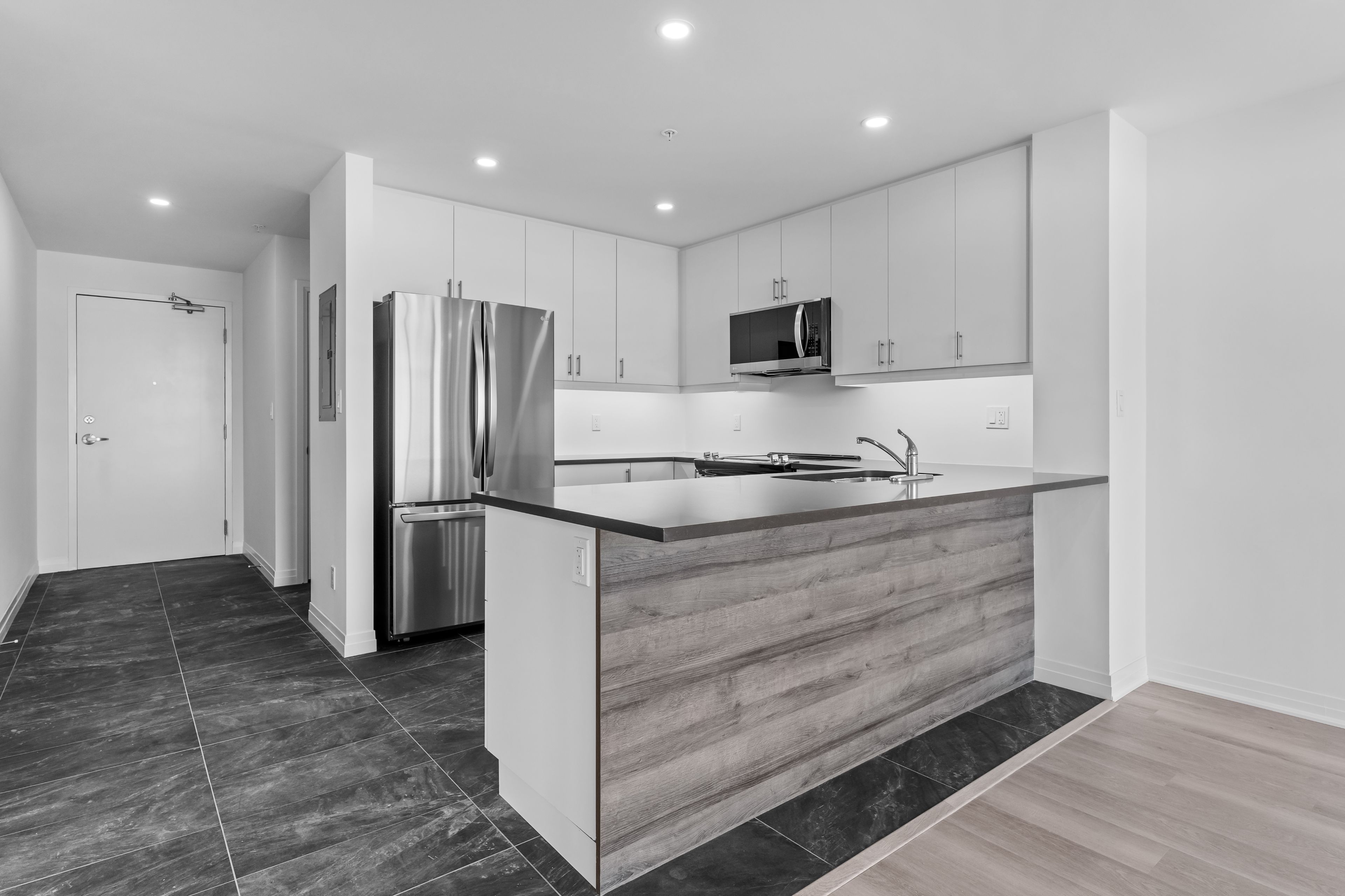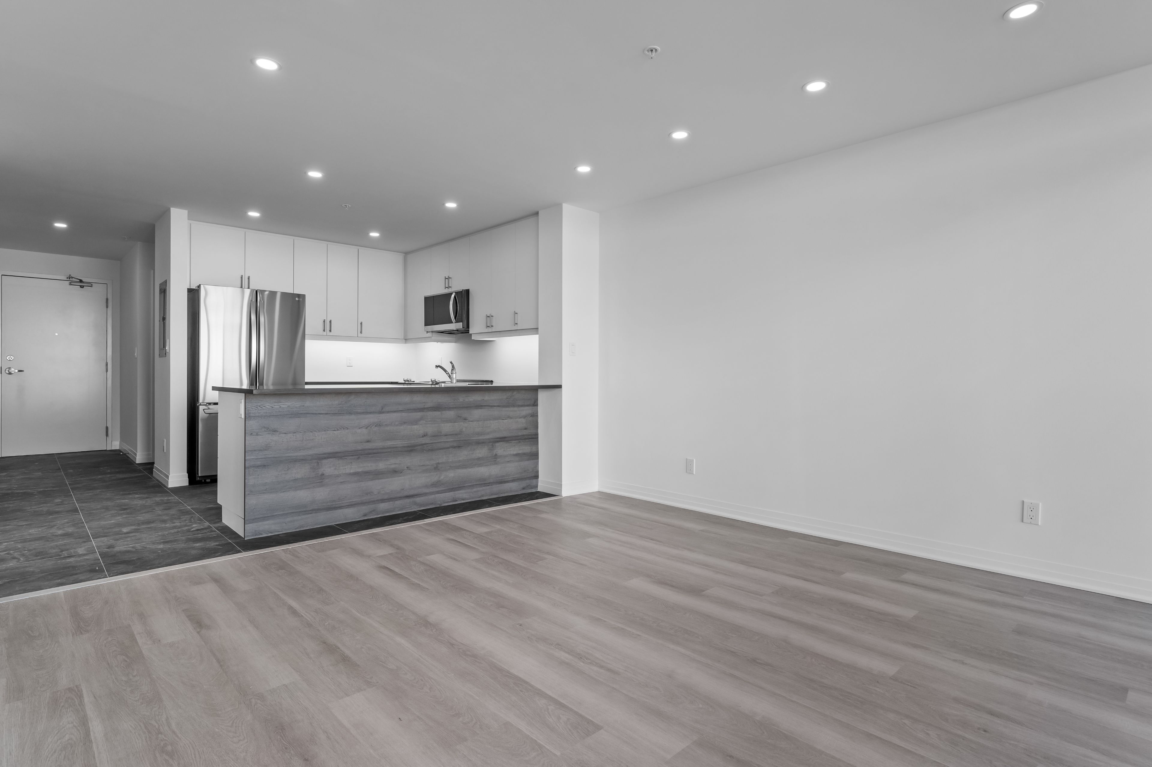 Beautiful corner unit condo, 882 sf with fabulous views! "the bourbon" model. Newer construction, one bedroom plus den. Two bathrooms. Large open kitchen with breakfast bar, quartz countertops and stainless steel appliances. Primary bedroom offers private access to balcony. In-suite laundry, laminate and ceramic flooring plus pot-lights. Two walk-outs to 120 sf balcony. Building has party room and visitor parking. Great location for commuting. Walk to downtown shops and restaurants, grocery stores, parks and many more amenities.