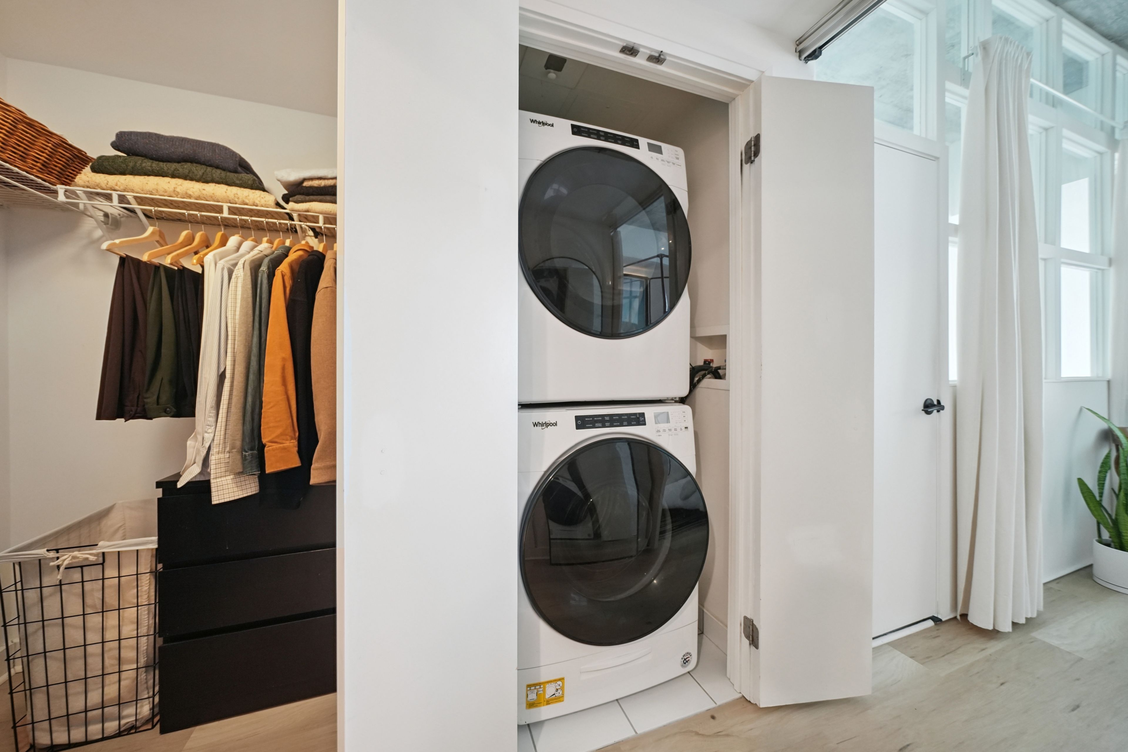 Rare, 2-storey 2 bedroom 775 sf loft with 1 parking at the prized liberty market lofts. Curated wood design accents throughout the unit add warmth and zen feel - this property has the aesthetic appeal of what a loft should be. It's located on the quieter, less dense side of liberty village and it features floor-to-ceiling windows that let in abundant natural light and showcase beautiful sunsets over top of the protected heritage-designated buildings surrounding it. An excellent use of space greets you at the door with custom fit hallway closets with a thoughtful setback to widen the entryway. An updated bathroom (tiles, mirror, lights, toilet) sits on the right and is followed by ample space under the stairs for storage or a perfect spot for a work desk. The open concept kitchen features an updated subway tile backsplash, built-in dishwasher and granite countertops. A recessed 2nd bedroom gives room to relax listening to the record player. Upstairs primary bedroom allows for genuine separation, ideal for couples or anyone wanting a comfortable live-work setup, while still preserving a sense of openness and view. The generous walk-in closet, 2nd floor laundry (w/ new whirlpool stacked washer/dryer) and updated bathroom (tiles, walls and toilet) complete the upstairs space. The building is exceptionally well-managed and has outstanding maintenance fees. Amenities include: 24 hour concierge, well-equipped gym, yoga studio and even a hard to find half basketball court. There are multiple executive meeting rooms, business centre, tool/utility room, lounge with a kitchen, wet bar and pool table. There is even an art gallery with rotating art installations. A 4900 sq. M. Park is being built beside the building that this unit will overlook and cafes, multiple grocery stores, pubs, professional services are all walkable. Go train (exhibition) and the future ontario line is 200 metres away and bmo field is right there too. Enjoy the world cup this summer from your doorstep!