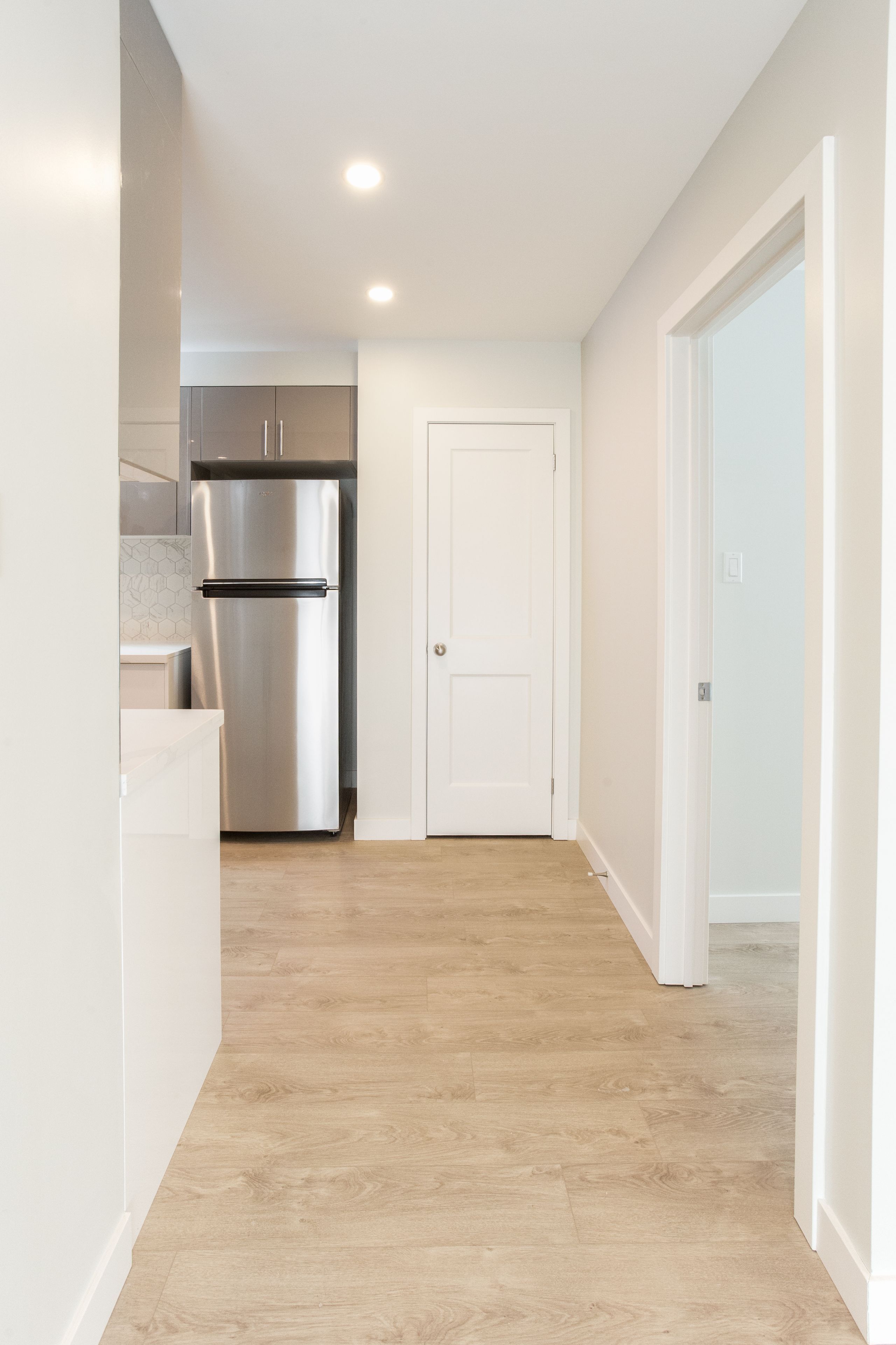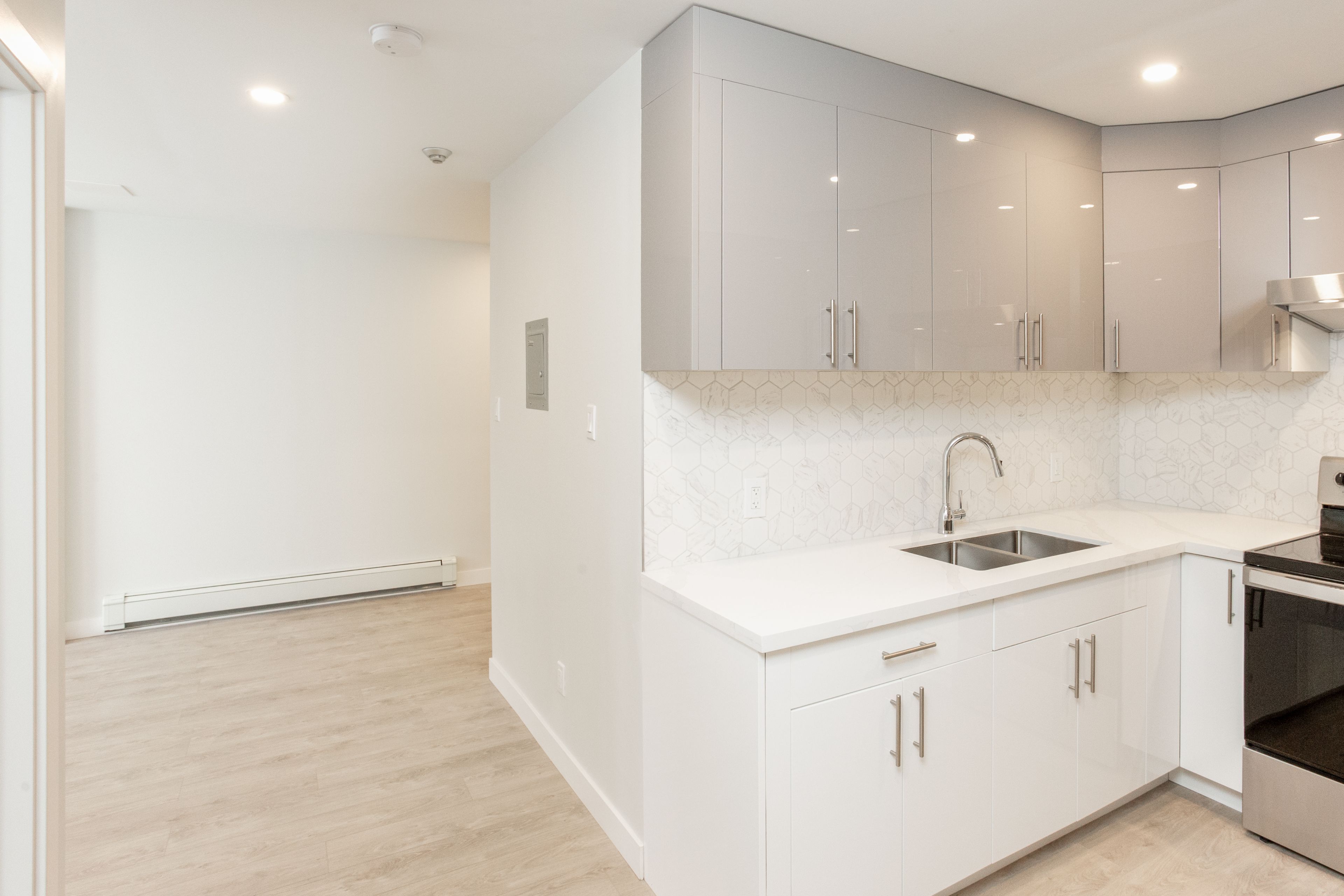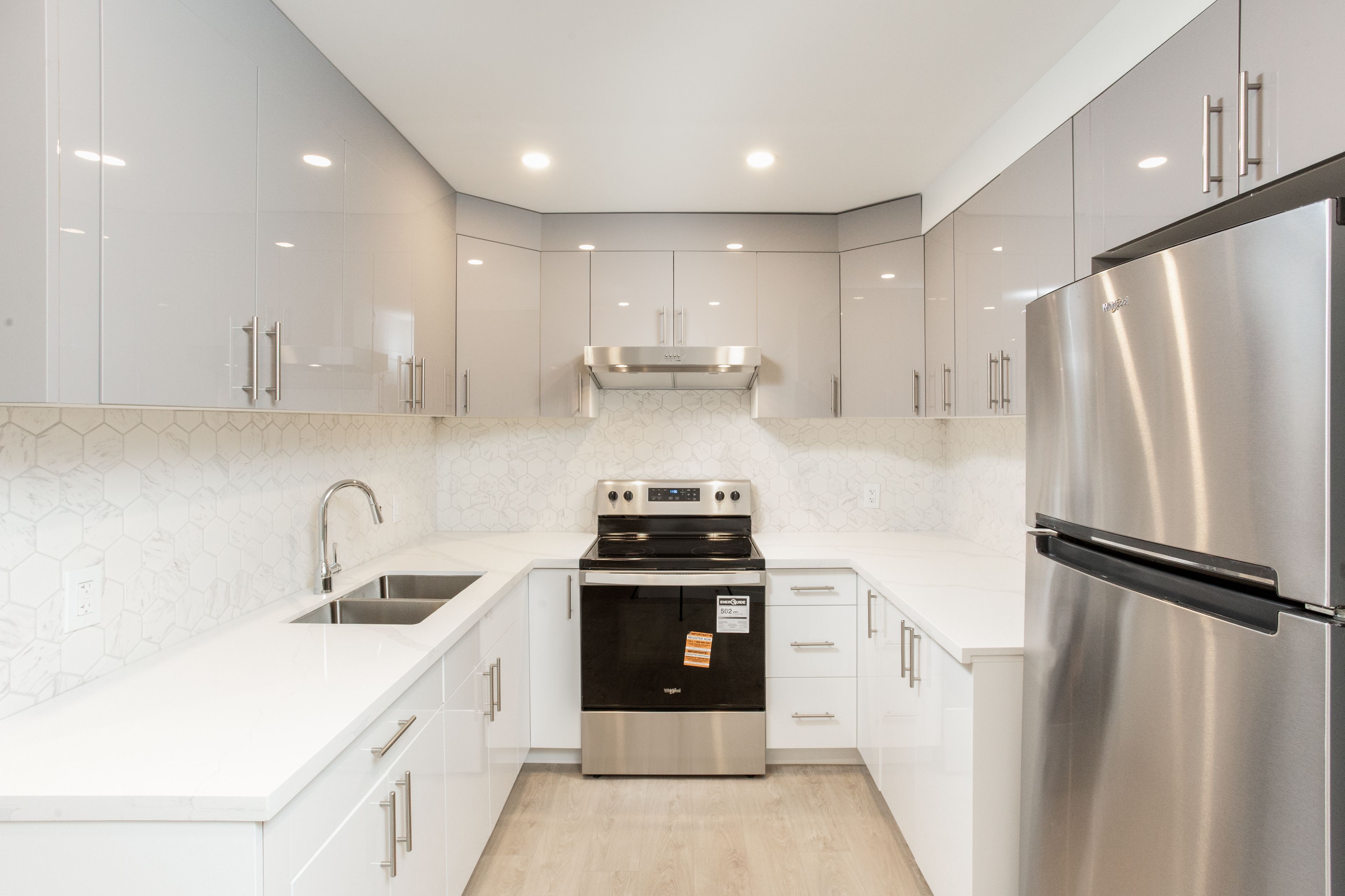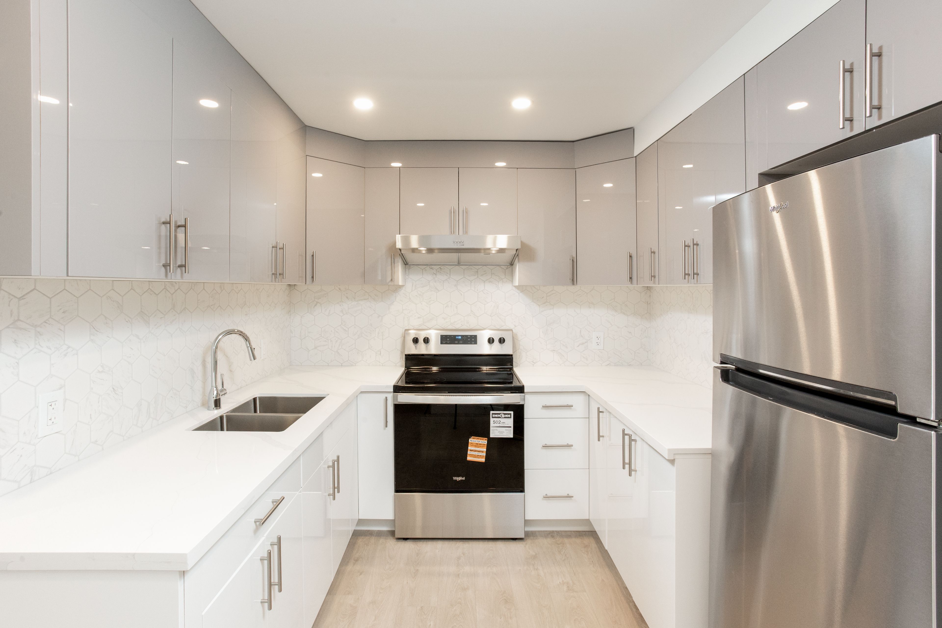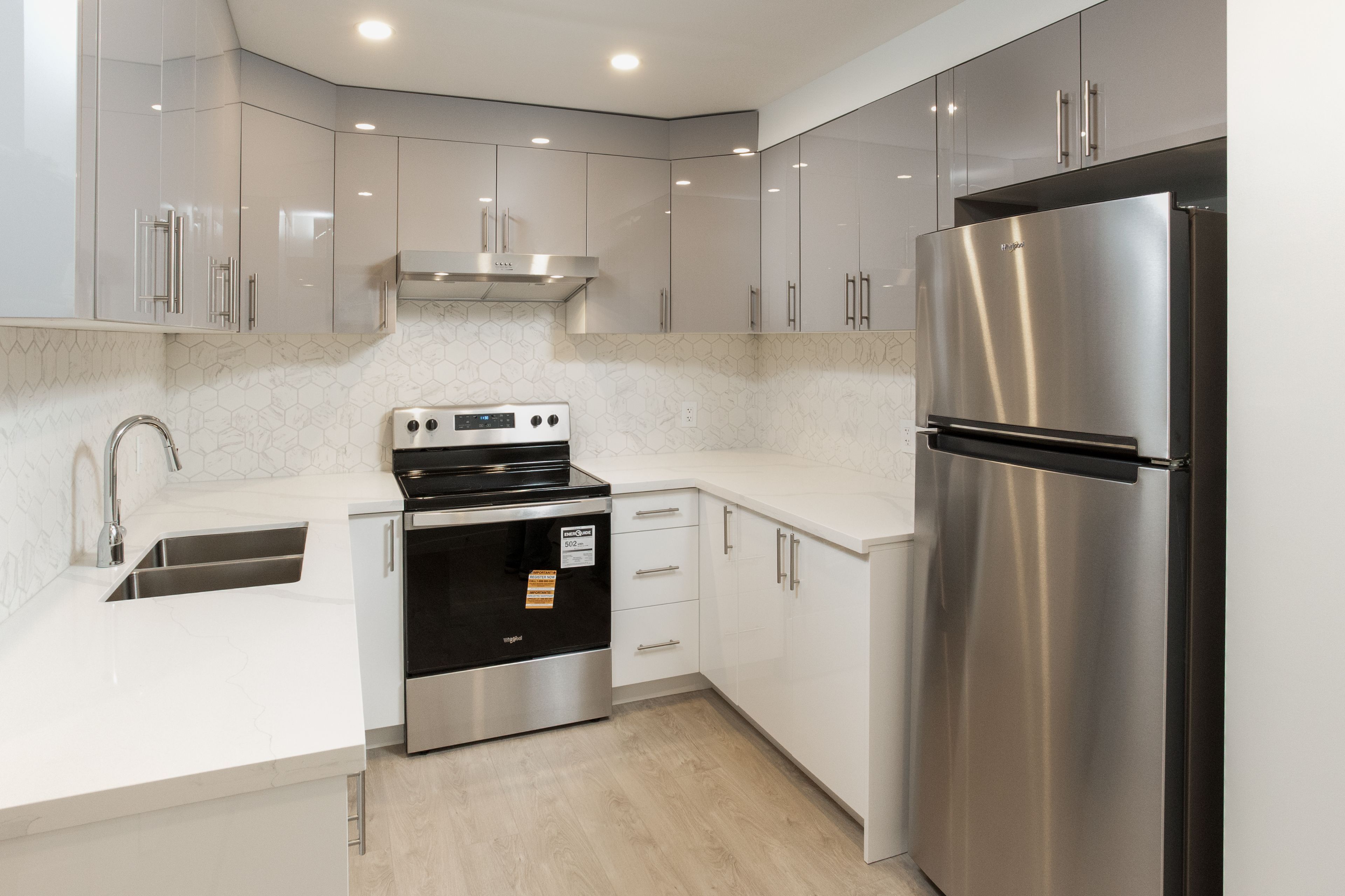 • Modern kitchen with stainless steel appliances and quartz countertops.