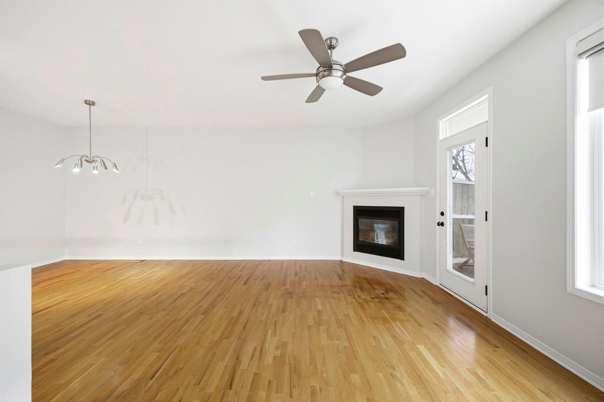 • Bright open-concept living/dining area with hardwood floors and a gas fireplace.