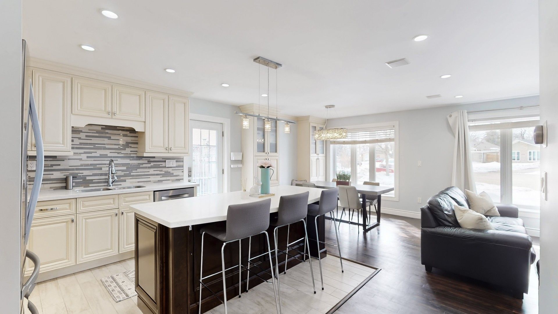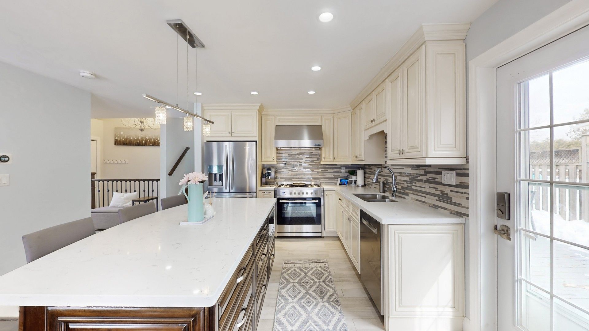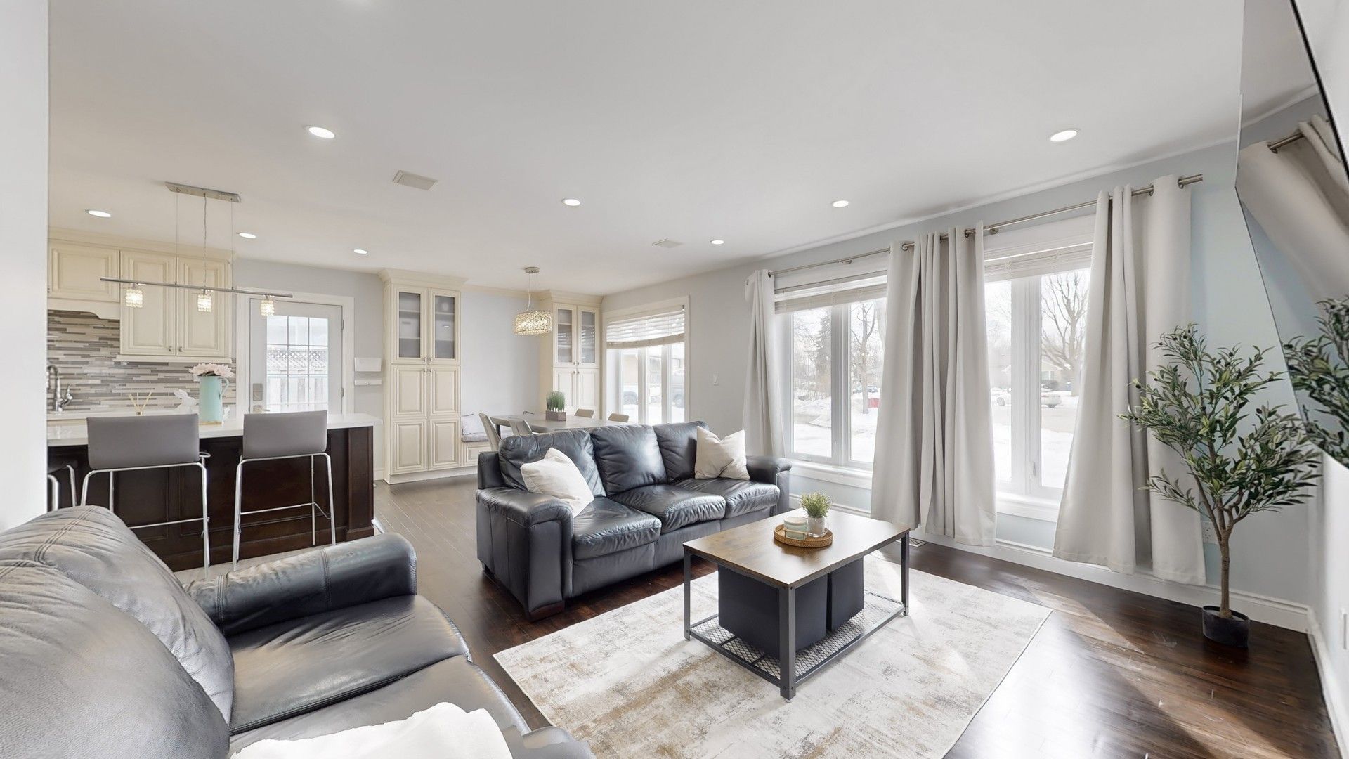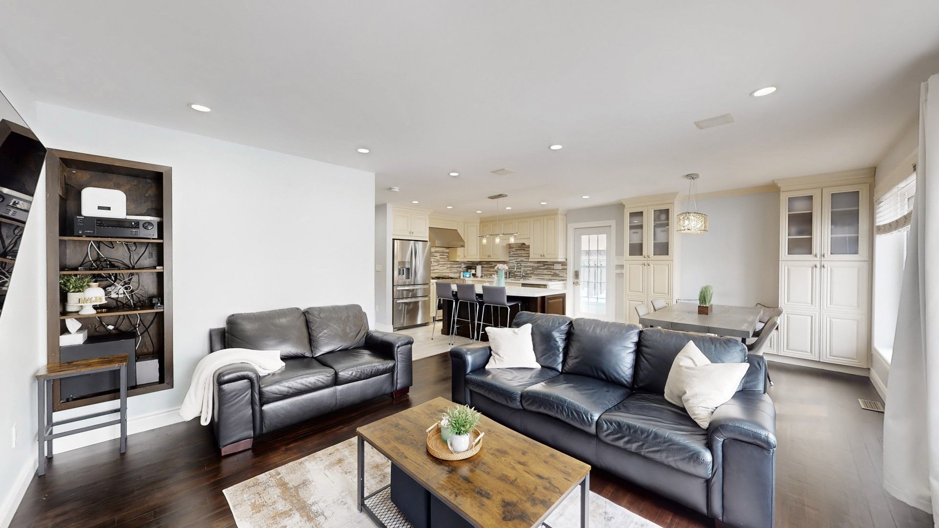 • Open-concept layout with sun-filled living spaces and built-in speakers.
