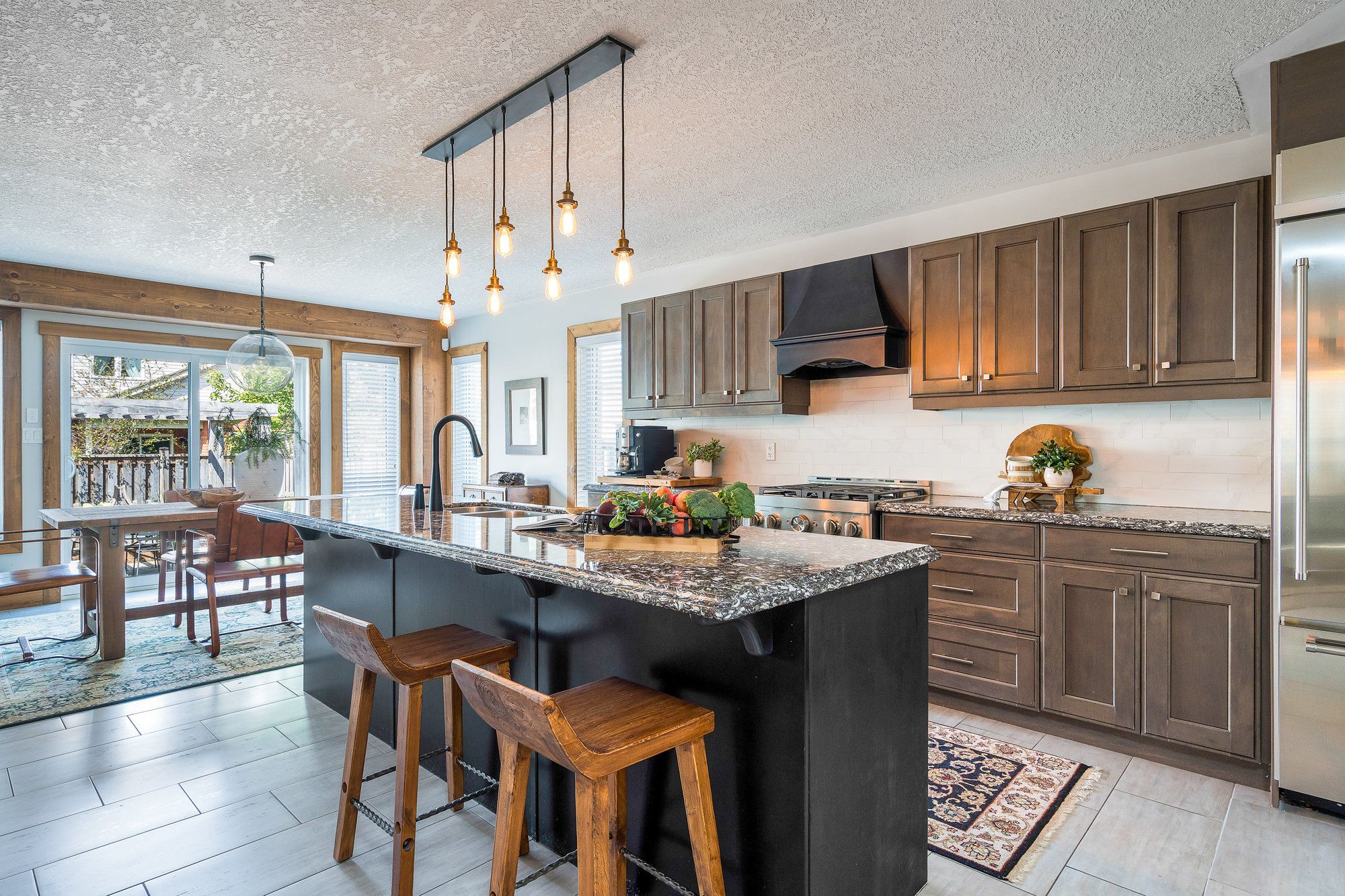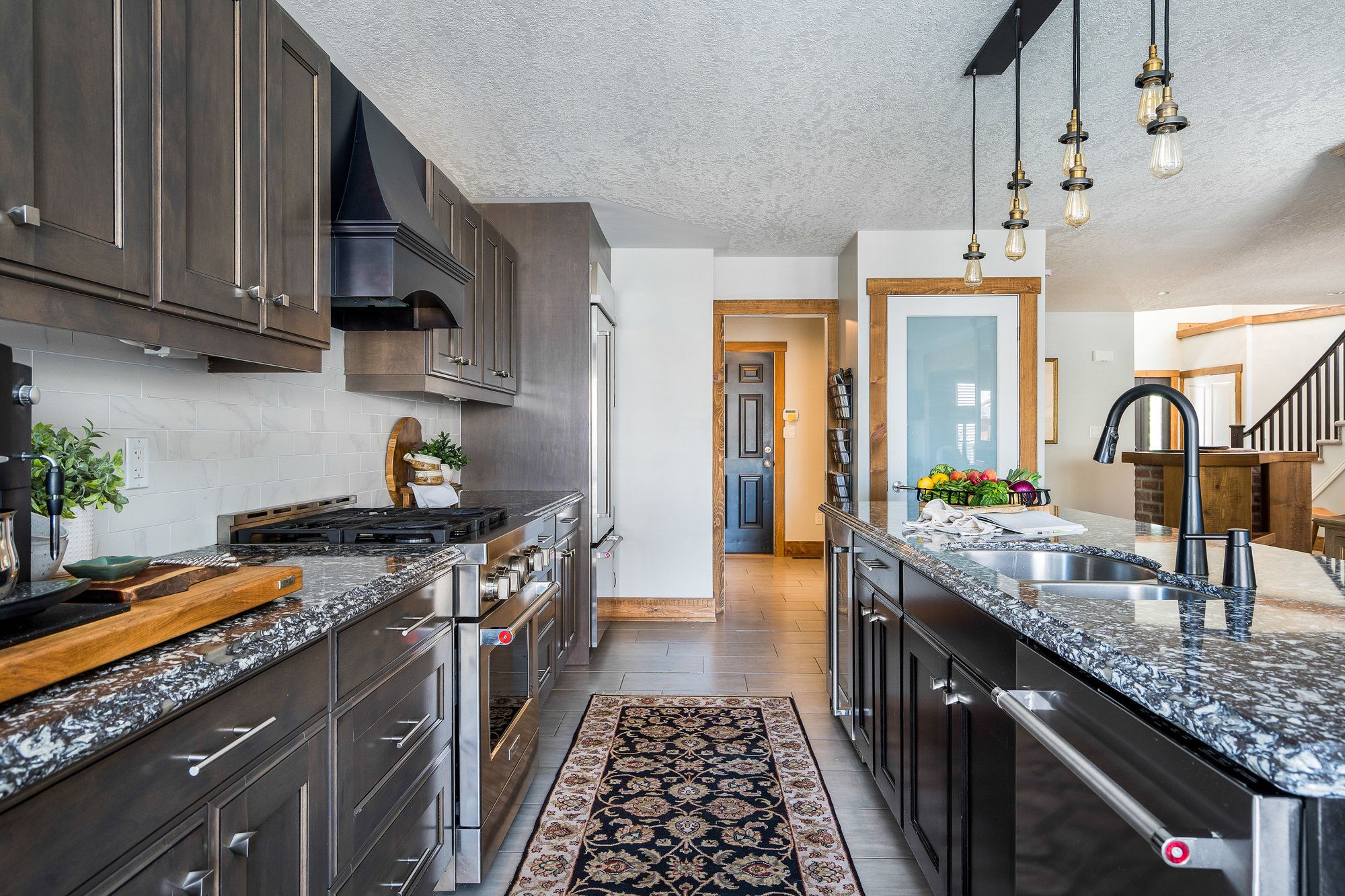 • Spacious kitchen with a large granite island and professional-grade appliances.