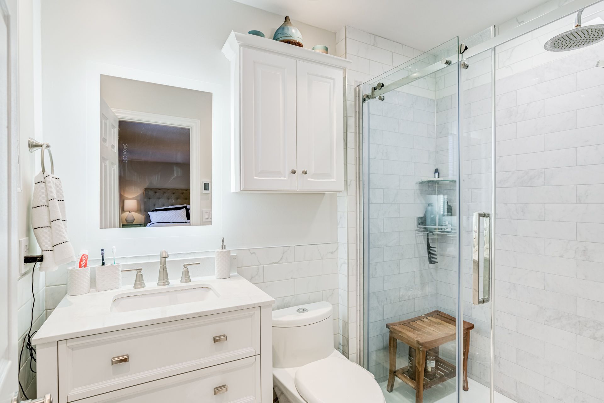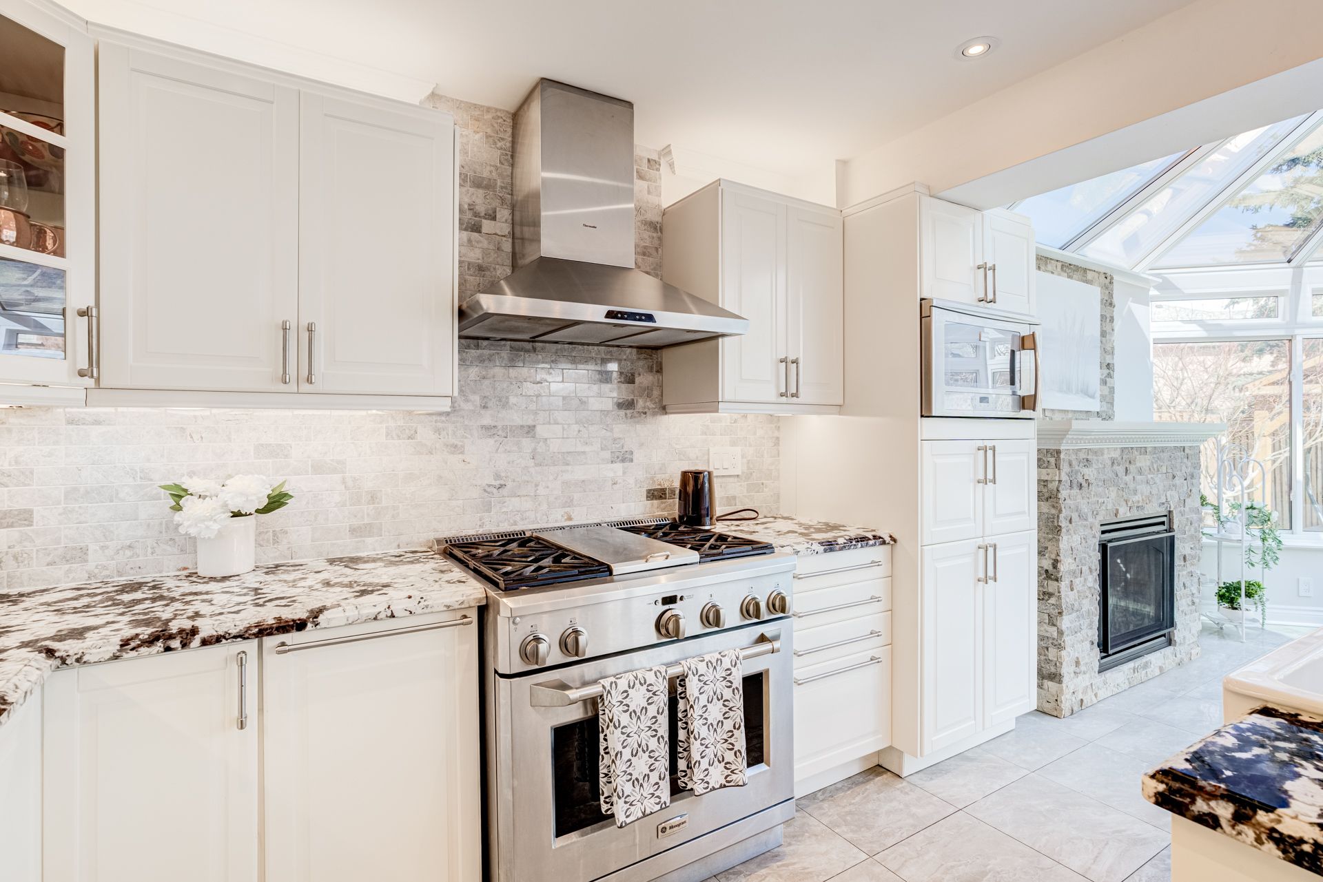 • Chef-inspired kitchen with custom cabinetry and stainless steel appliances.