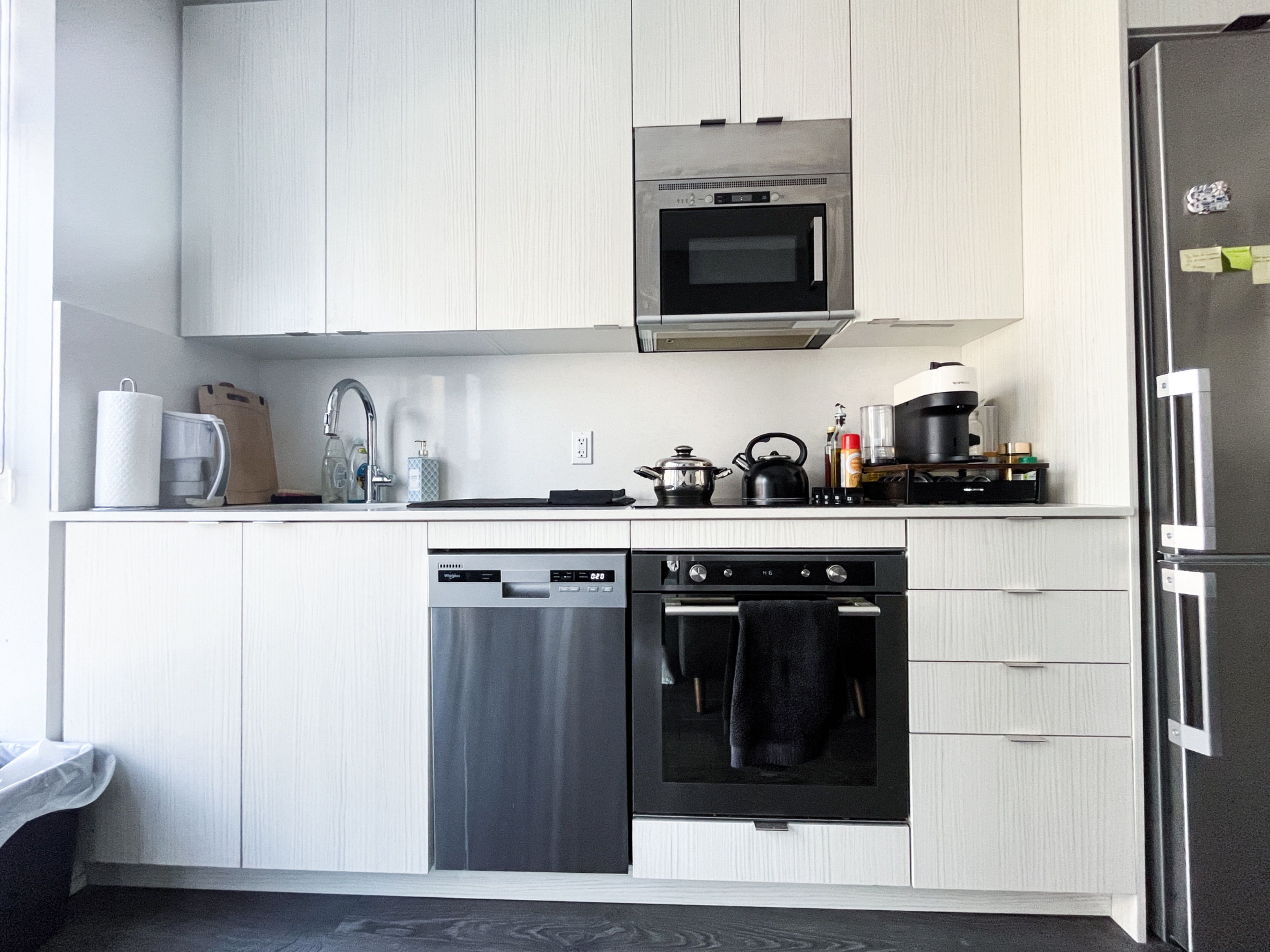 • Modern galley kitchen features stone countertops and stainless steel appliances.