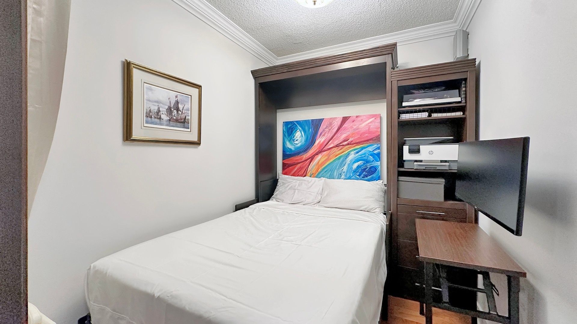 Rarely available sun-drenched southeast corner "02" suite at the prestigious harbour view estates, offering 1,268 sq ft of refined living with breathtaking floor-to-ceiling views of lake ontario, the iconic cn tower, & the vibrant toronto skyline. This expansive layout features 2 bedrooms, 2 full bathrooms, & a large enclosed den thoughtfully designed with built-in murphy bed & desk ideal as a third bedroom or private home office. The intelligently separated bedroom layout ensures maximum privacy for families. Elegant upgrades throughout include rich jatoba hardwood flooring, hunter douglas blinds, custom elfa closet systems, built-in wired sound system, pot lights, & newly updated bathroom vanities. The chef-inspired kitchen is equipped w/brand new premium café ss appliances, including a dual-fuel, dual-oven range, refrigerator with ice & water, and convection microwave. Additional features include miele dishwasher, wine fridge, & stacked washer/dryer. Enjoy the convenience of included parking & locker, plus ample visitor parking, car wash station, & 4 rentable guest suites. All-inclusive maintenance fees cover utilities & provide access to the renowned 30,000 sq ft, three-level superclub featuring a 25m indoor pool, full gymnasium, state-of-the-art fitness centre, tennis & squash courts, spin studio, theatre, bowling lanes, sauna, jacuzzi, bbq area, children's play spaces, dog park, & rooftop party room. Unbeatable waterfront location just steps to water taxis to the toronto islands, rogers centre, scotiabank arena, ripley's aquarium of canada, & the vibrant king west district. Walk to union station, the financial district, & enjoy seamless access to transit including the spadina streetcar, up express, go transit, & via rail. Minutes to billy bishop toronto city airport and connected pathways including the path and waterfront bike trails. With an exceptional walk score of 96, this residence offers unmatched urban convenience alongside luxury waterfront living.
