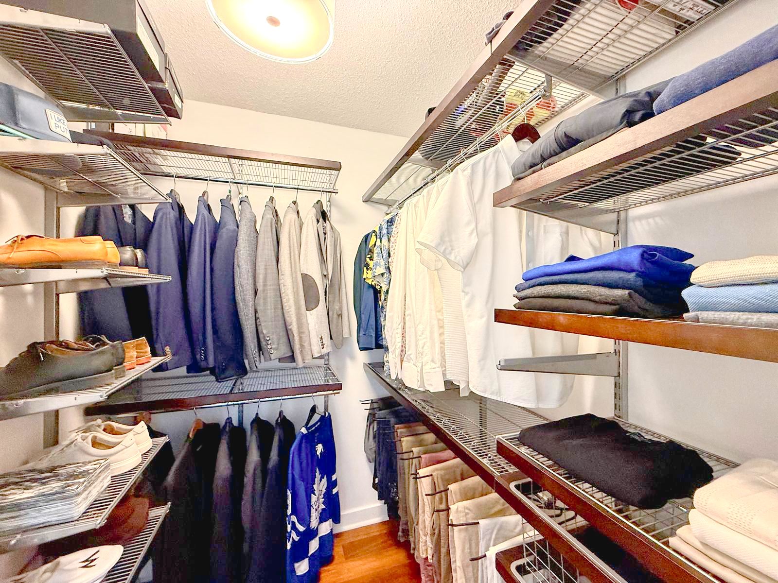 • Elegant upgrades include hardwood flooring, custom closets, and a wired sound system.