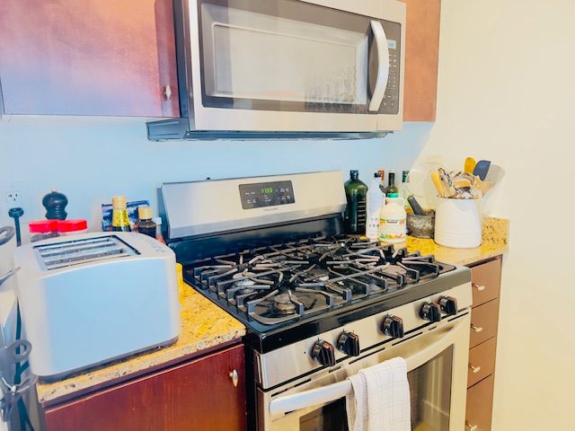 • Modern kitchen with granite countertops and stainless steel appliances.